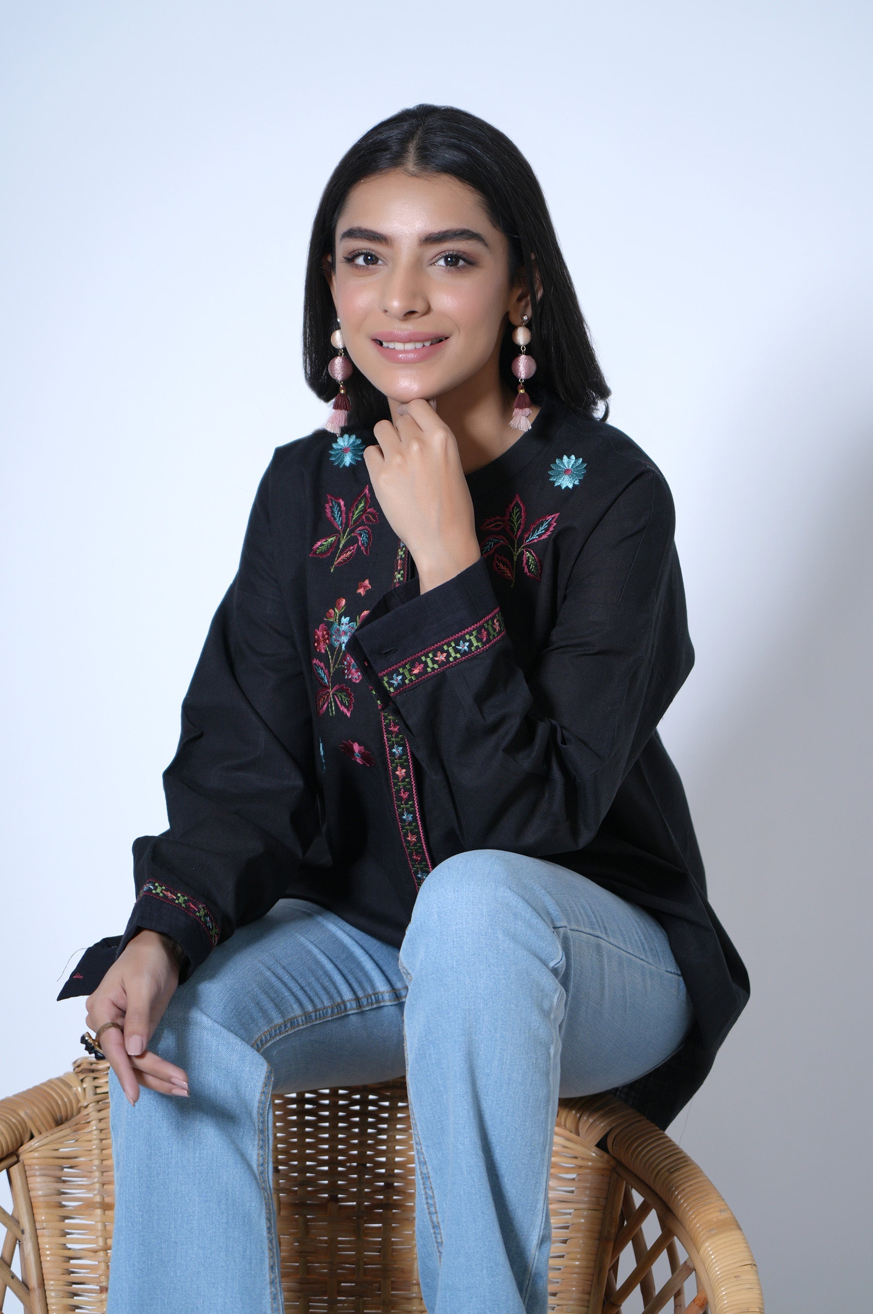 A relaxed style cotton slub drop shoulder top designed with botanical flowers on the front and back with a minimal floral border on the sleeves and placket exhibiting modern elegance. Style the top with any denim pants for a stylish look.