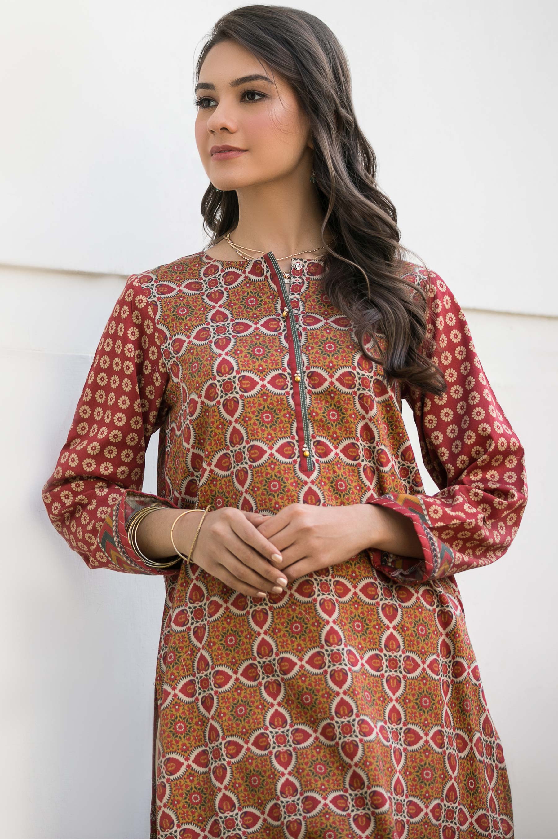 Digital Printed Cotton Satin Shirt, Pearl & Beads for Embellishment