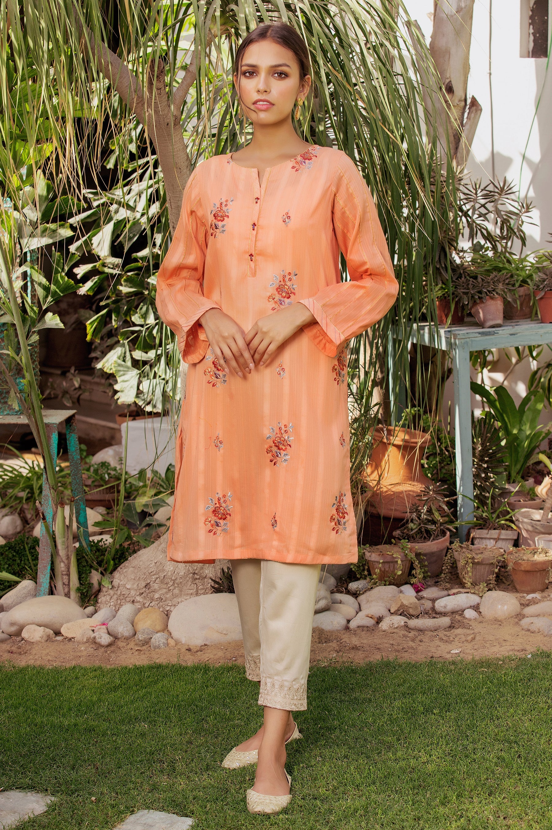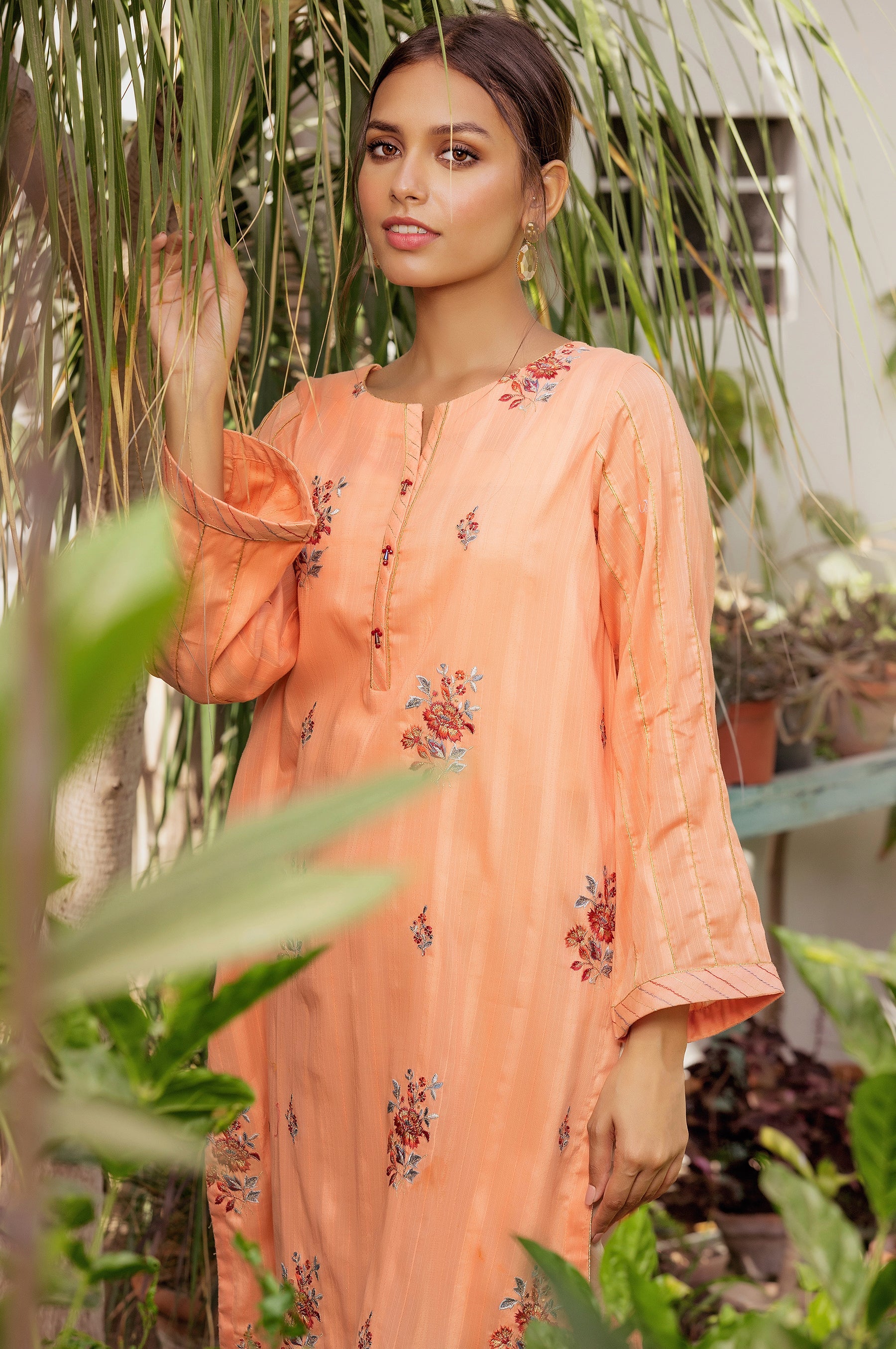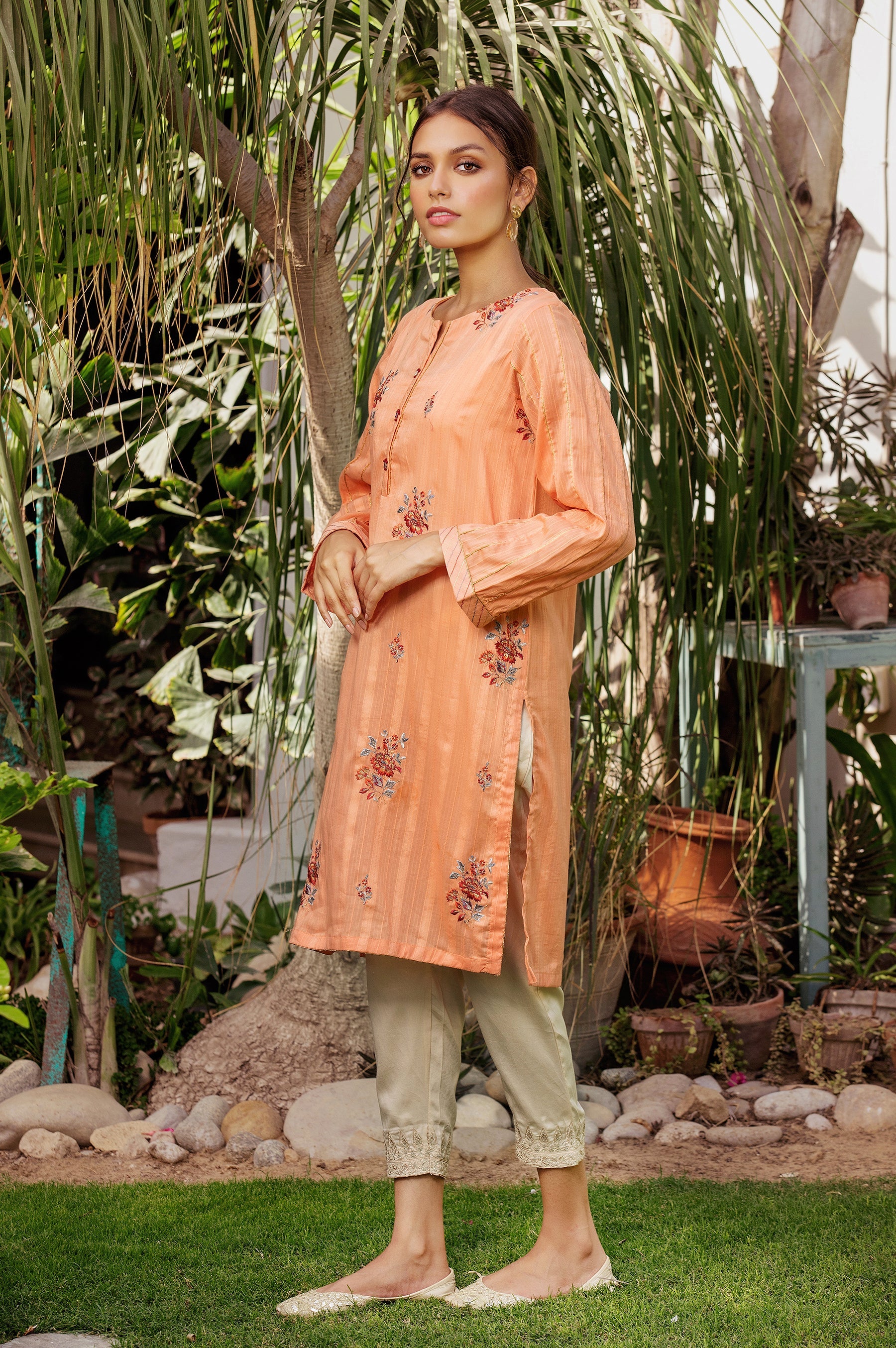 This Eid step in and flaunt wearing this beautifully embroidered peach tarkashi shirt which has floral motifs all over, sleeves are stylized with gold charma and a hint of color on hem. Go solo or pair it up with Zari dupatta.