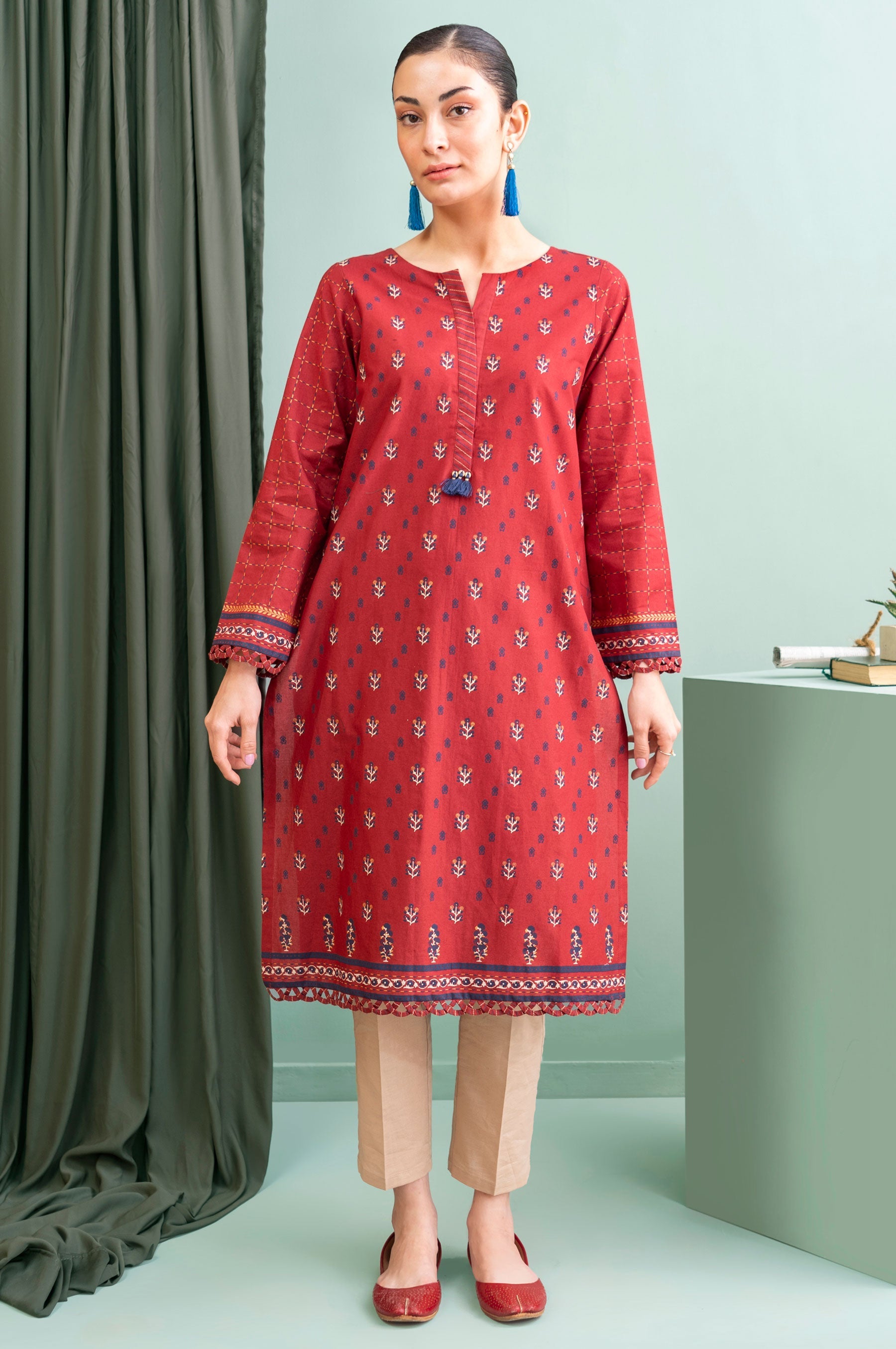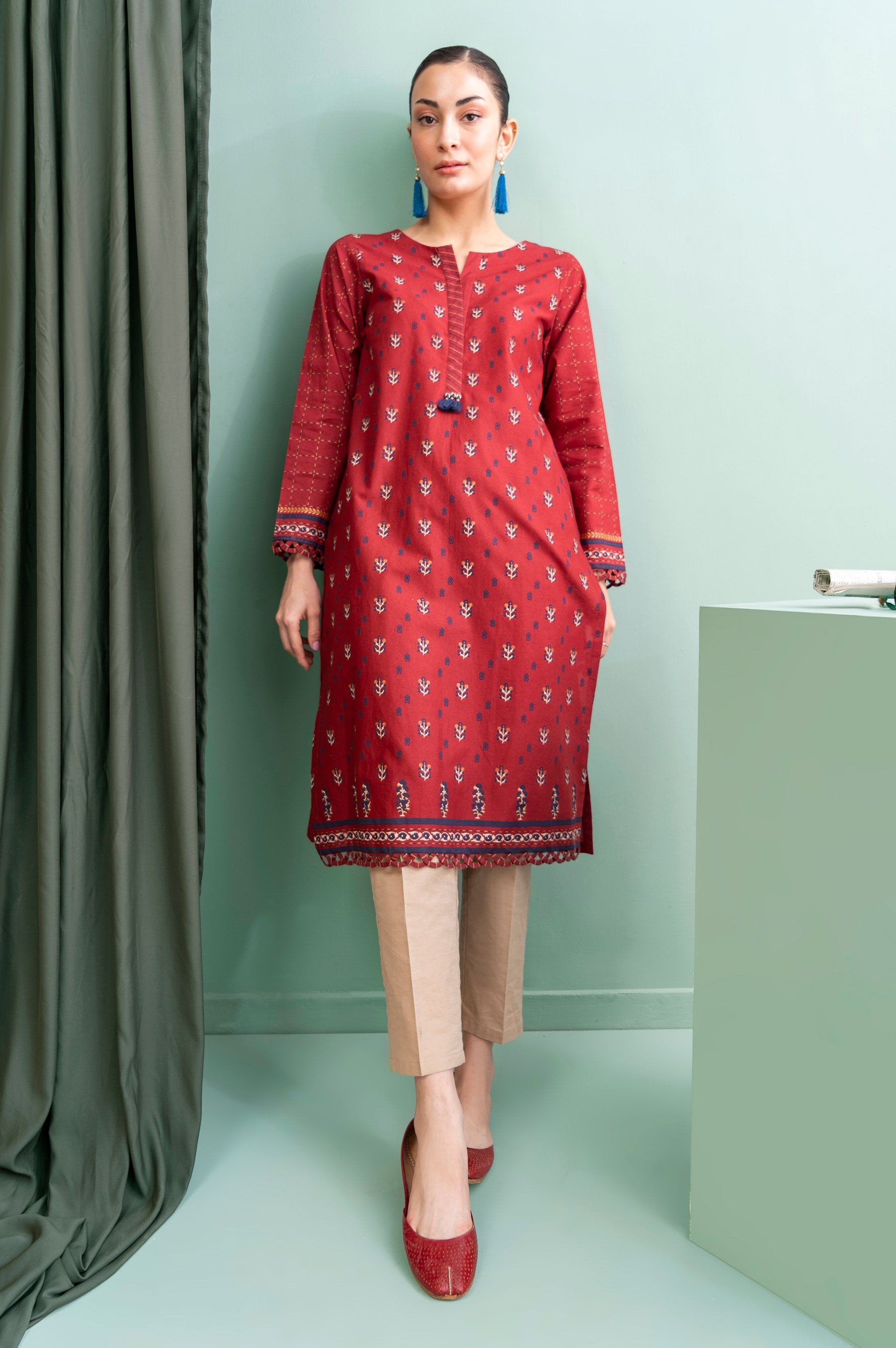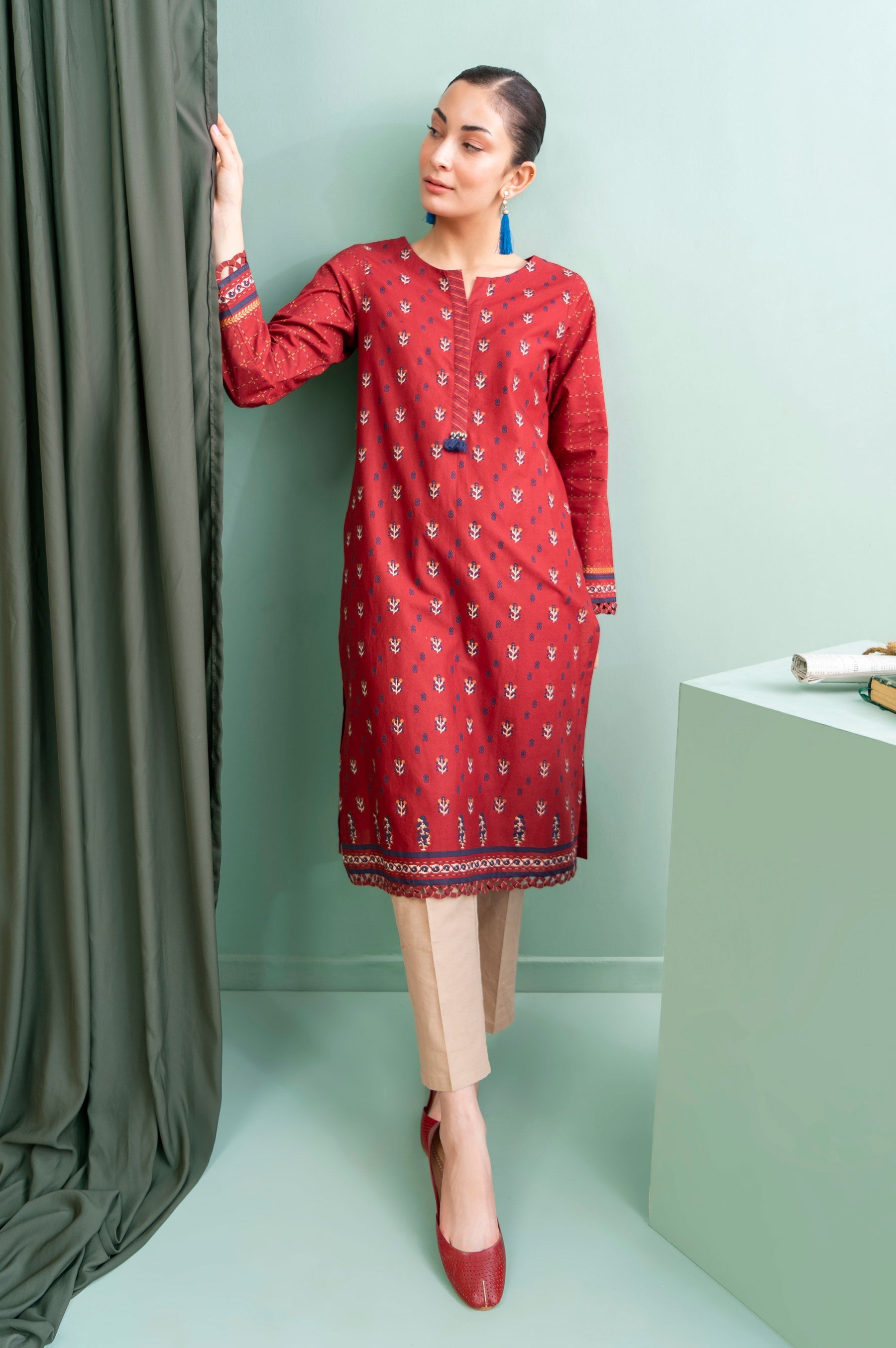 This one piece casual shirt has a fusion of botanical and geometric patterns screen-printed on the front and sleeves with running stich details on neckline, placket and tassel details, flaunt this maroon shirt to your friends.