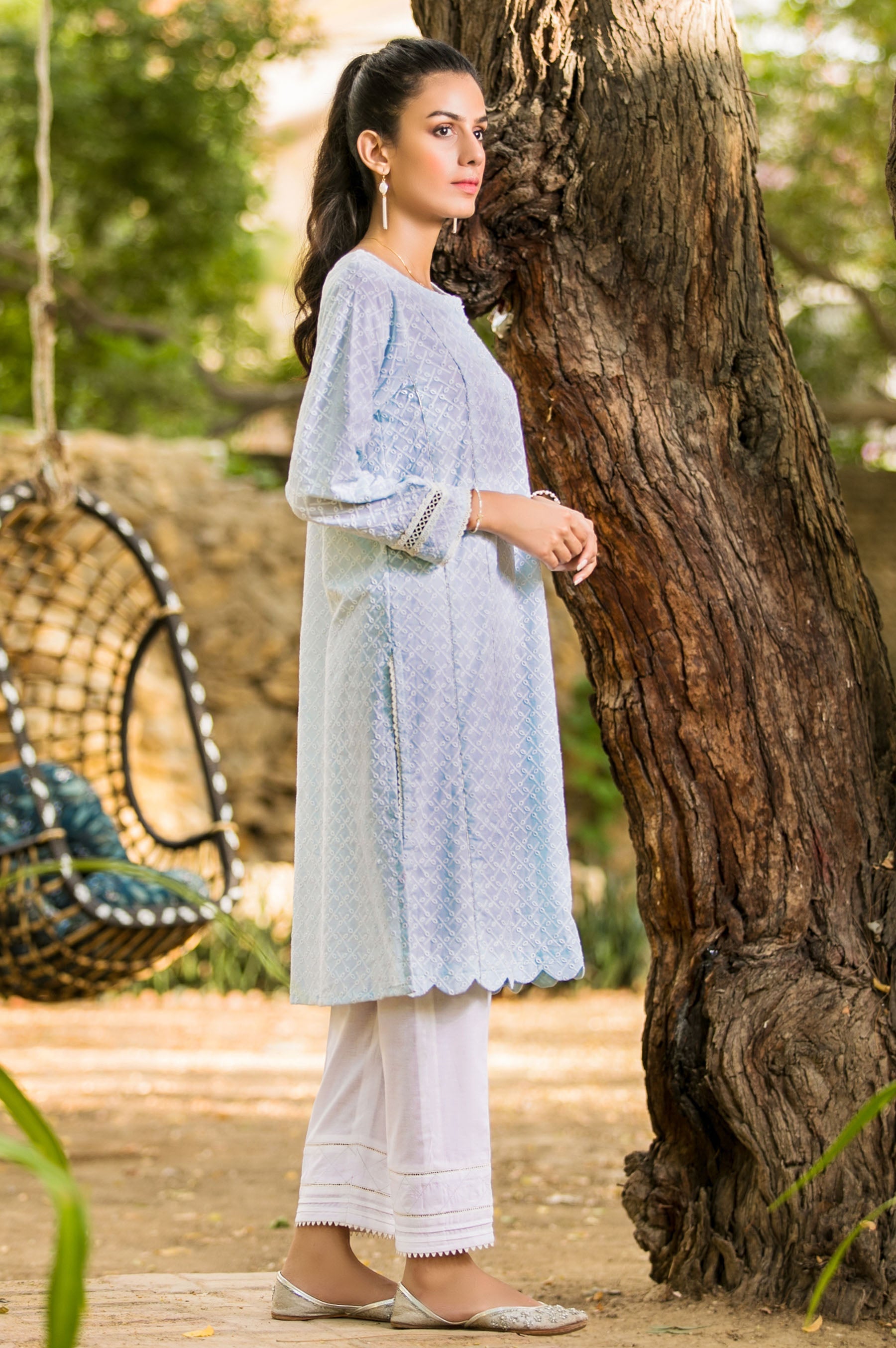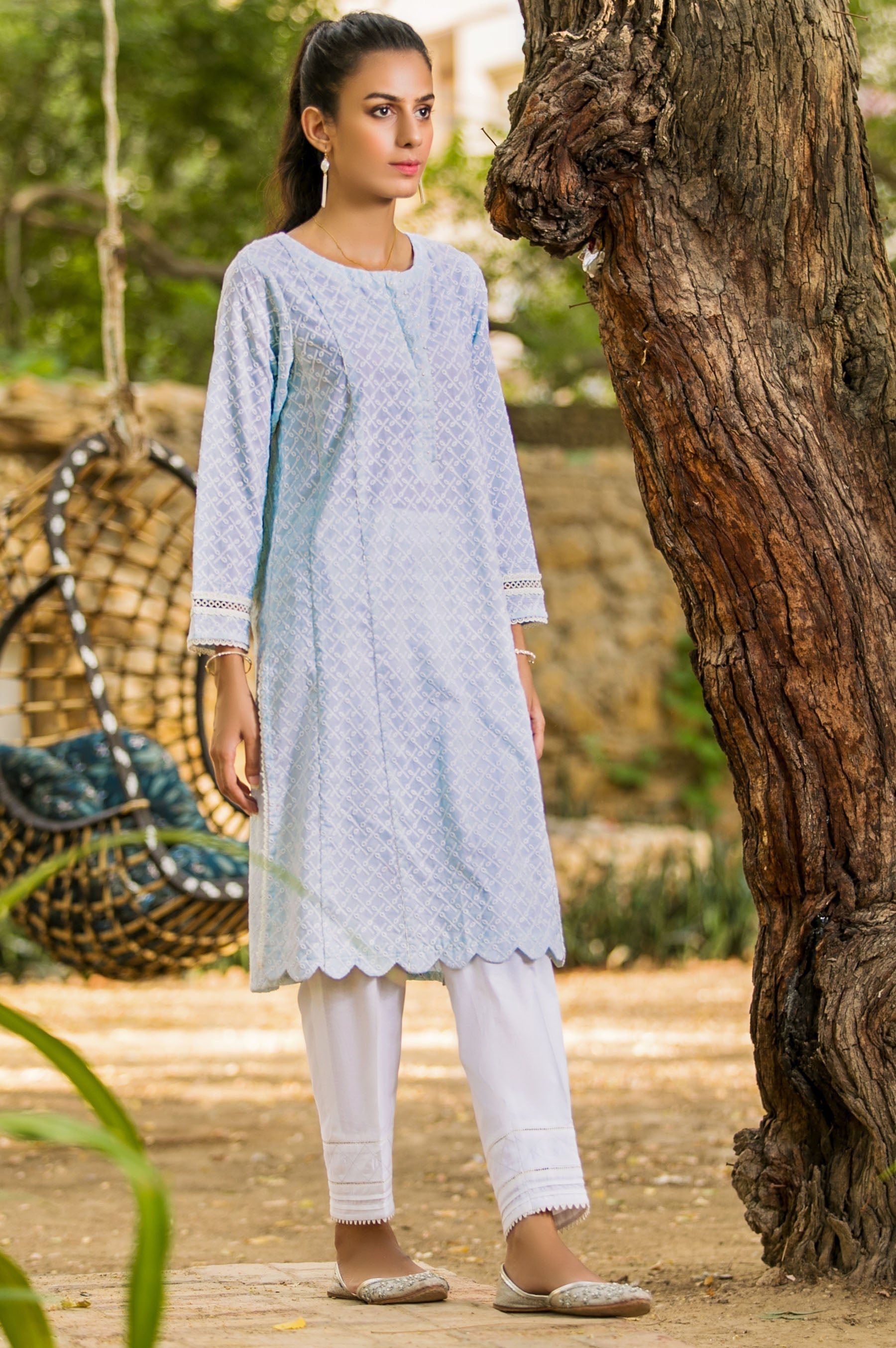 A Sophisticated yet stylish chikankari paneled kurta, finished with dainty ivory laces on sleeves and side slits featuring a straight silhouette. Scalloped hemline adds another style element.