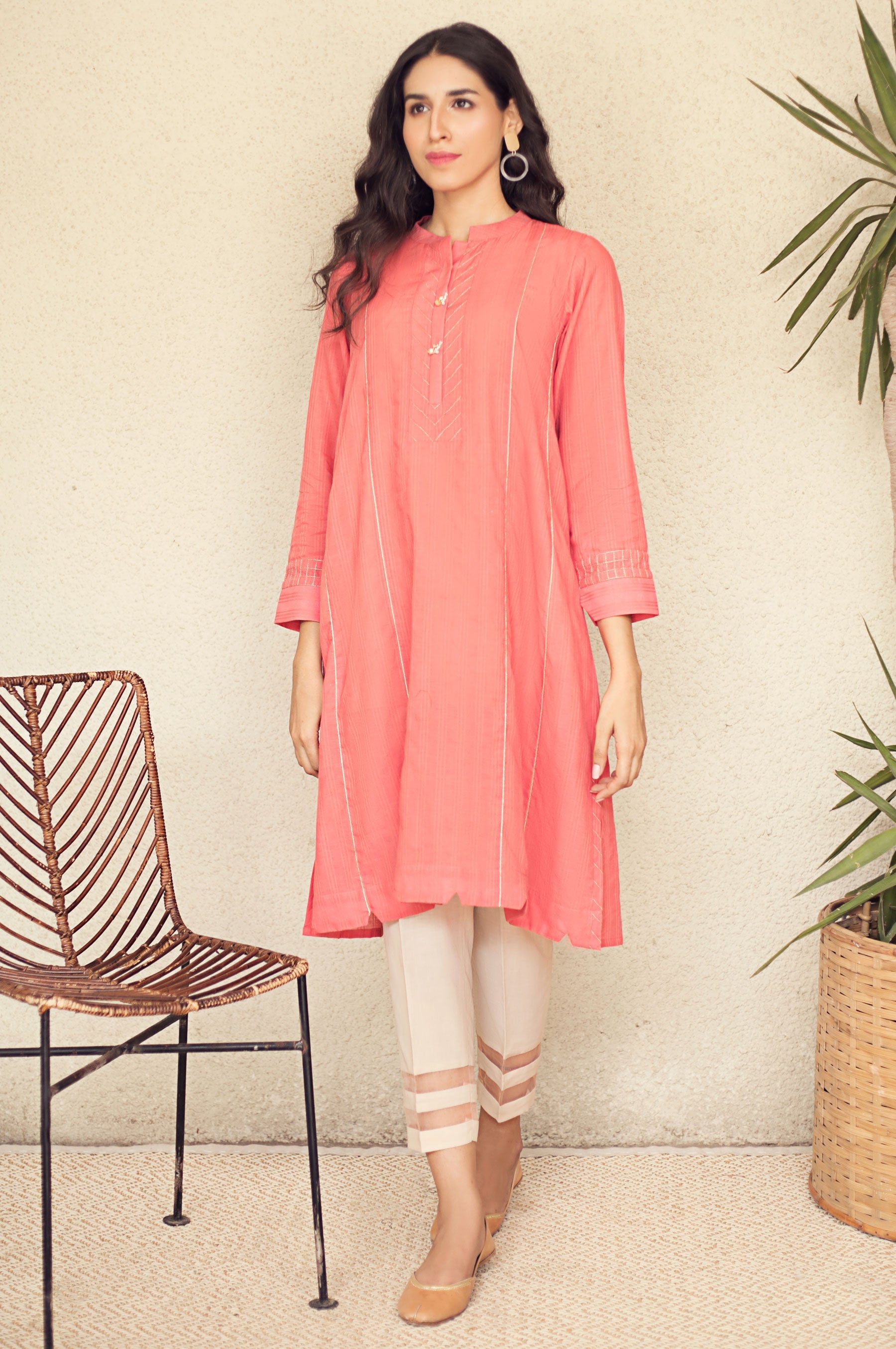 Dazzle your evening parties with this Coral flowy A-line kurta with multiple panels. Zari lace insertions in each panel and the zari stitches at neckline and sleeves have enhanced the gorgeous piece. An exquisite pair of pearl and crystal buttons on the neckline gives you endless ways to style the elegant kurta.