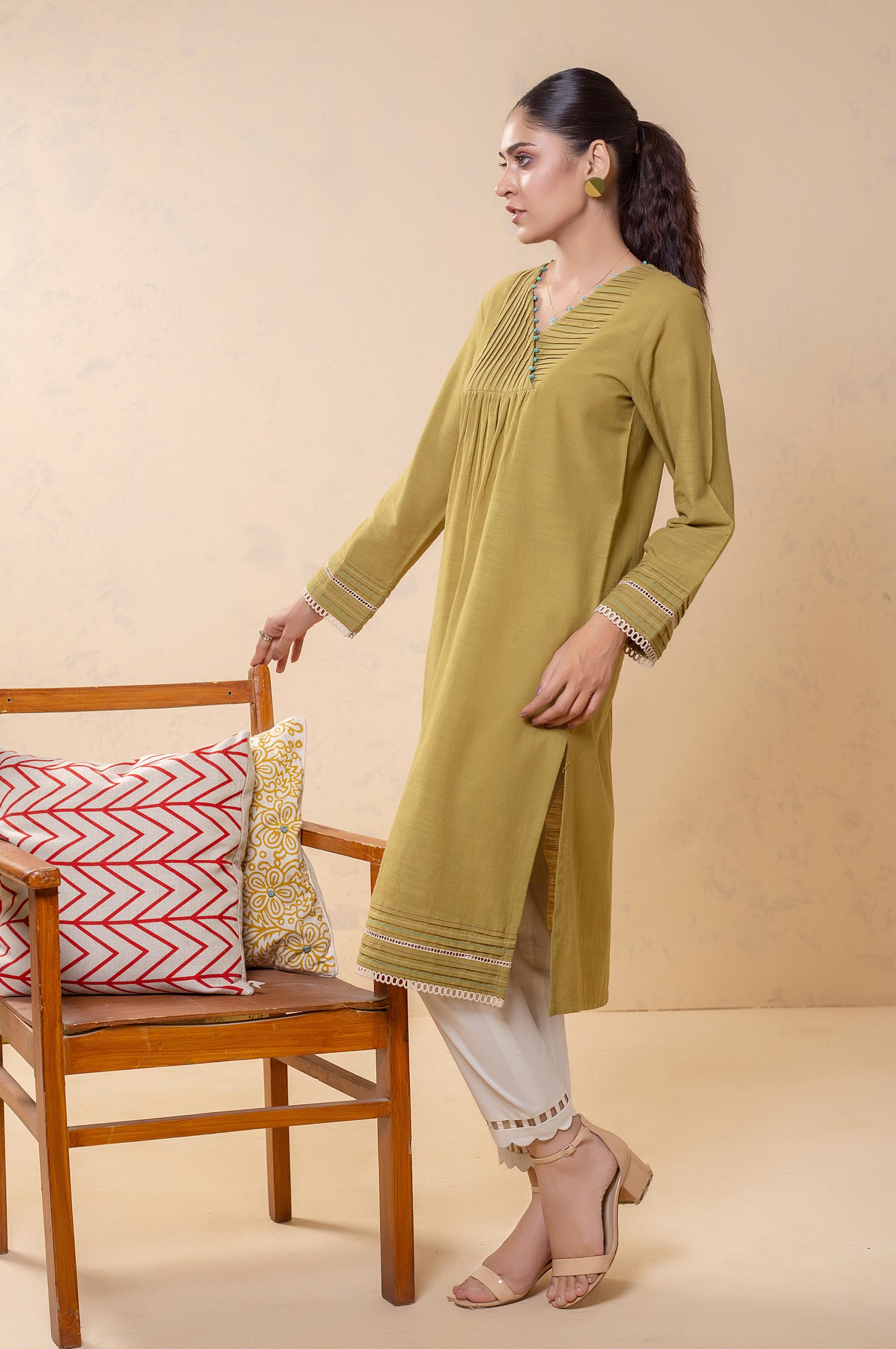 A loose fitted 1pc khaddar Embellished shirt with V-neckline enhance with combination of laces and colored stiches. The pleats and gathers on the shirt will take your style game to the next level.