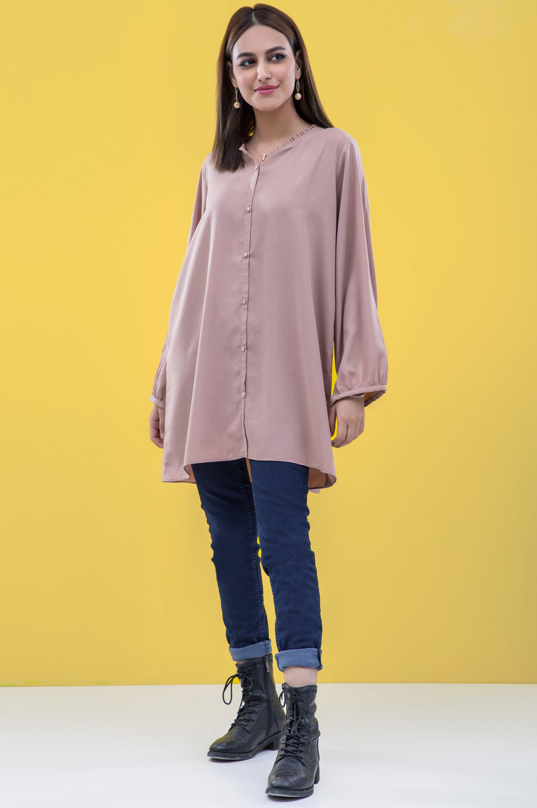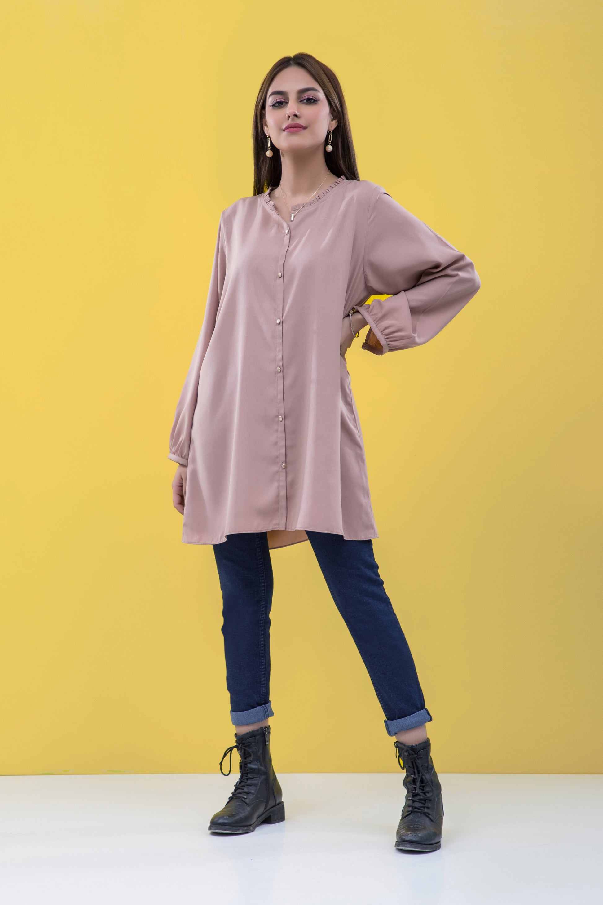 This soft pink button down top has a ruffled neckline and metallic gold buttons.