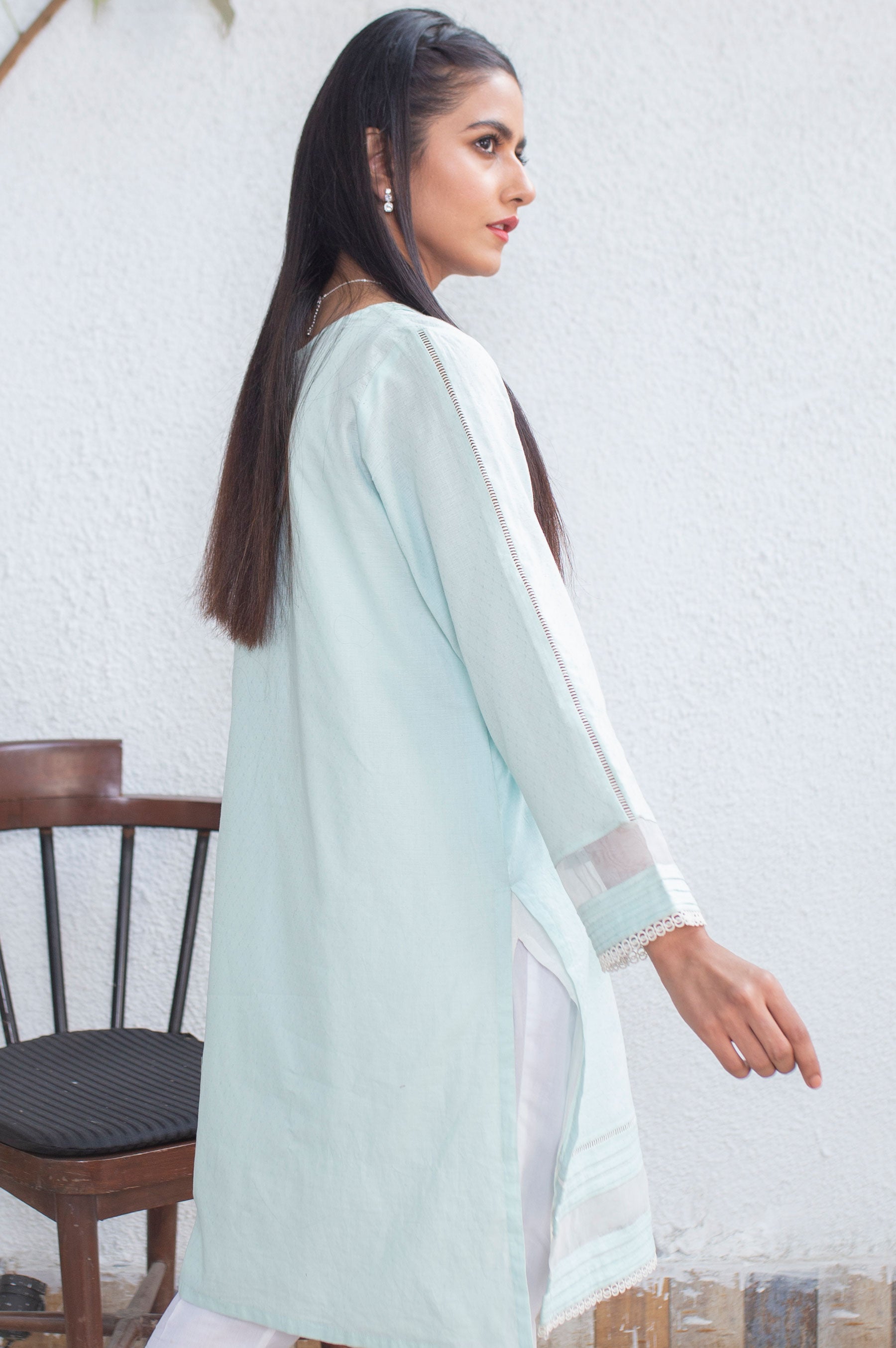 This summer be ready to sparkle in our pastel blue kurta featuring pleated neckline with a mix of zari stitch detail with pearl embellishment on the neckline. Sleeves are stylised with a mix of laces with organza and pleats. Hemline is worked on with a mix of laces and pleats stylised with organza.