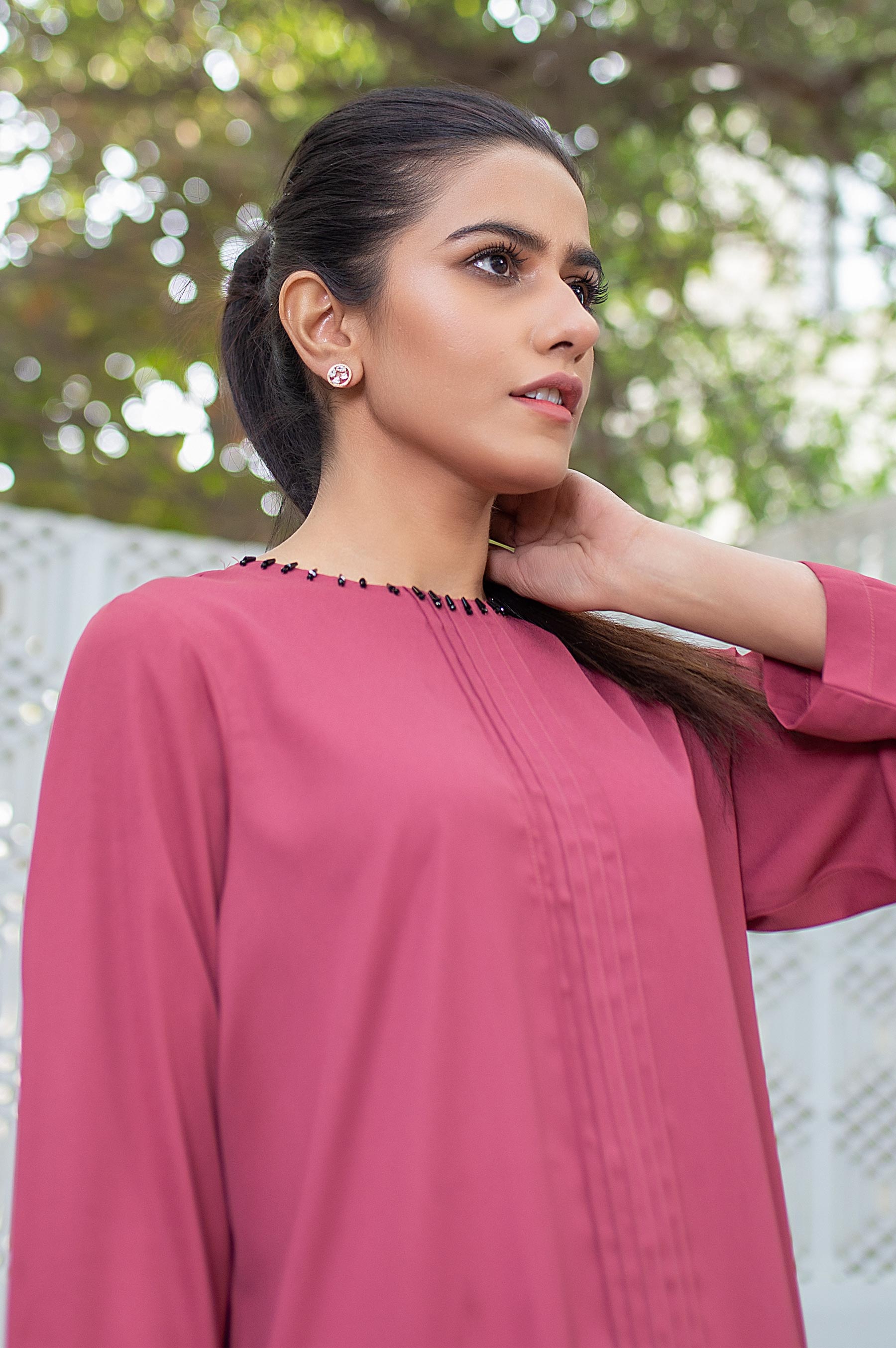 This mauve top is a classic add to your wardrobe, styled with pin tucks and minimal embellishment. Add straight pants to complete the look.