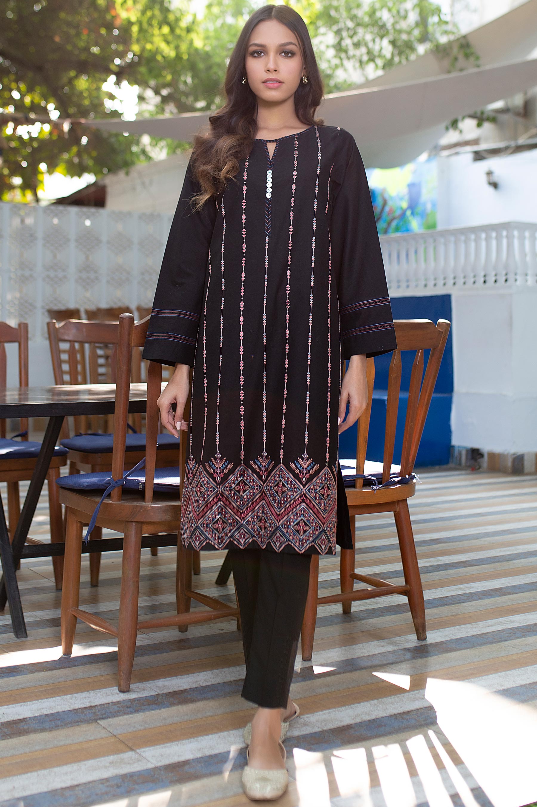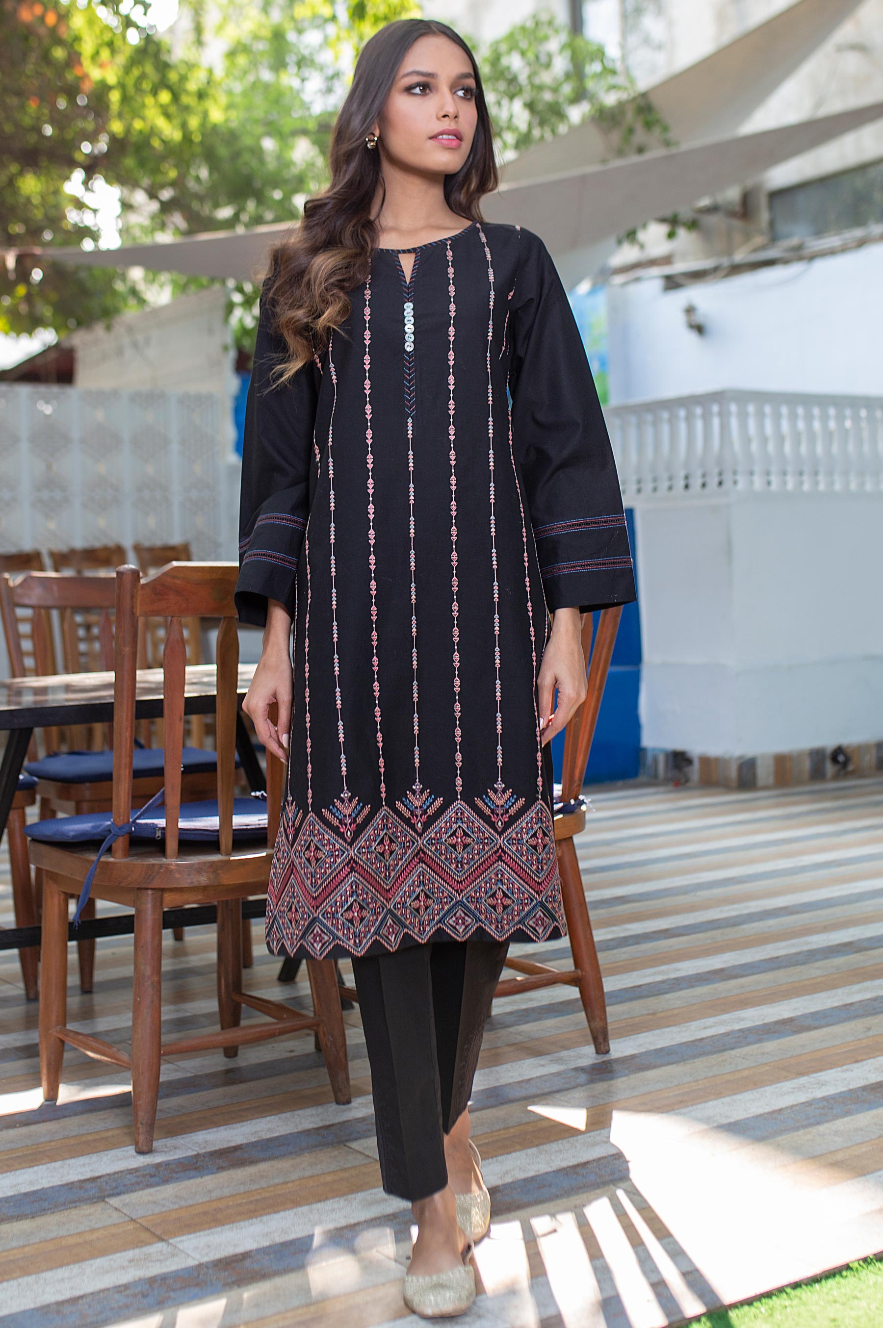 Inspired by tribal embroidery this classic black kurta has colourful embroidery all over. The embellishment on the neckline and laces on the sleeves adds a little excitement to the kurta. .