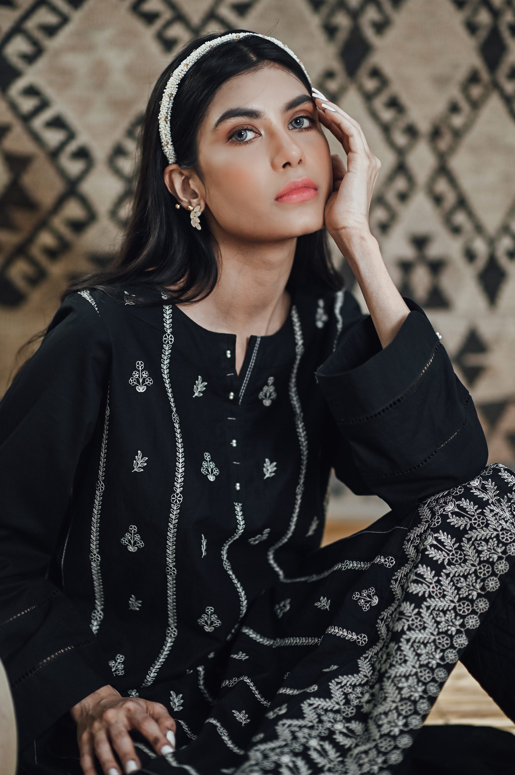 Crisp Black shirt adorned with embroidery on front, lace detailing on sleeves and embellishment on neck. Pair it up with Zeen's Bottoms.