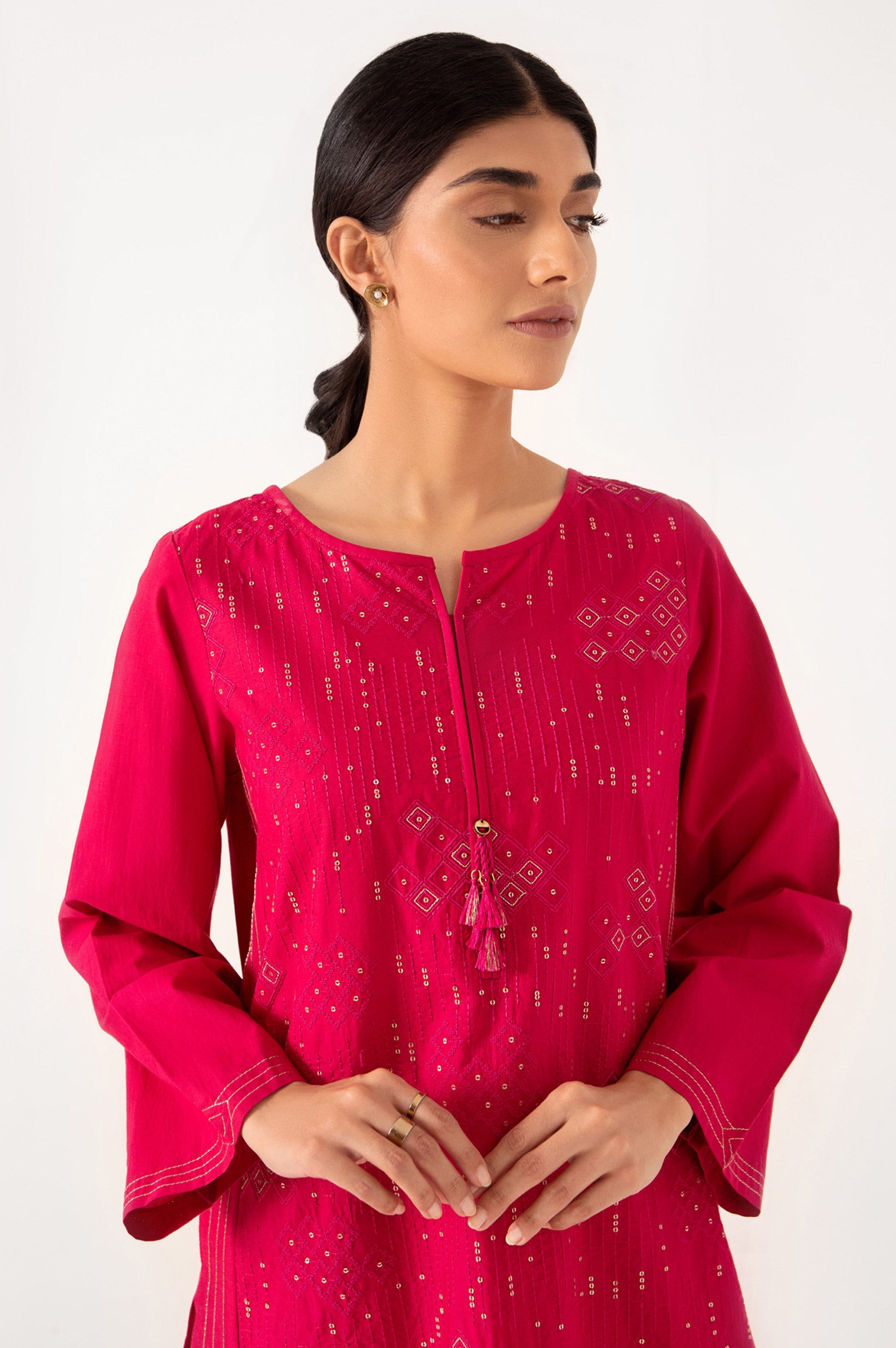 One color tone are the new trend.Be sure to be on trend at any event with this bright Fushia pink kurta composed with stunning geometric pattern embroidery highlighted with dull golden sequins.This is sure to be season favorite.