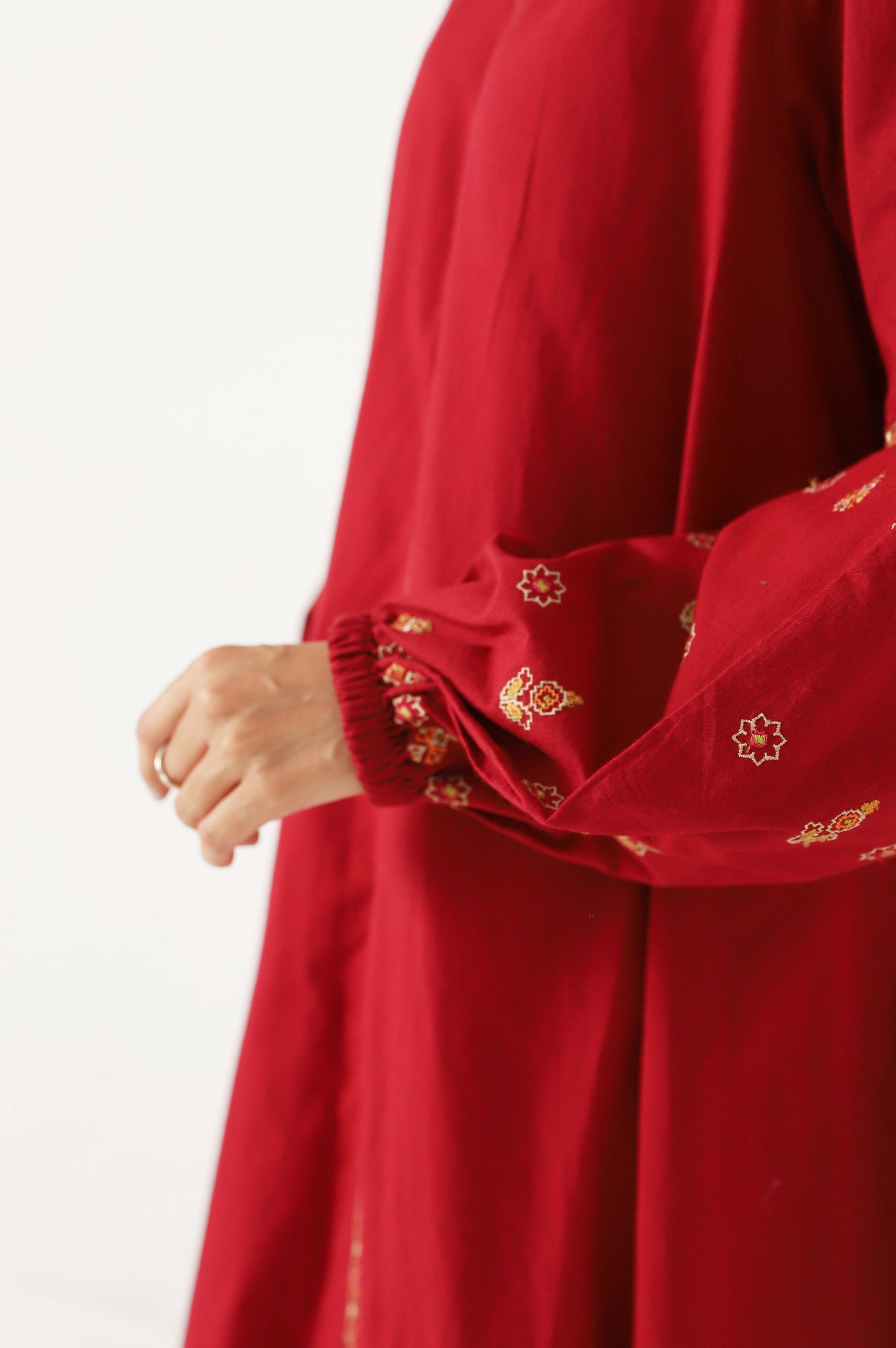 Be stylish from head to toe in this red summery dress with a contemporary floral embroidery on the sleeves and front placket. Flaunt your red dress and stand out this season.