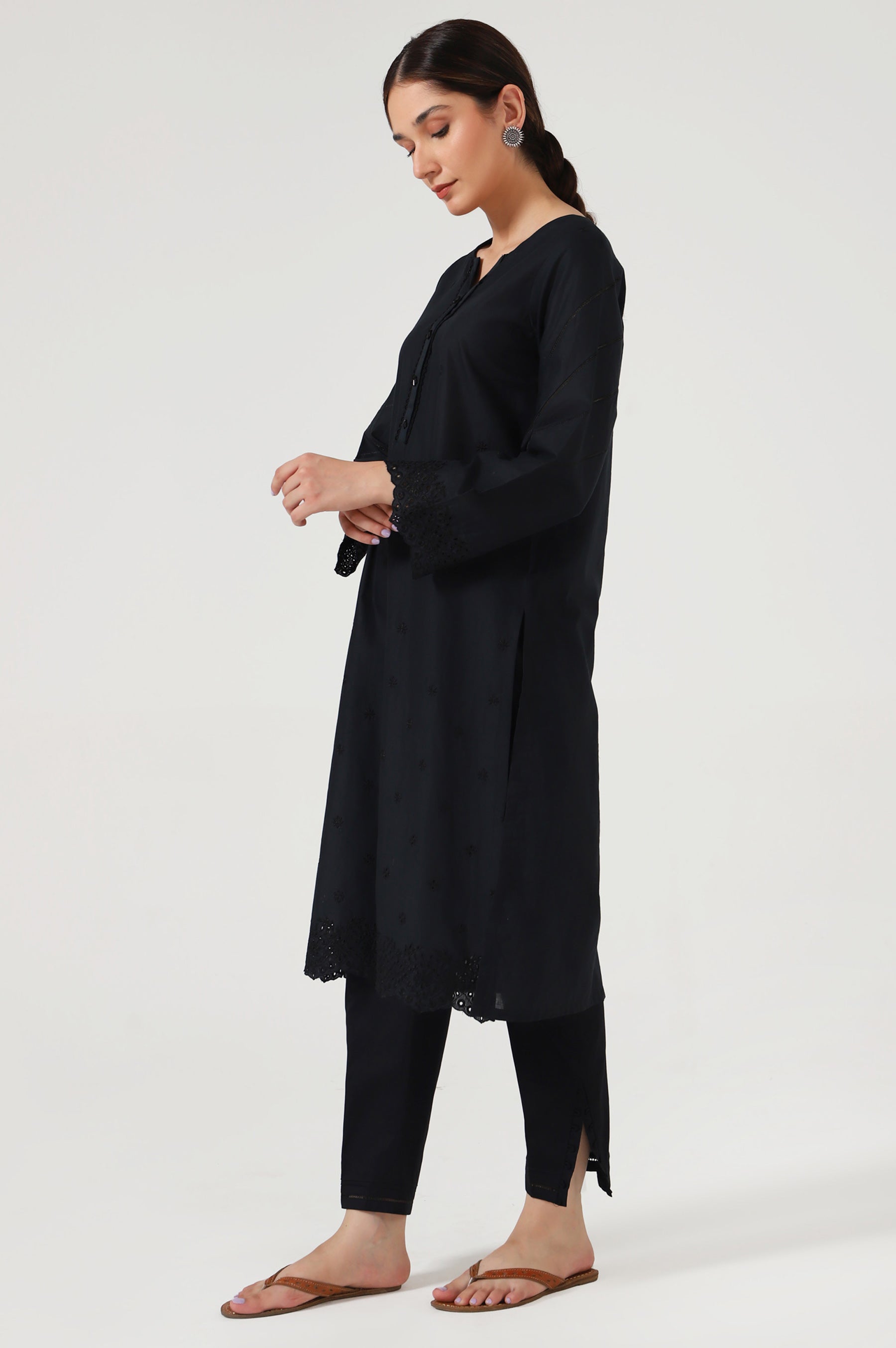 This Black cambric shirt exudes understated elegance thoughtfully crafted using different embroidery technique with scallop details on hem and on sleeves. Pair it with black trouser to complete the look.