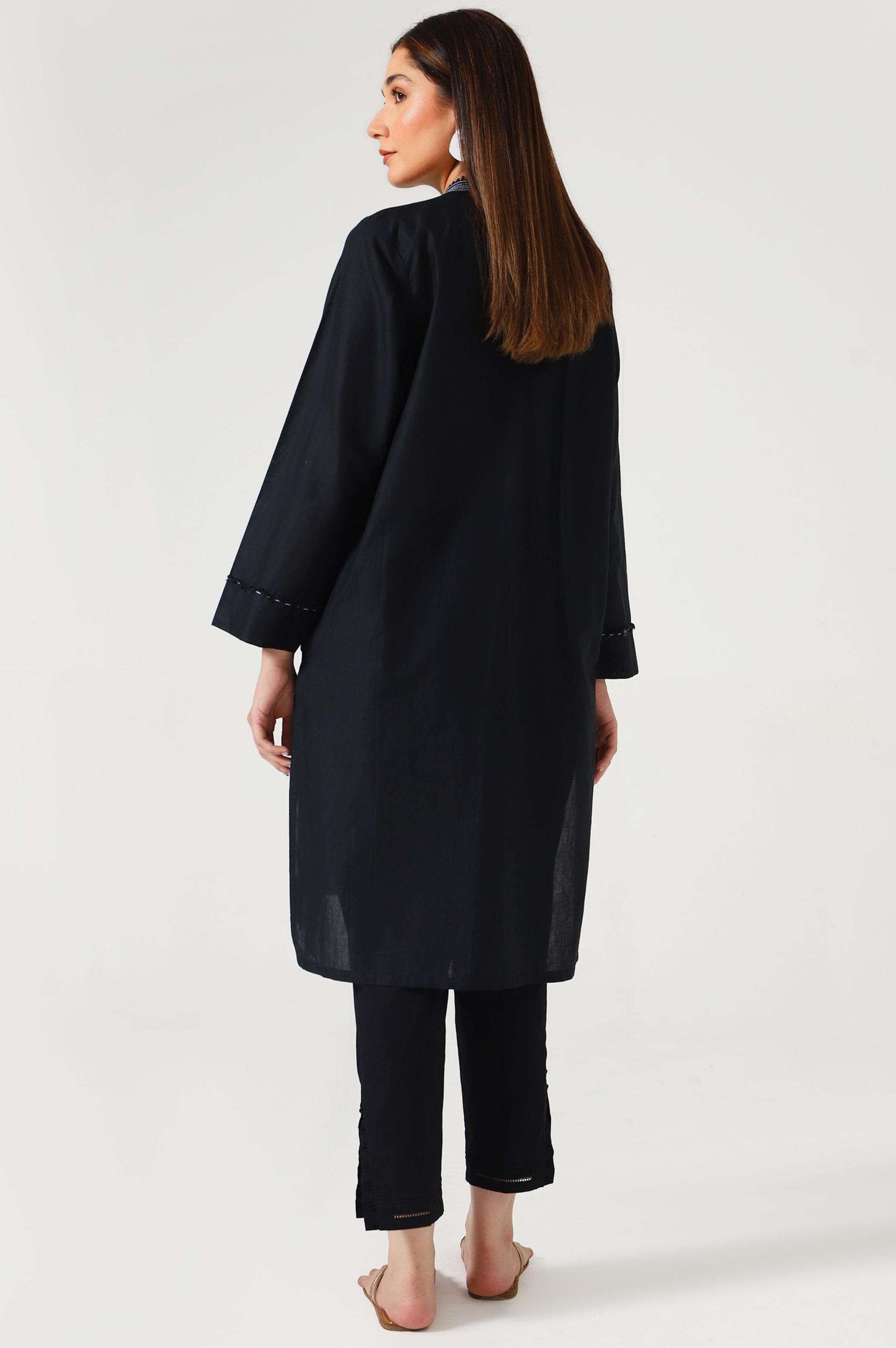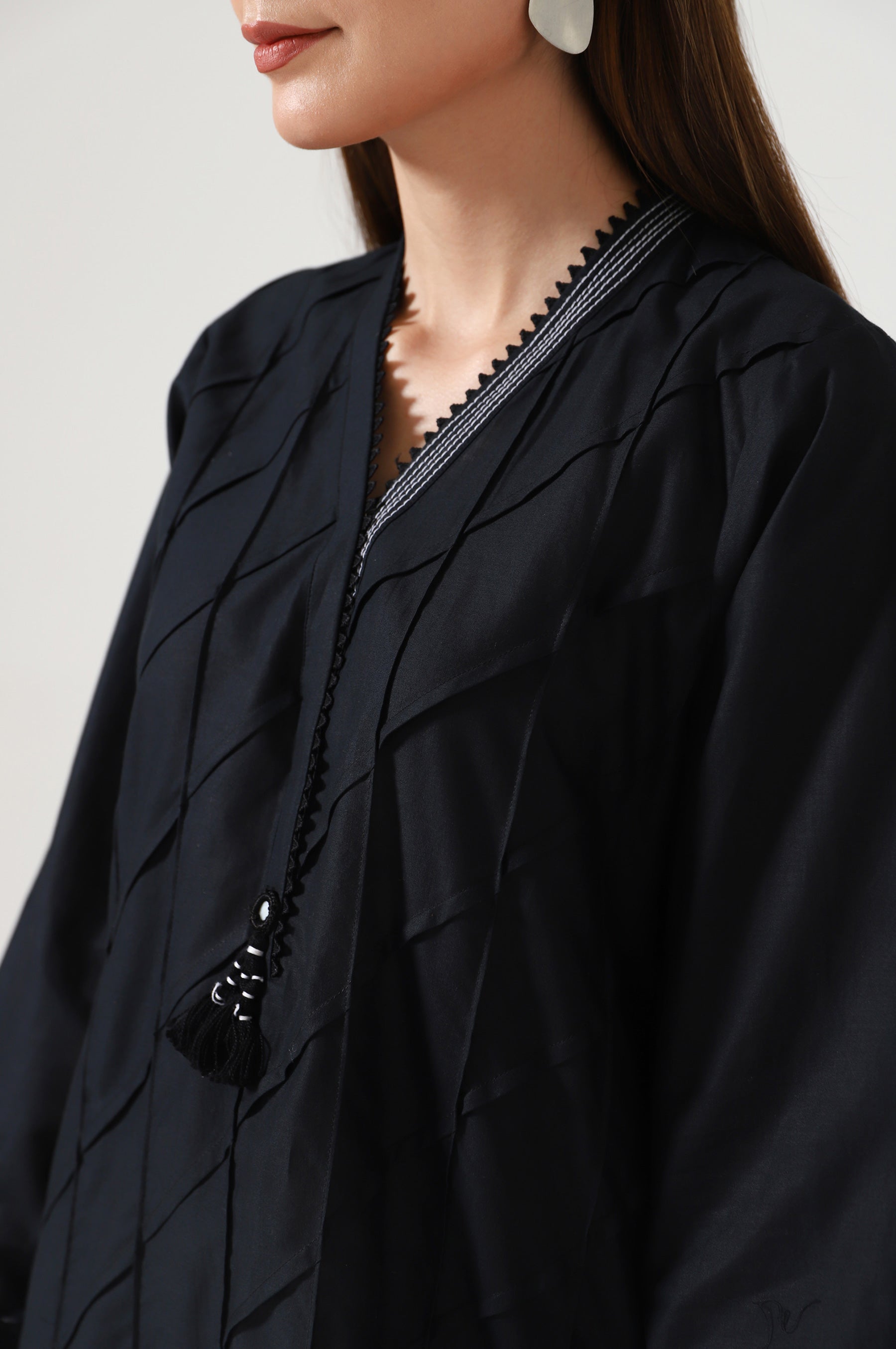 Refresh your wardrobe with our midnight black kurta crafted with variety of pleating techniques. The neckline has an artisanal handcrafted tassel and the sleeves is finished with frayed edges. Day or night this kurta can accompany you anywhere. We like it best with our black pants.