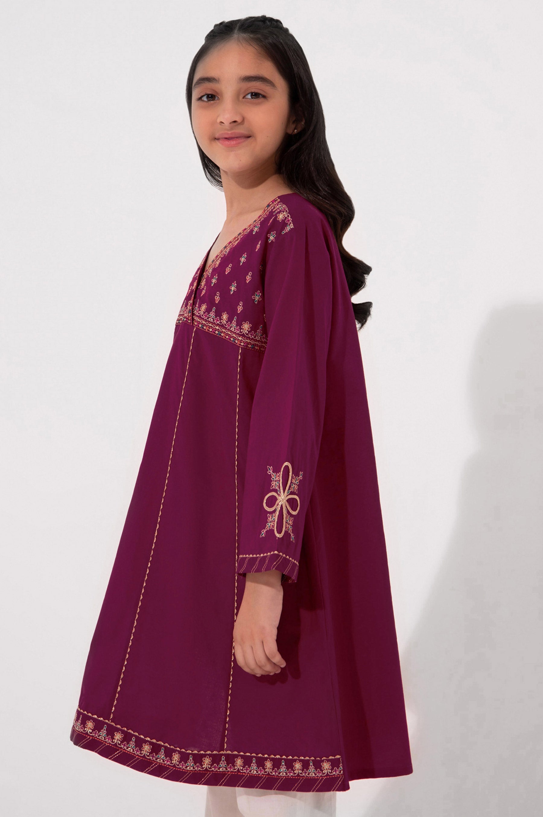 Let your princess flaunt her love for fashion with this beautiful angrakha illustrated with intricate floral embroidery with zari embroidery with a hint of pop color.