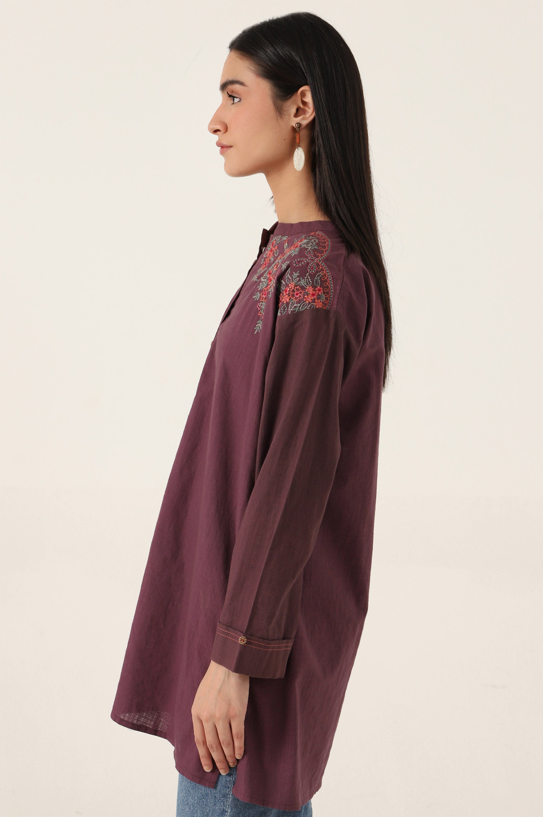 A Relaxed style cotton slub drop shoulder shirt top designed with delicate fun floral embroidery exhibiting modern elegance.Style the look with our denim pants for a stylish look.