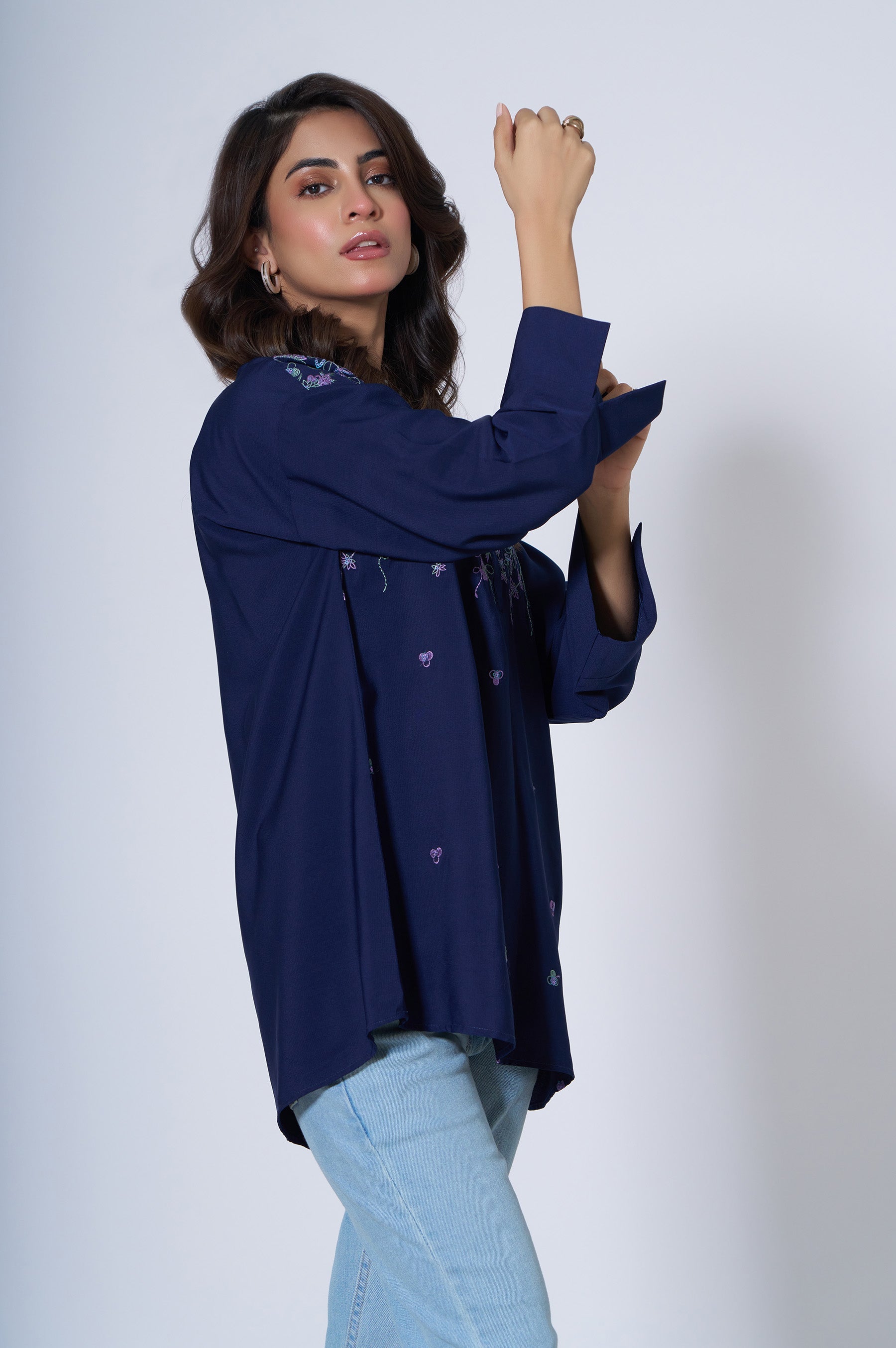 Navy blue colored fusion top designed in a chic manner with full embroidered front followed by stylized sleeves consisting of a cuff with a