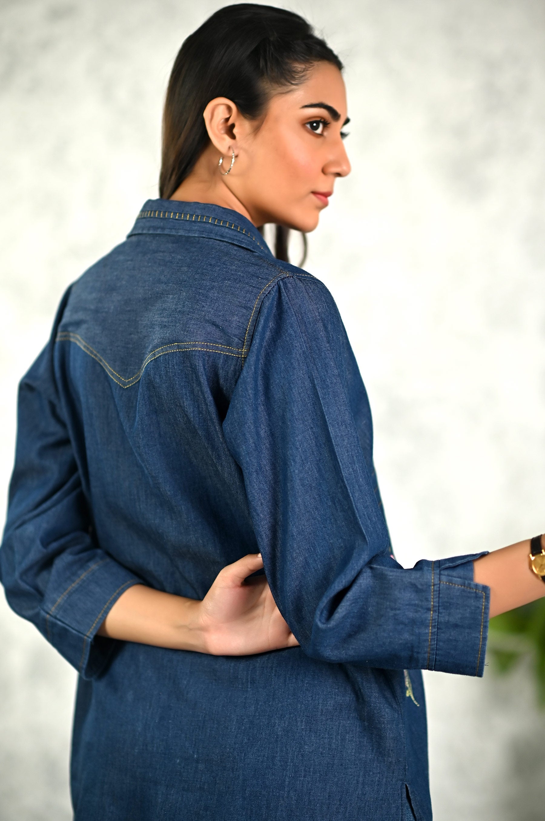 This relaxed botton down denim top features botanical embroidery on the front,further highlighted with contrast stitches.Pair up the look with a blue denim pants and become a style statement upcoming season.