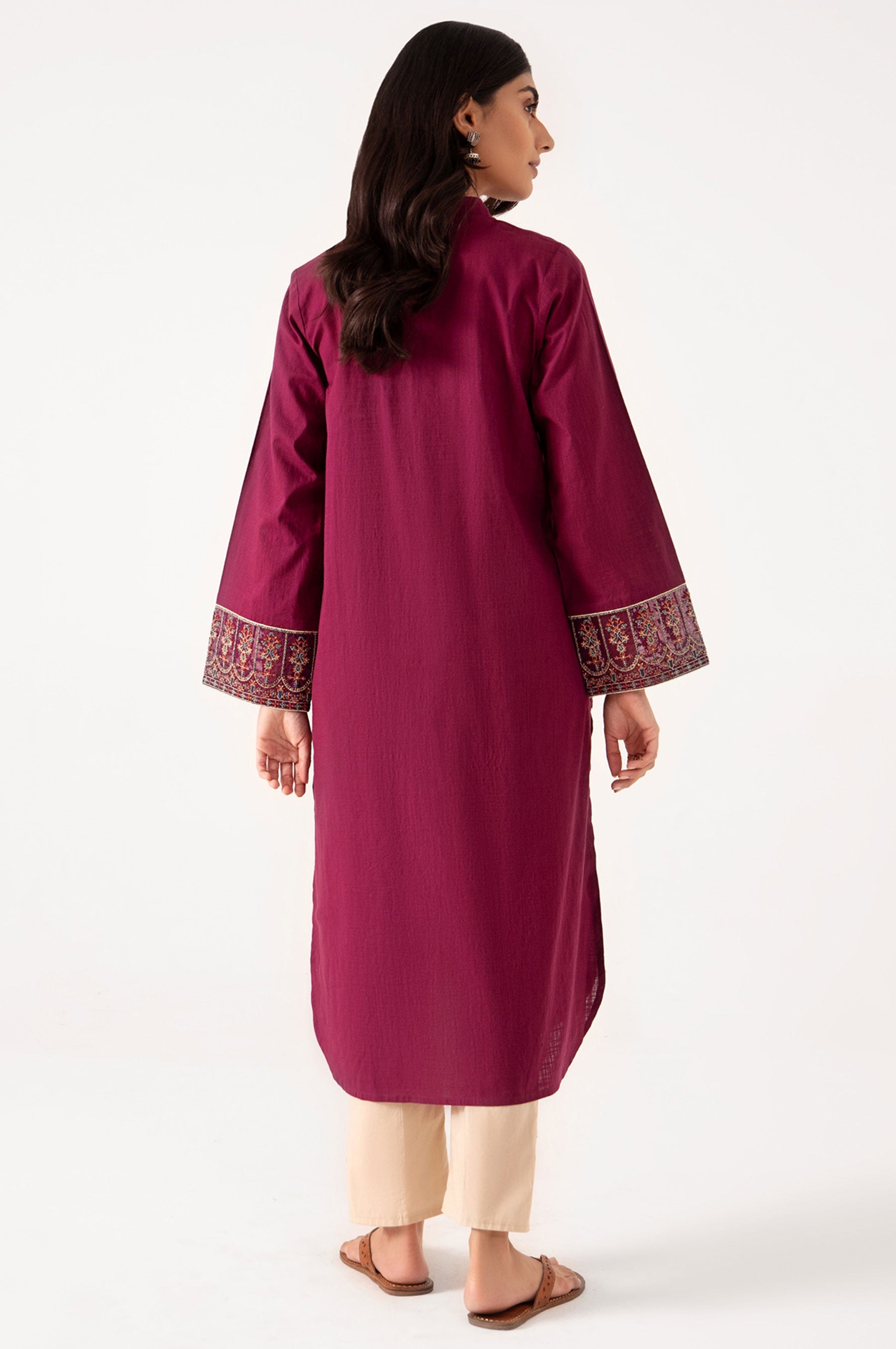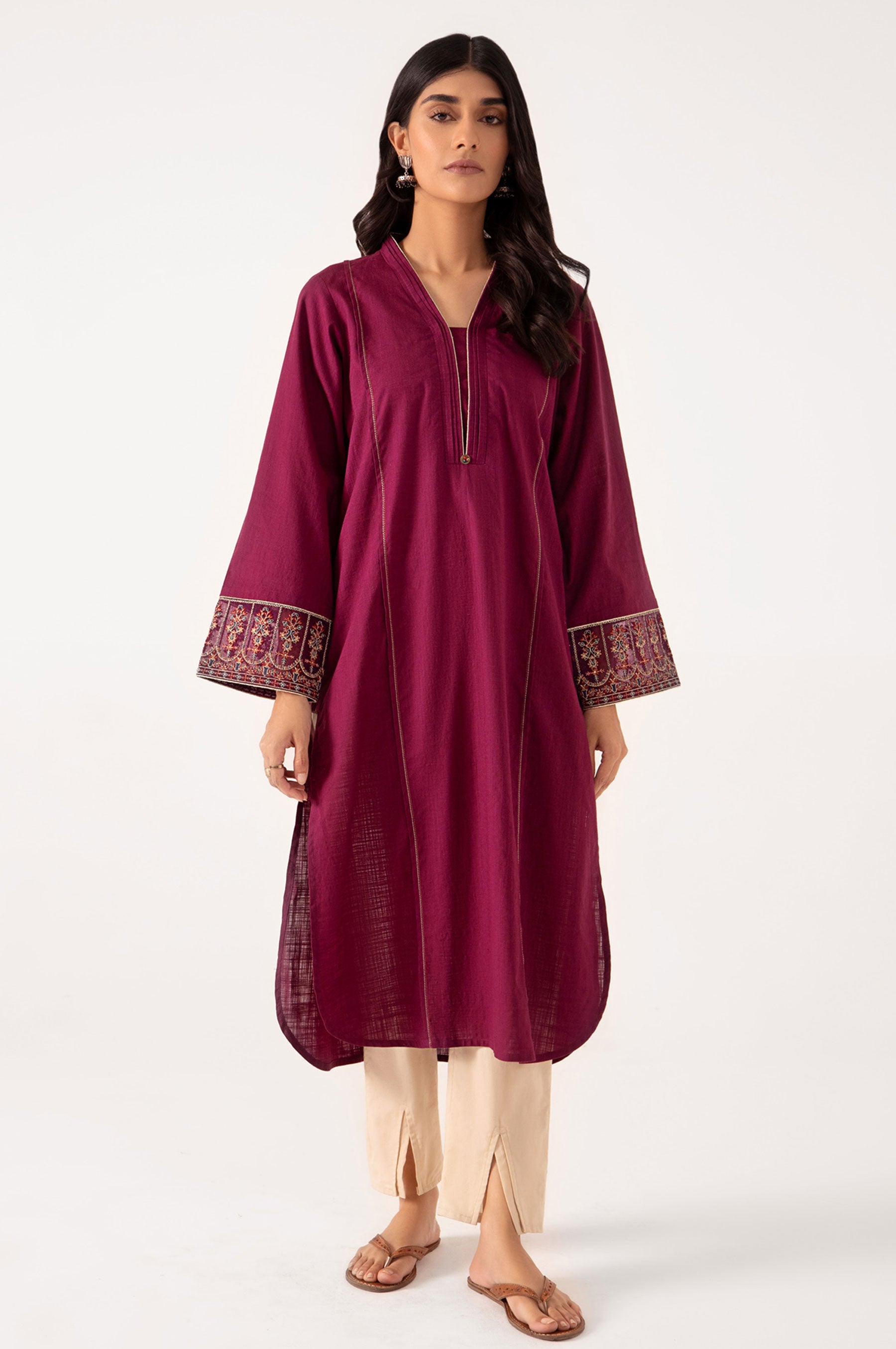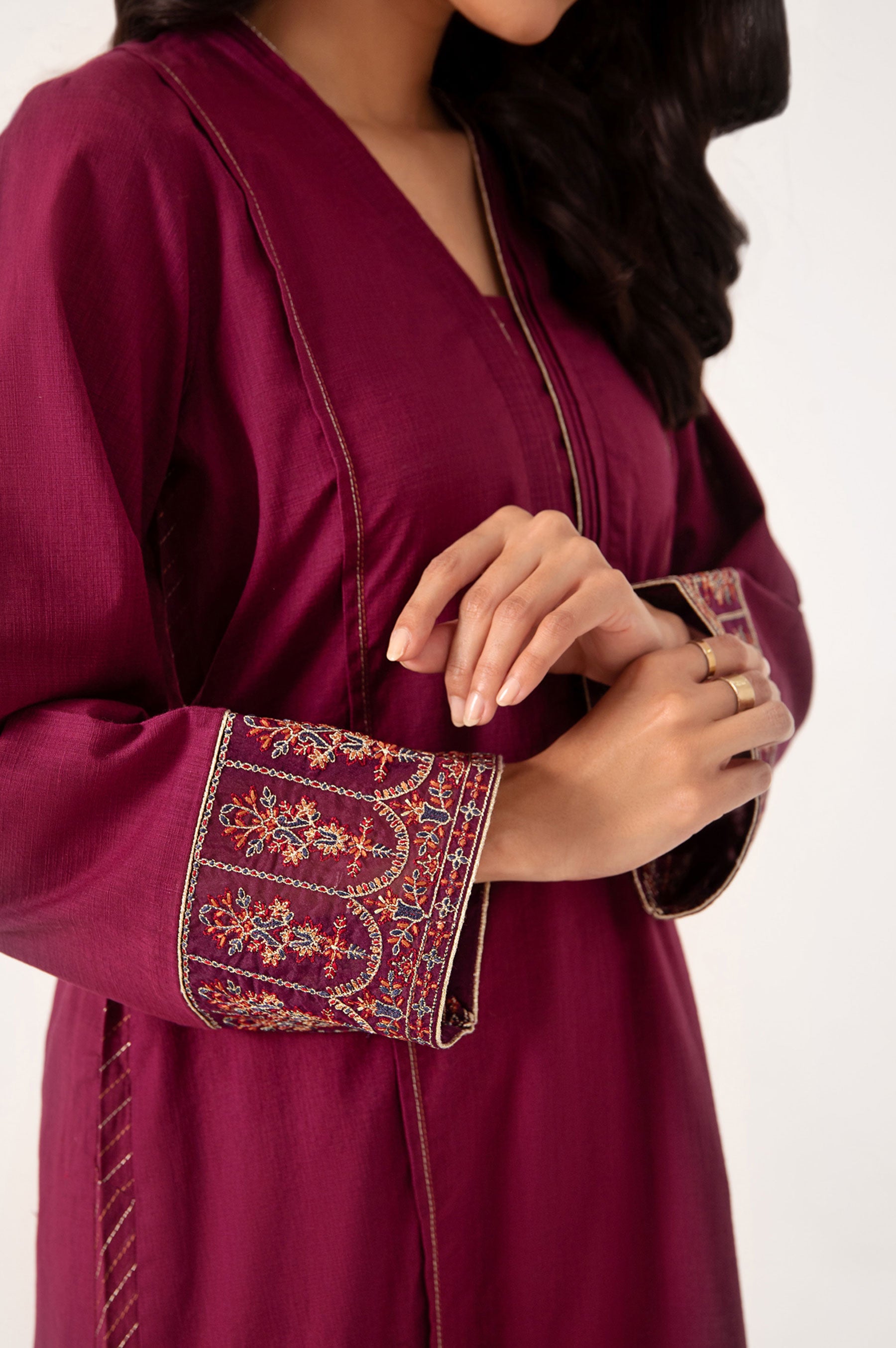 This alluring shirt is rendered with deep purple shade enhanced with a pretty floral embroidered border on organza base. The neckline has crystal tassel detail. Pair it up with any beige or white pants for a complete look.