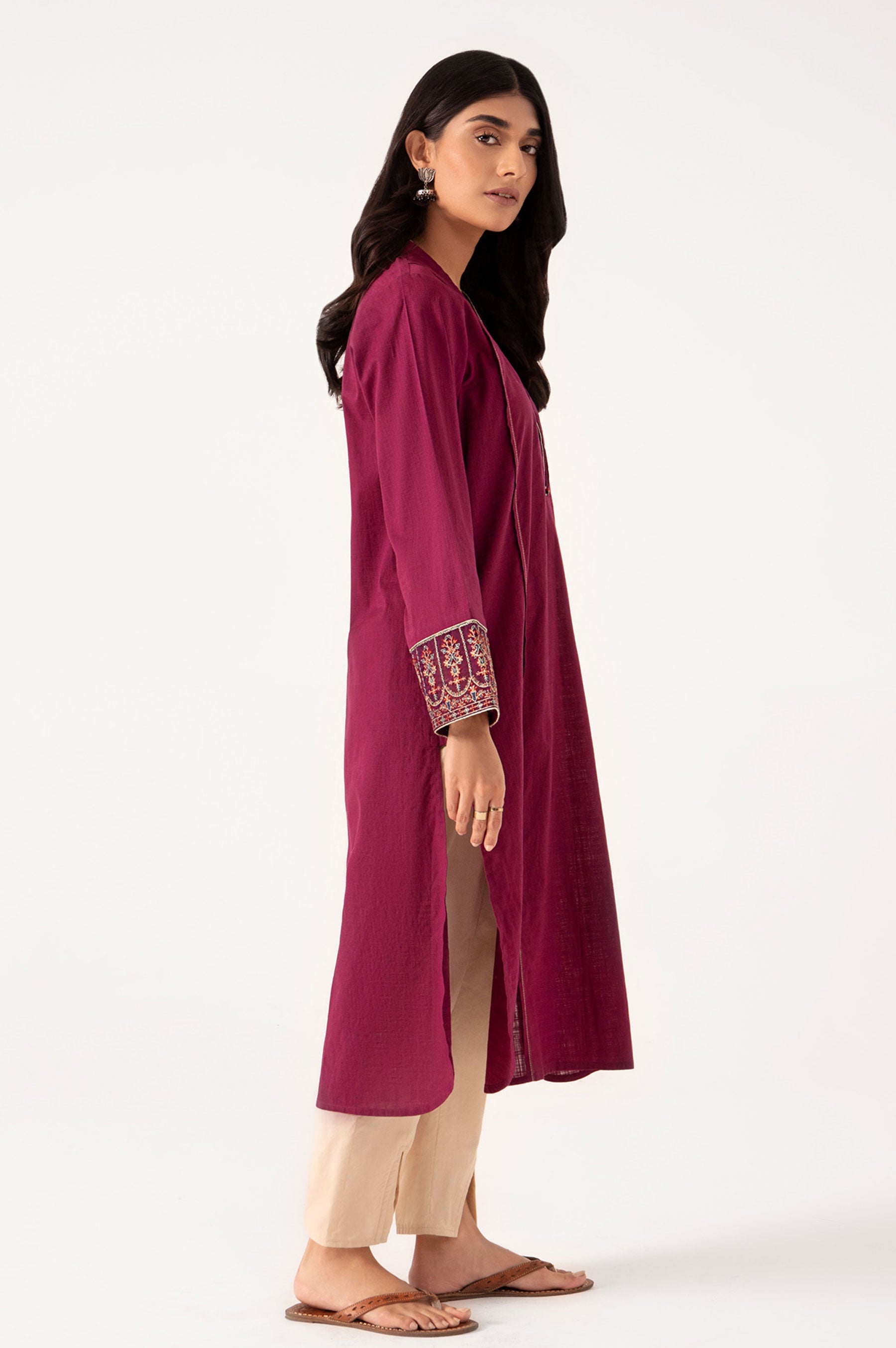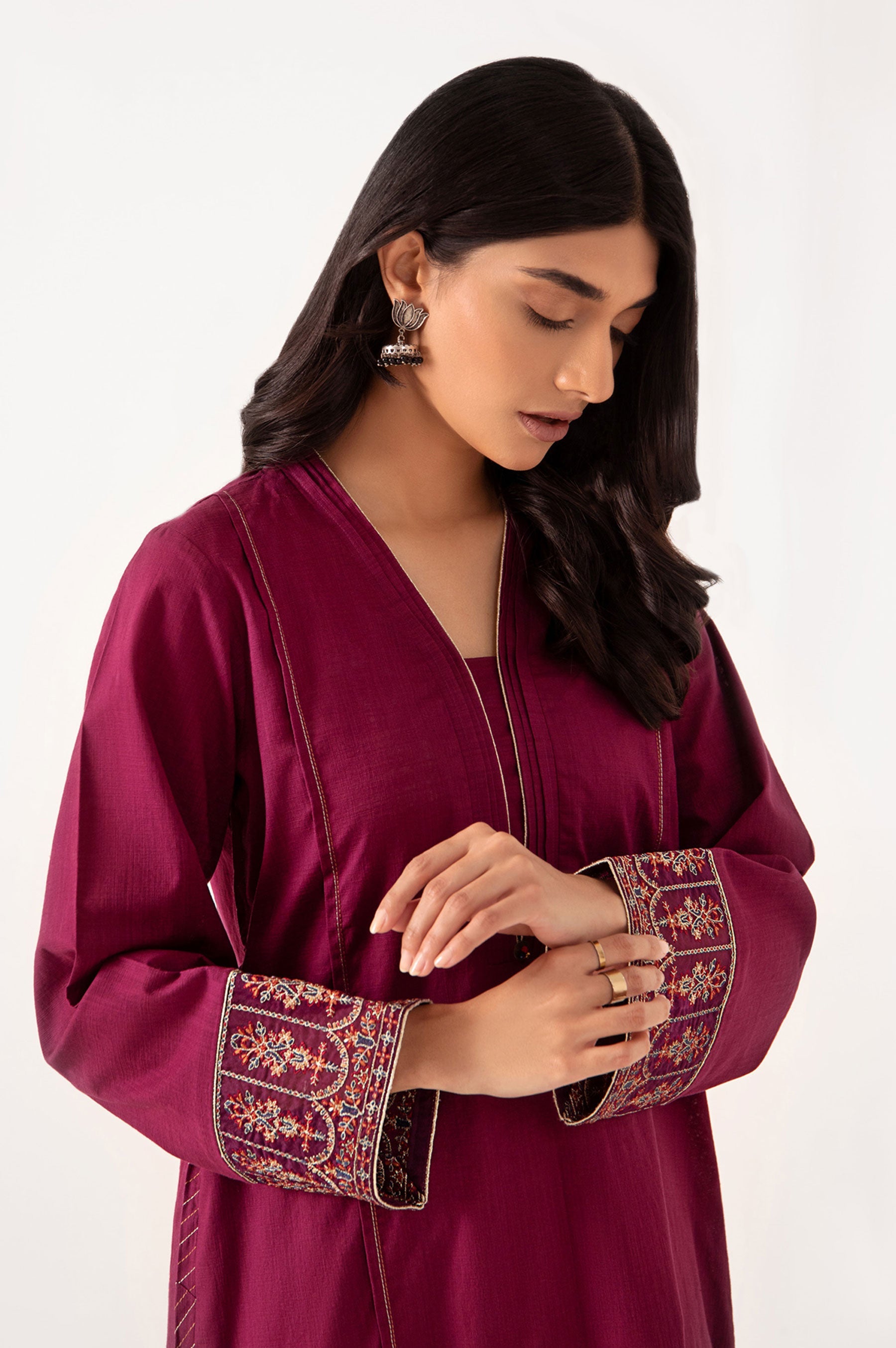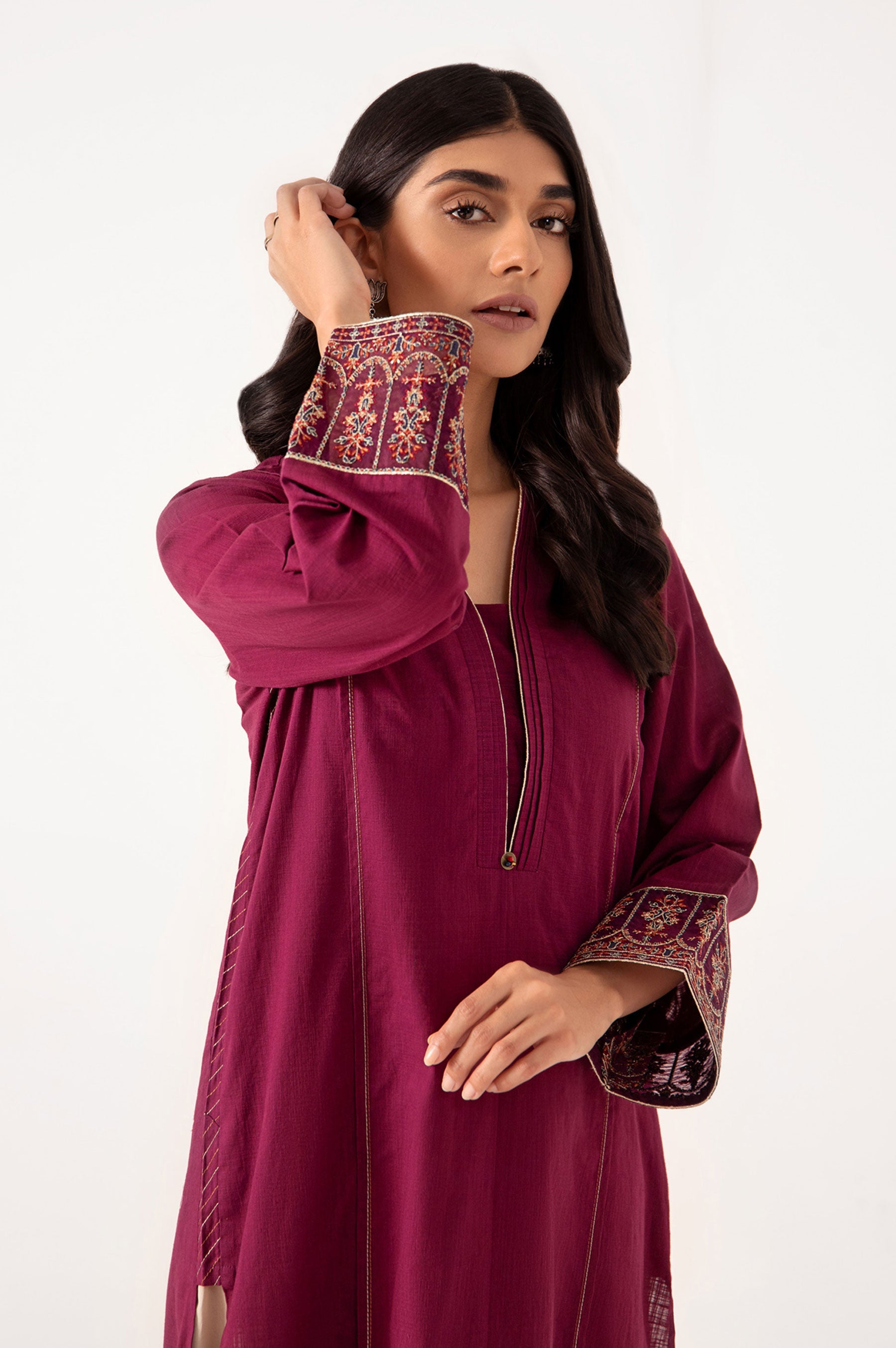 This alluring shirt is rendered with deep purple shade enhanced with a pretty floral embroidered border on organza base. The neckline has crystal tassel detail. Pair it up with any beige or white pants for a complete look.