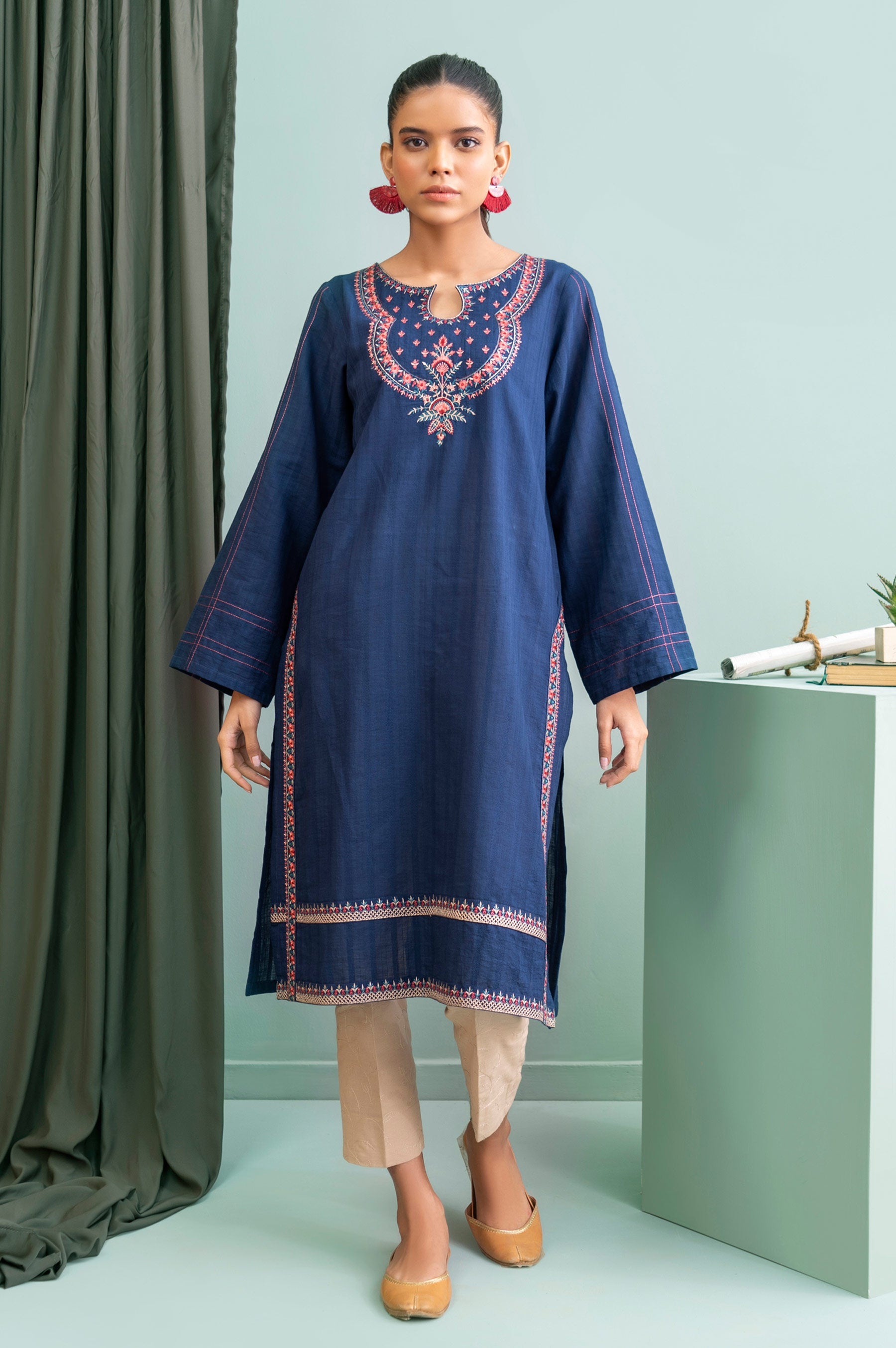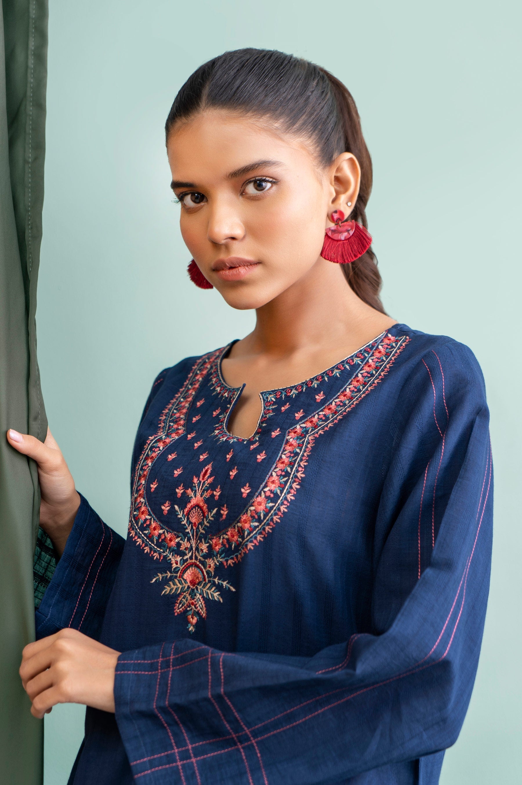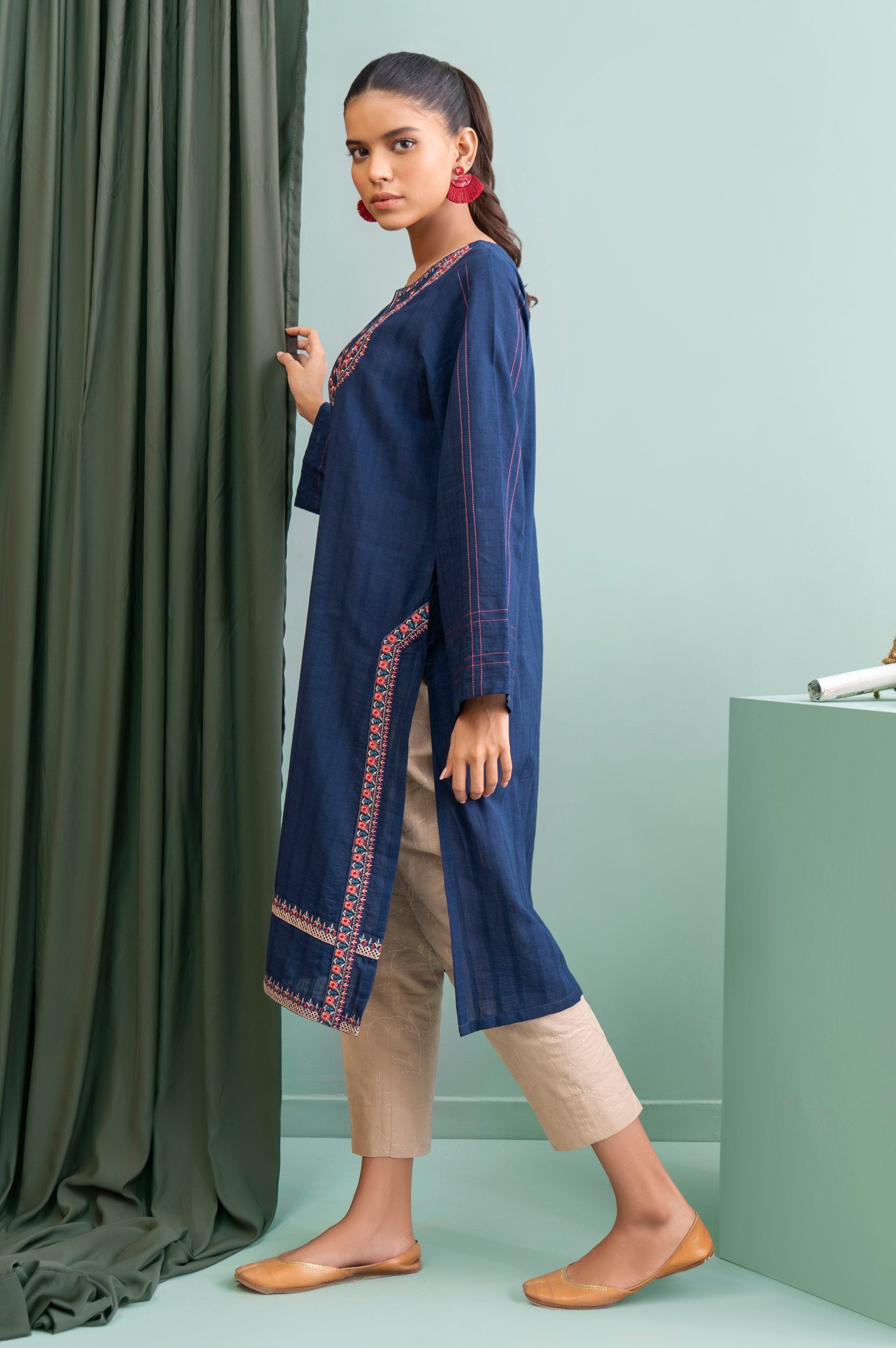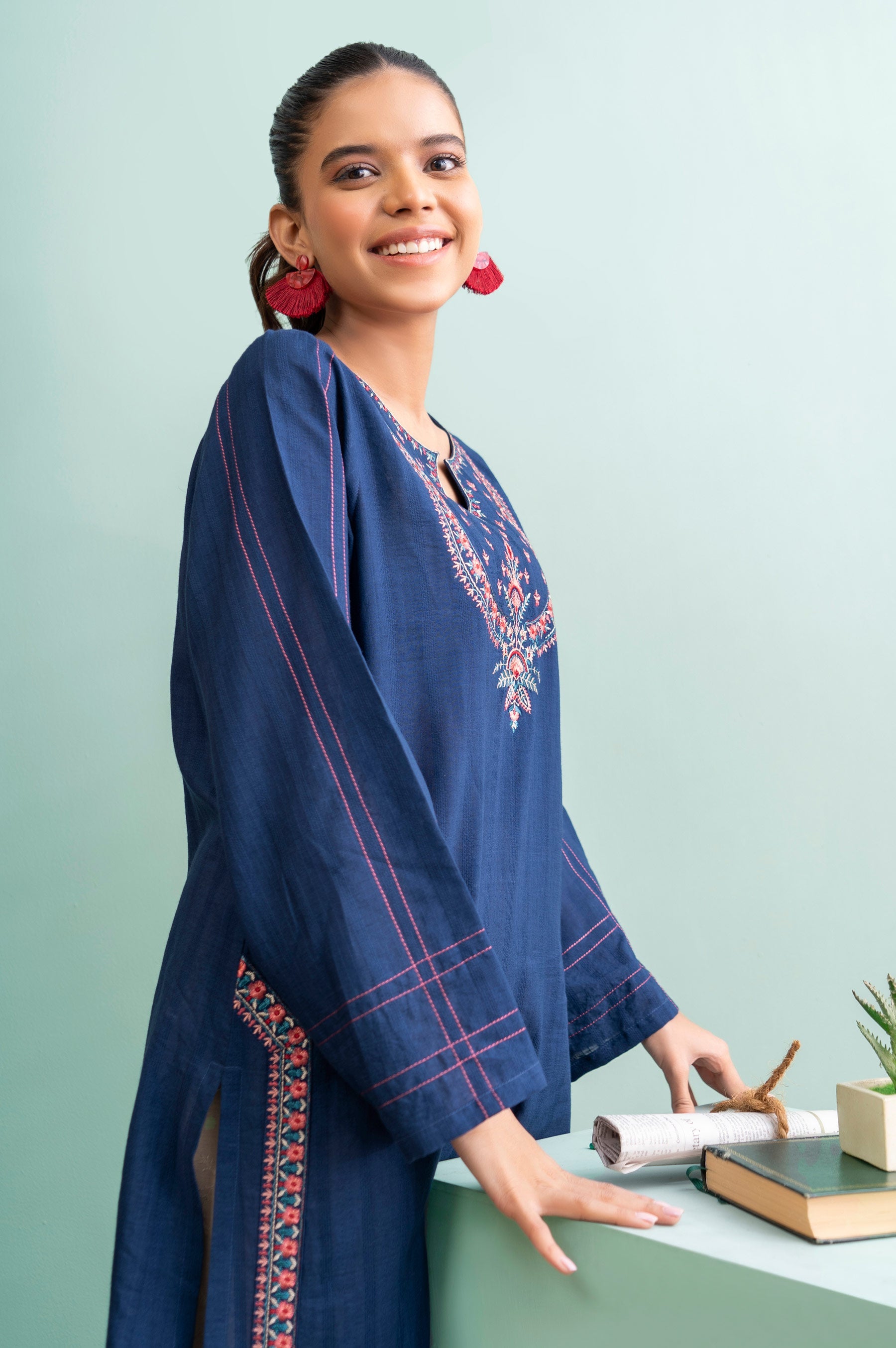 Elevate your wardrobe in blue textured shirt featuring contrasting embroidery on the neck, hem and around the side slit. Compliment the look with our zeen off white pants for an effortless look. This is sure to be a winter favorable.