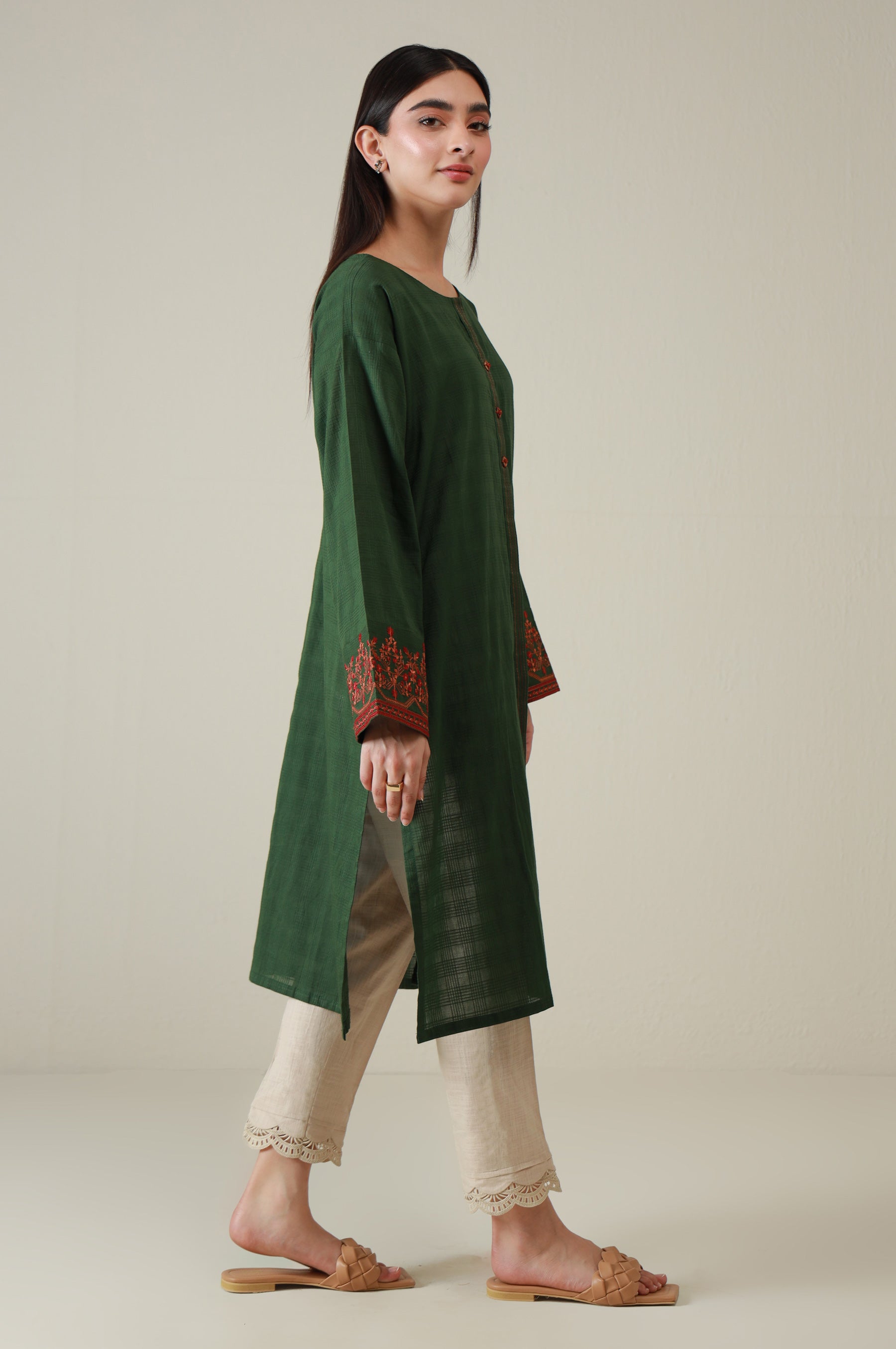 This green shirt with a textured doria base featuring embroidery on the sleeves is the perfect addition to your wardrobe. It consists of a round neck with a front placket along with buttons on the front to uplift the look of the shirt. The back features running stitches in contrasting colors to add to the details of the outfit.