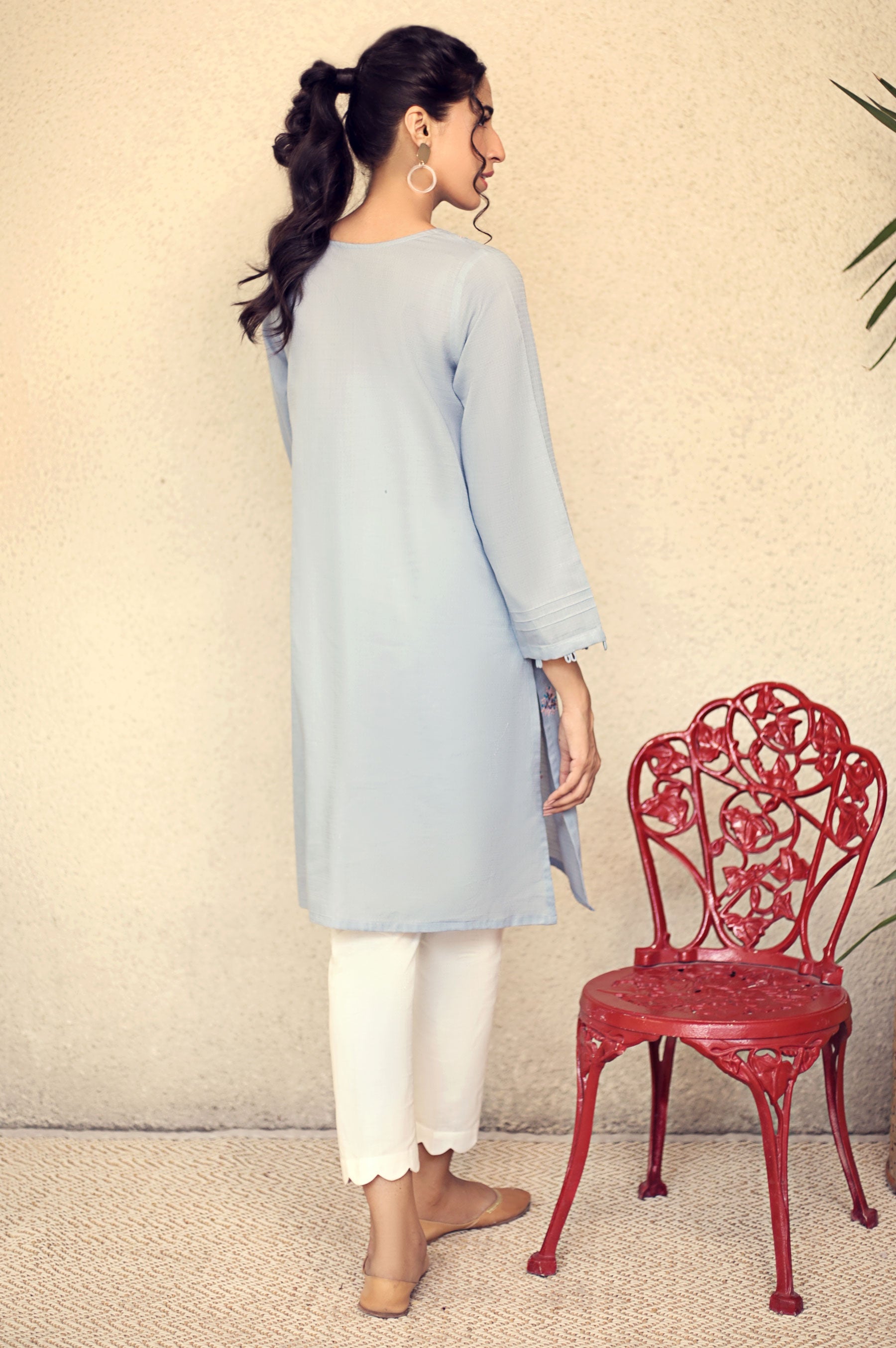 A self-textured jacquard fabric with cluster of botanical motifs skillfully embroidered in softer hues on the front, and crystals as embellishment on the neckline are the highlights of this kurta. Stylized with loops on the sleeves end and buttons on the side seams, this kurta is the perfect attire for office or coffee with friends.