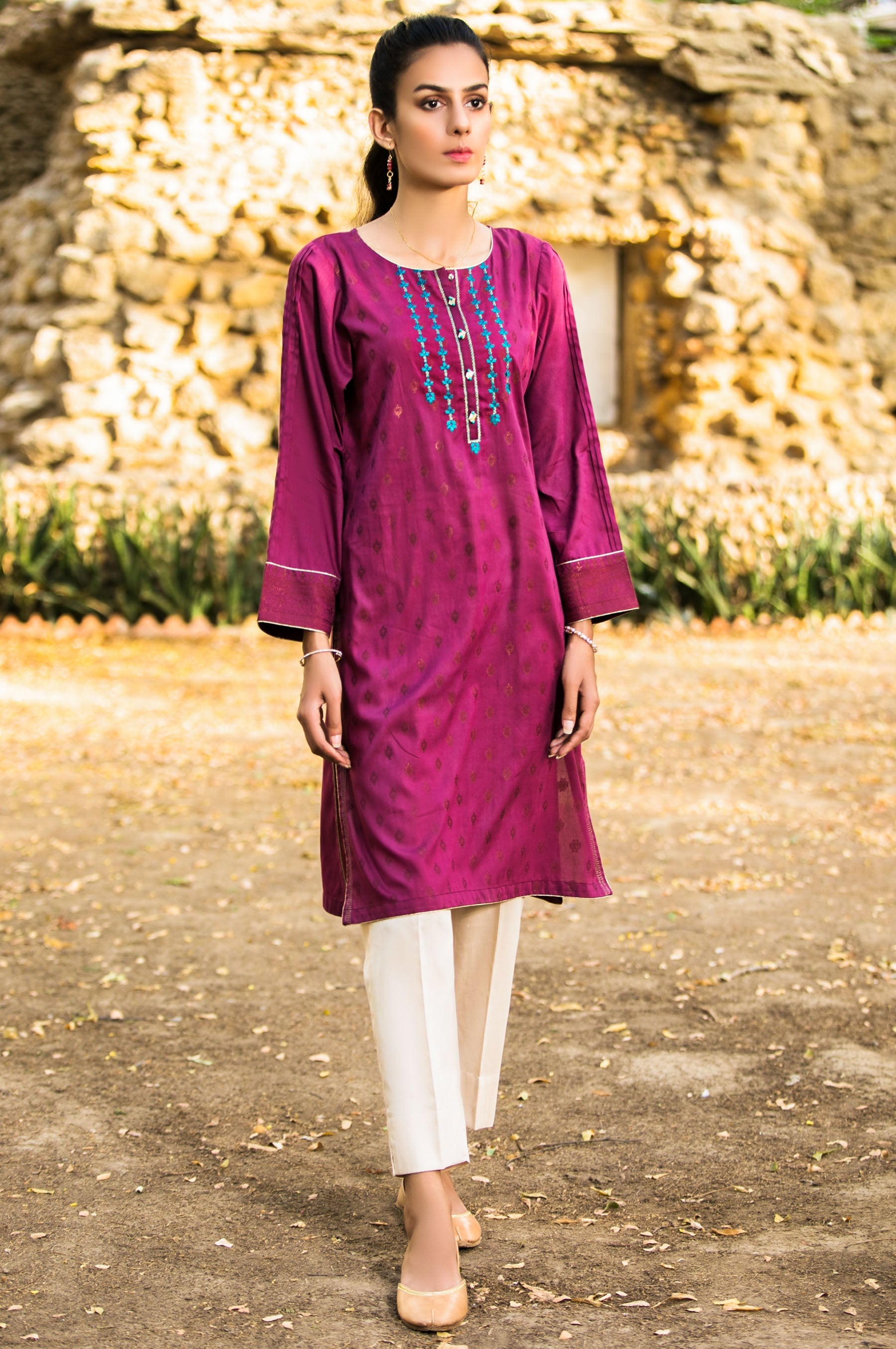 Make a regal statement with this Plum Kurta with all over Copper Jacquard Motifs. The round neck with Deep Teal embroidered neckline and the Gota embellishments add further beauty to this kurta.