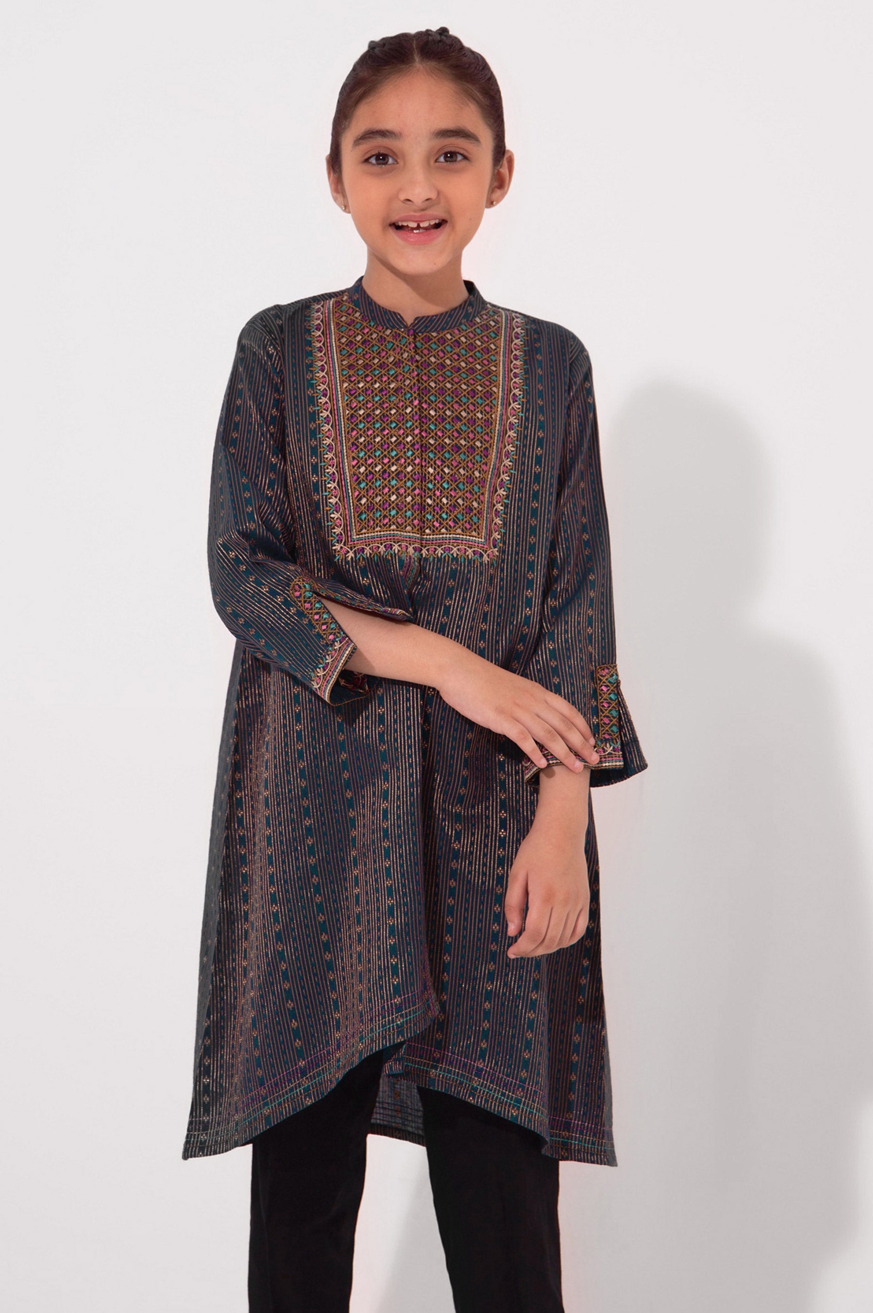 Let your princess celebrate her love for fashion with this beautiful assymetrical shirt which includes multi color embroidery on the neckline and sleeve.It is a perfect blend of bright colors.Pair up the look with our zeen offwhite pants to make the little diva standout in the crowd.