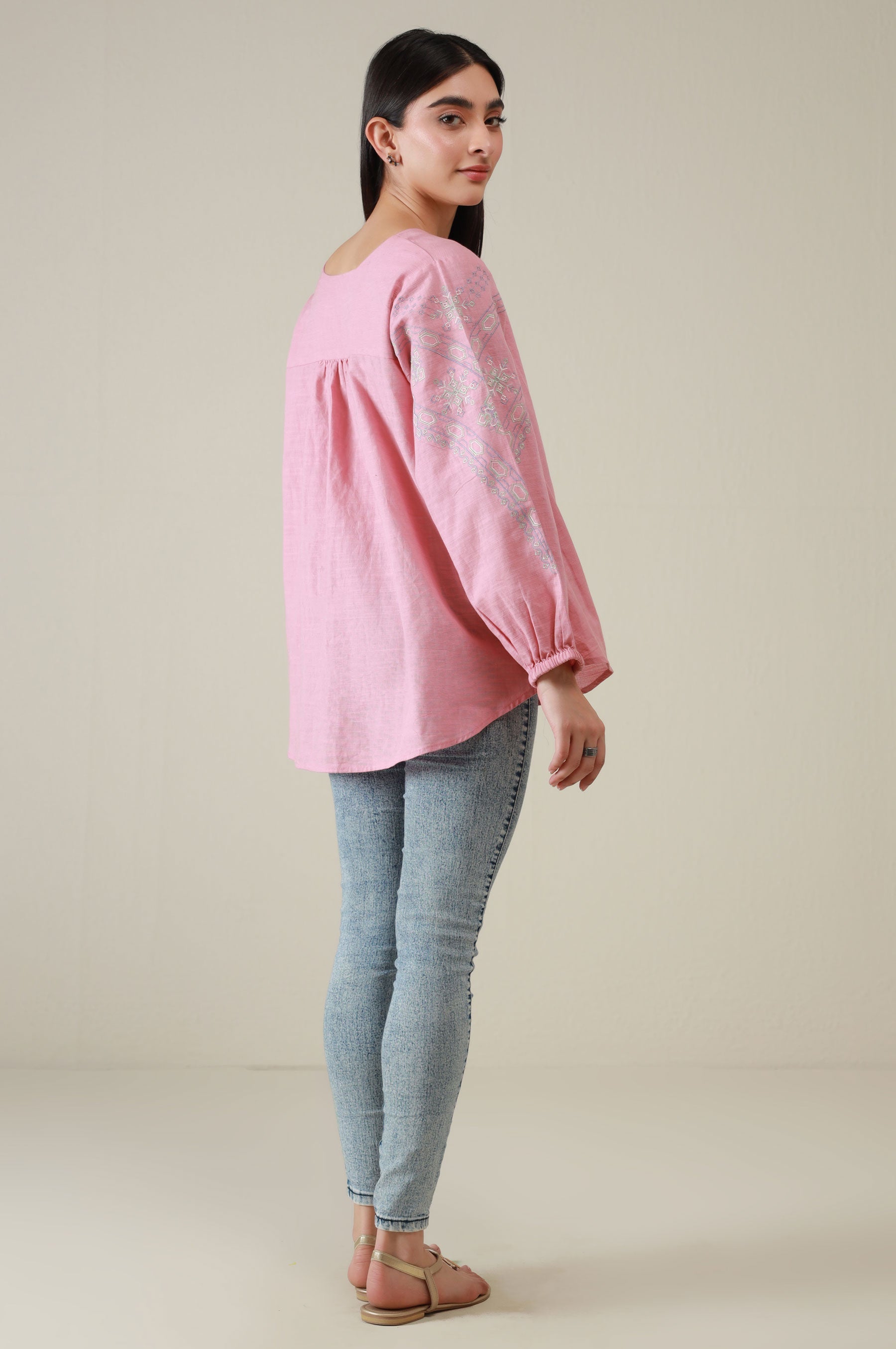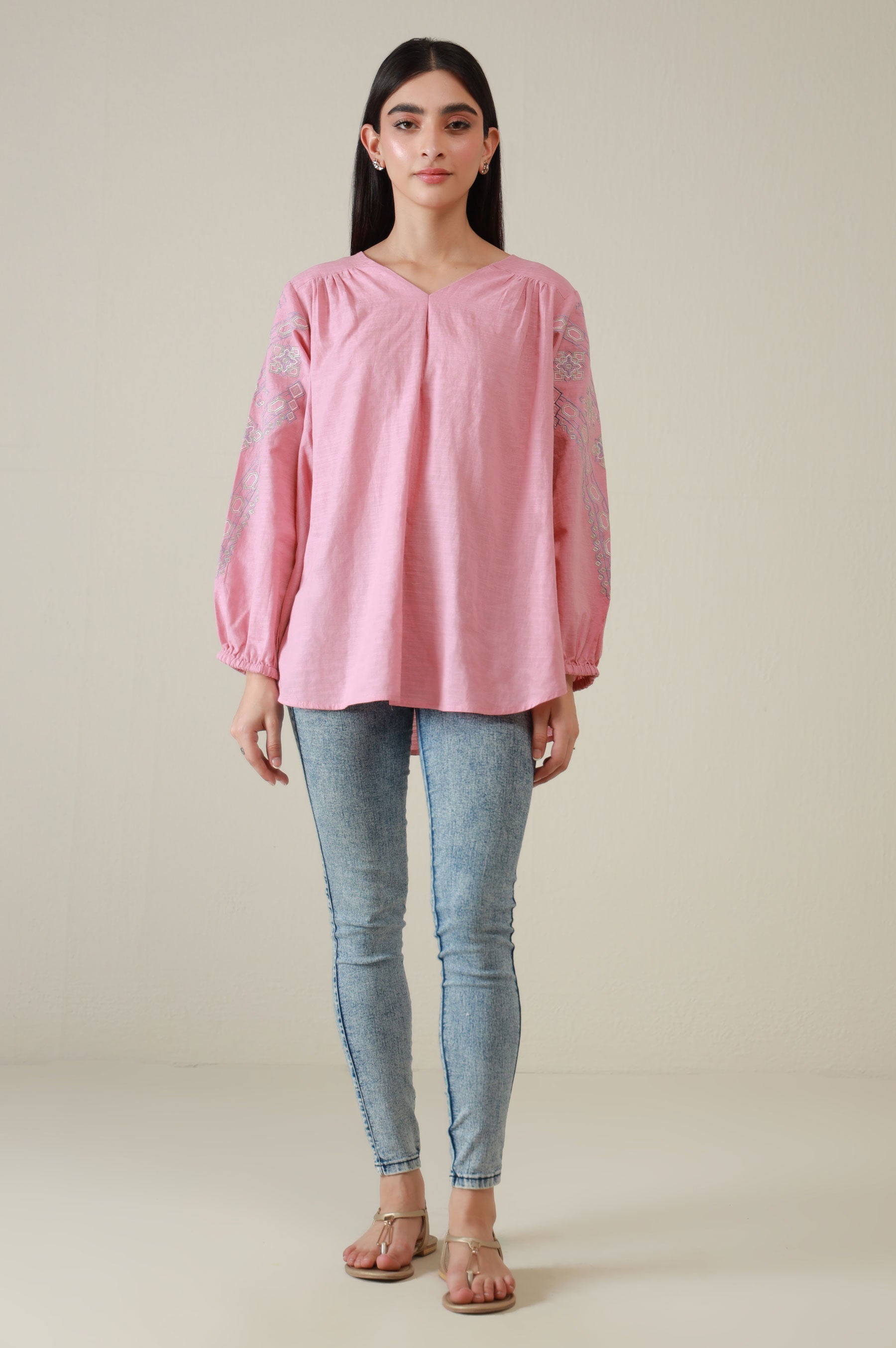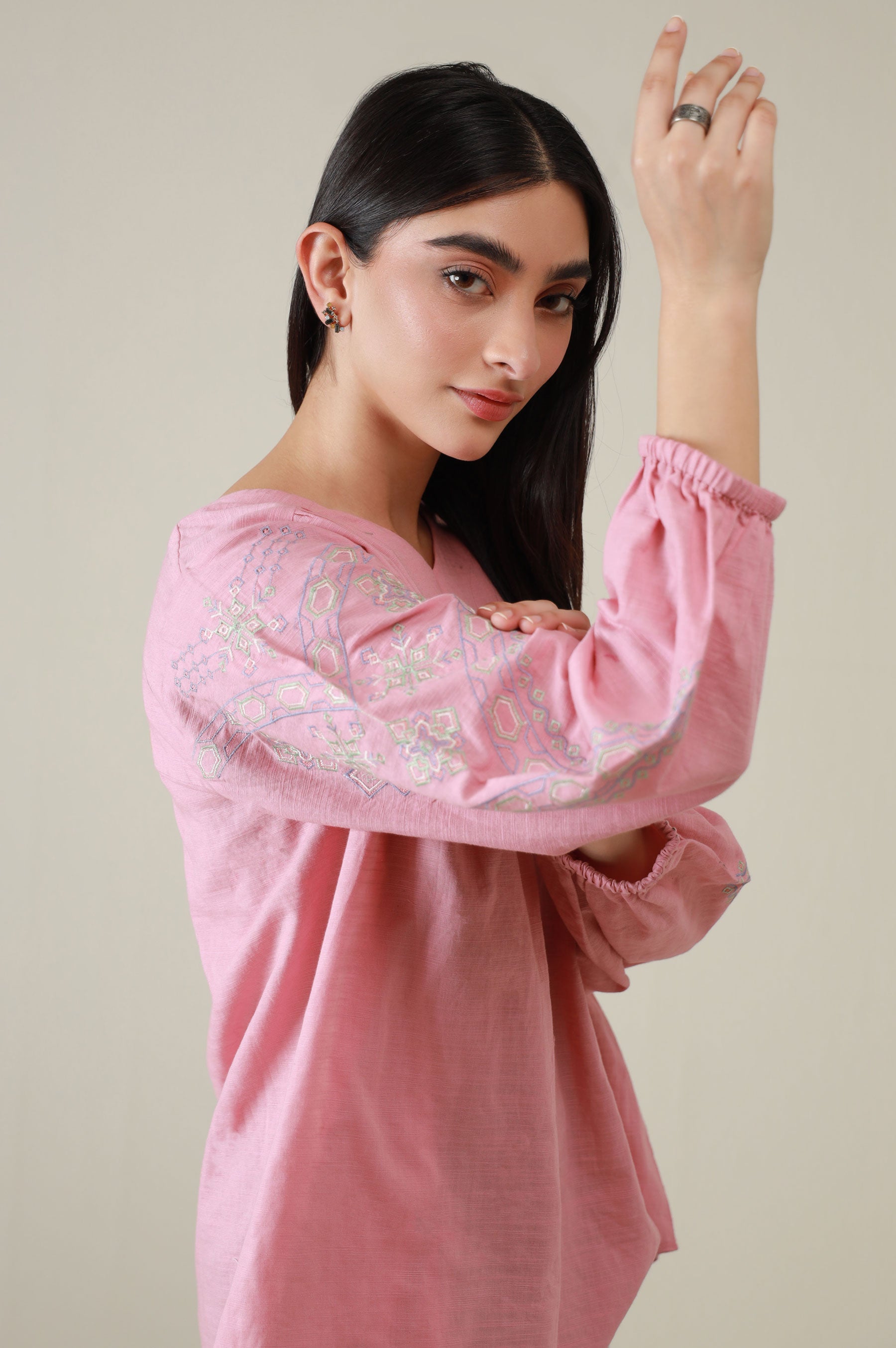 Introducing a trendy top, featuring an alluring design in pink shade adorned with geometric motifs in contrasting soft hues. Ideal for both casual and fun occasions.