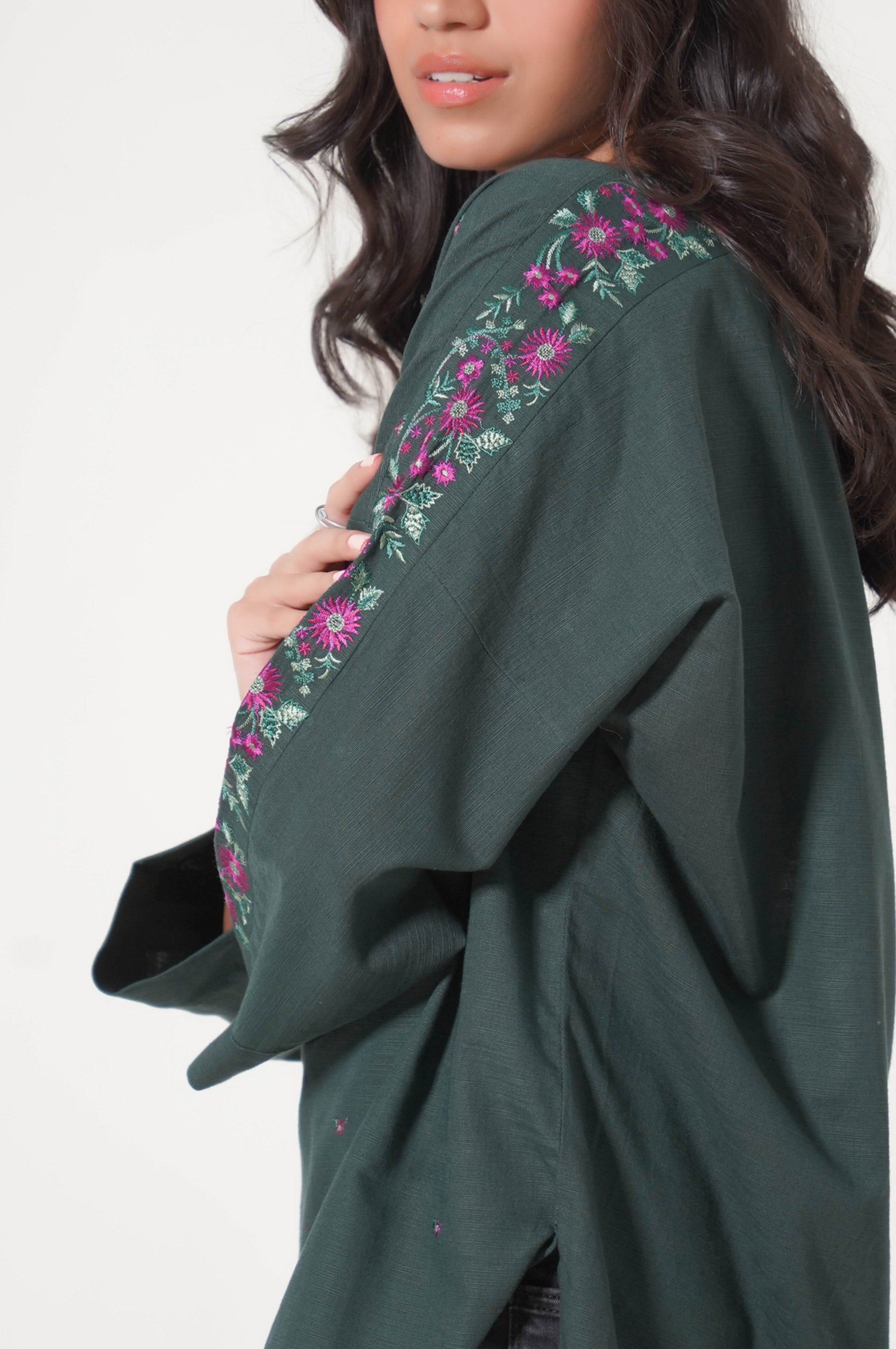 An enchanting silhouette is coming to your way this season, including dainty floral embroidery on sleeves and cute little hint of floral on the front, rendered in leaf green shade. This statement top is a perfect option to style at fun occasions this season.
