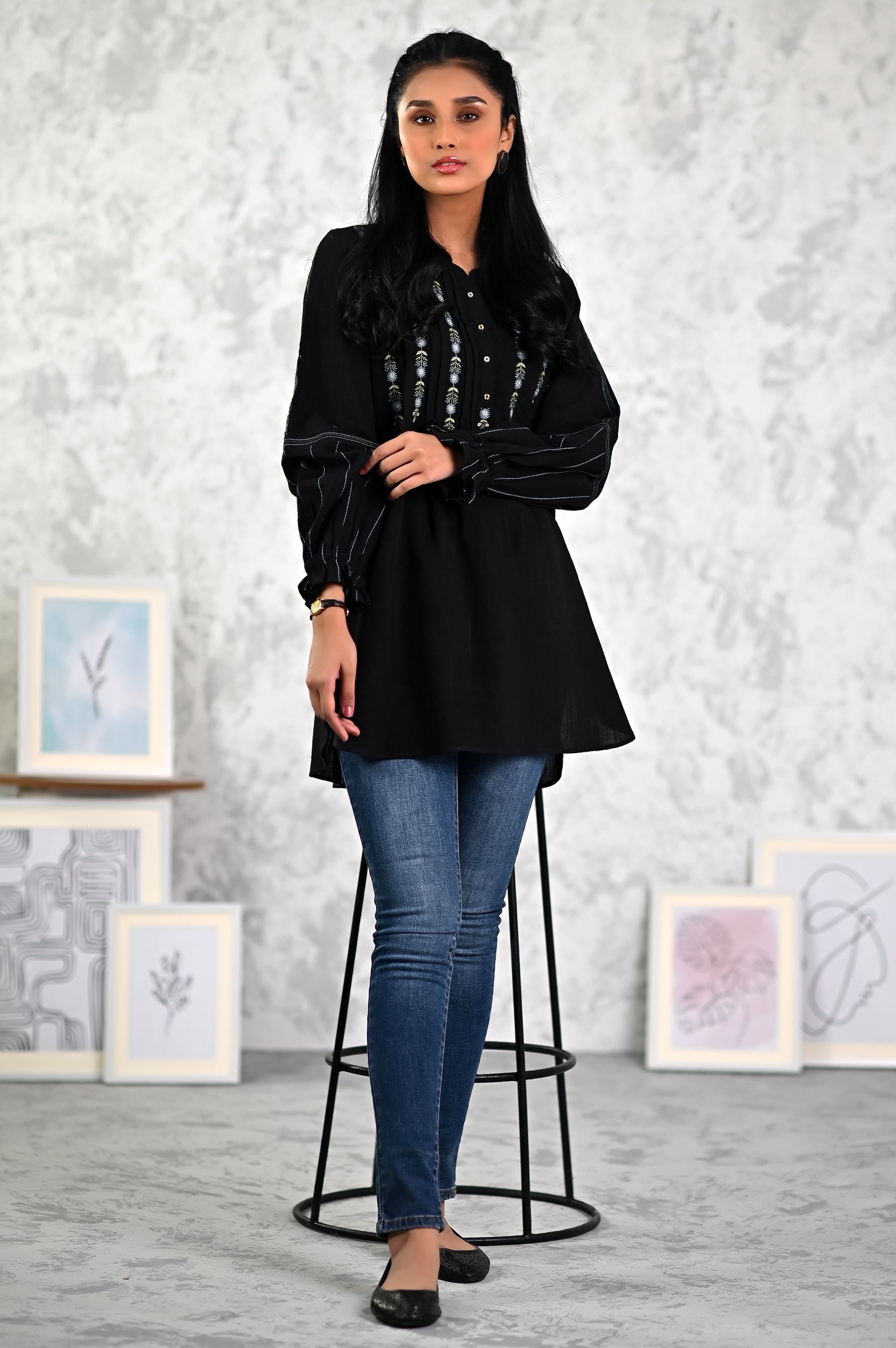 This Black khaddar fusion top is crafted in funky floral embroidery on front and sleeves in the shades of green and powder blue. Adorned with pleated front, wooden buttons and gathered frill sleeves.