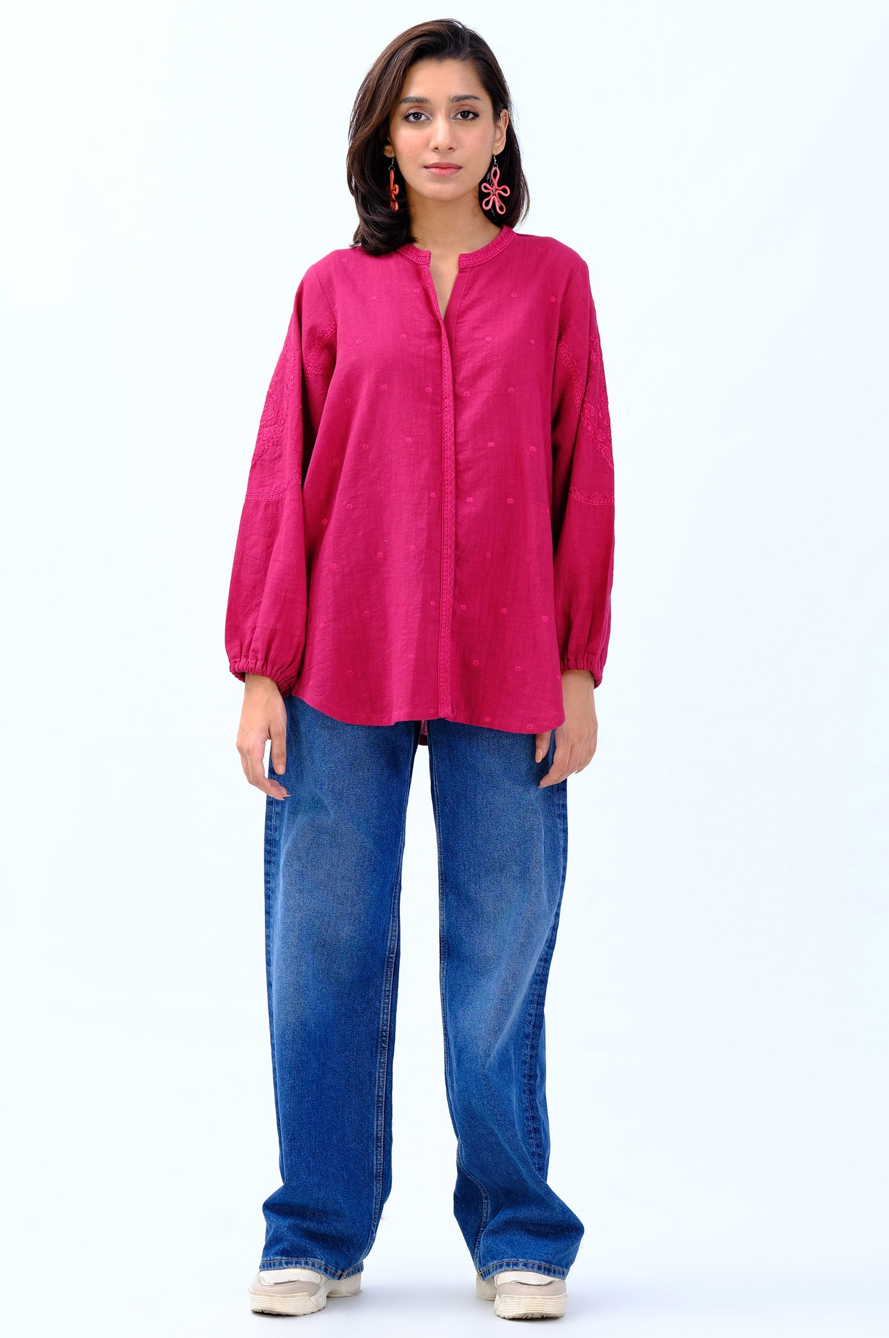 A floral embroiderded fusion top including placket and gathers on sleeves, ideal for casual wear.