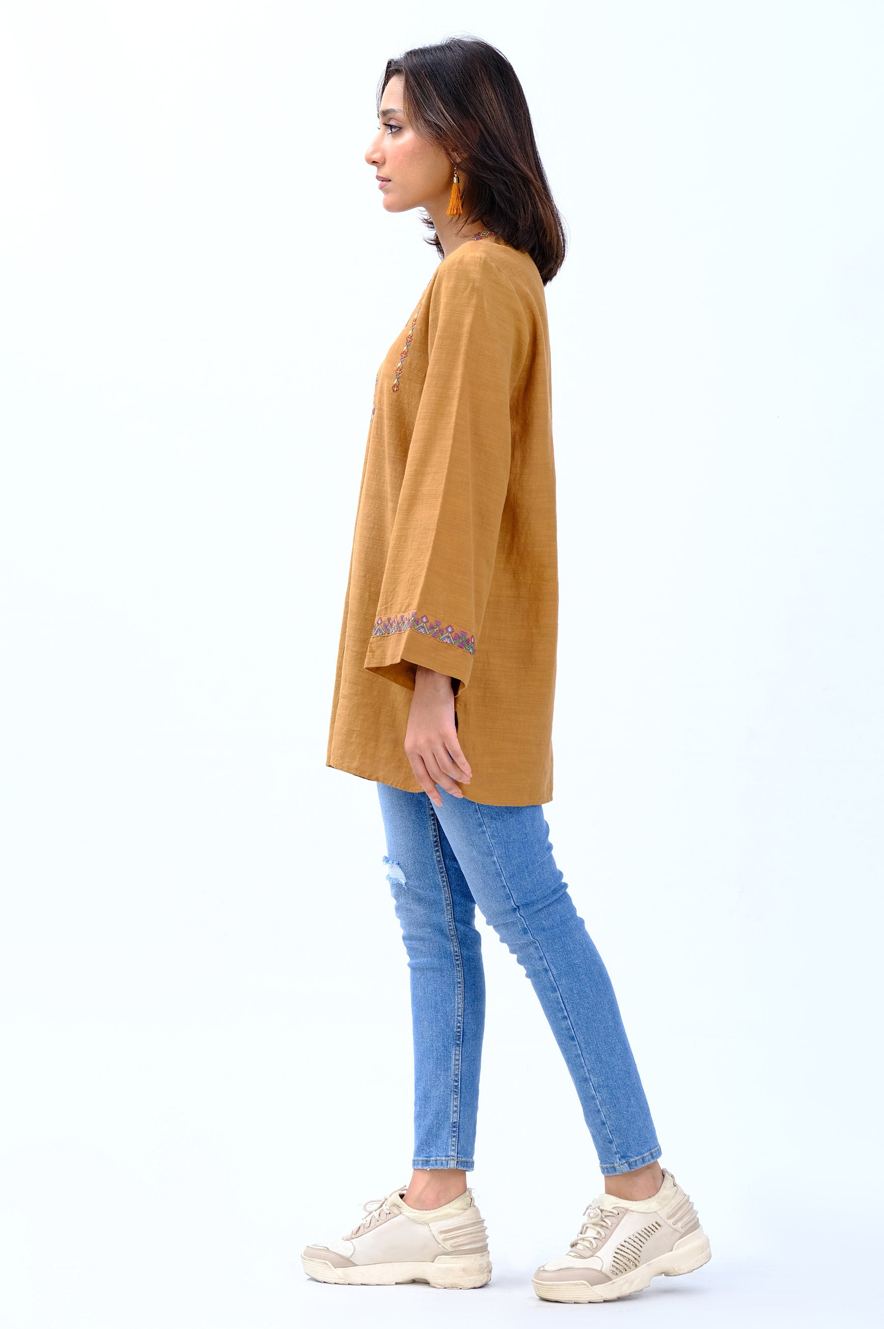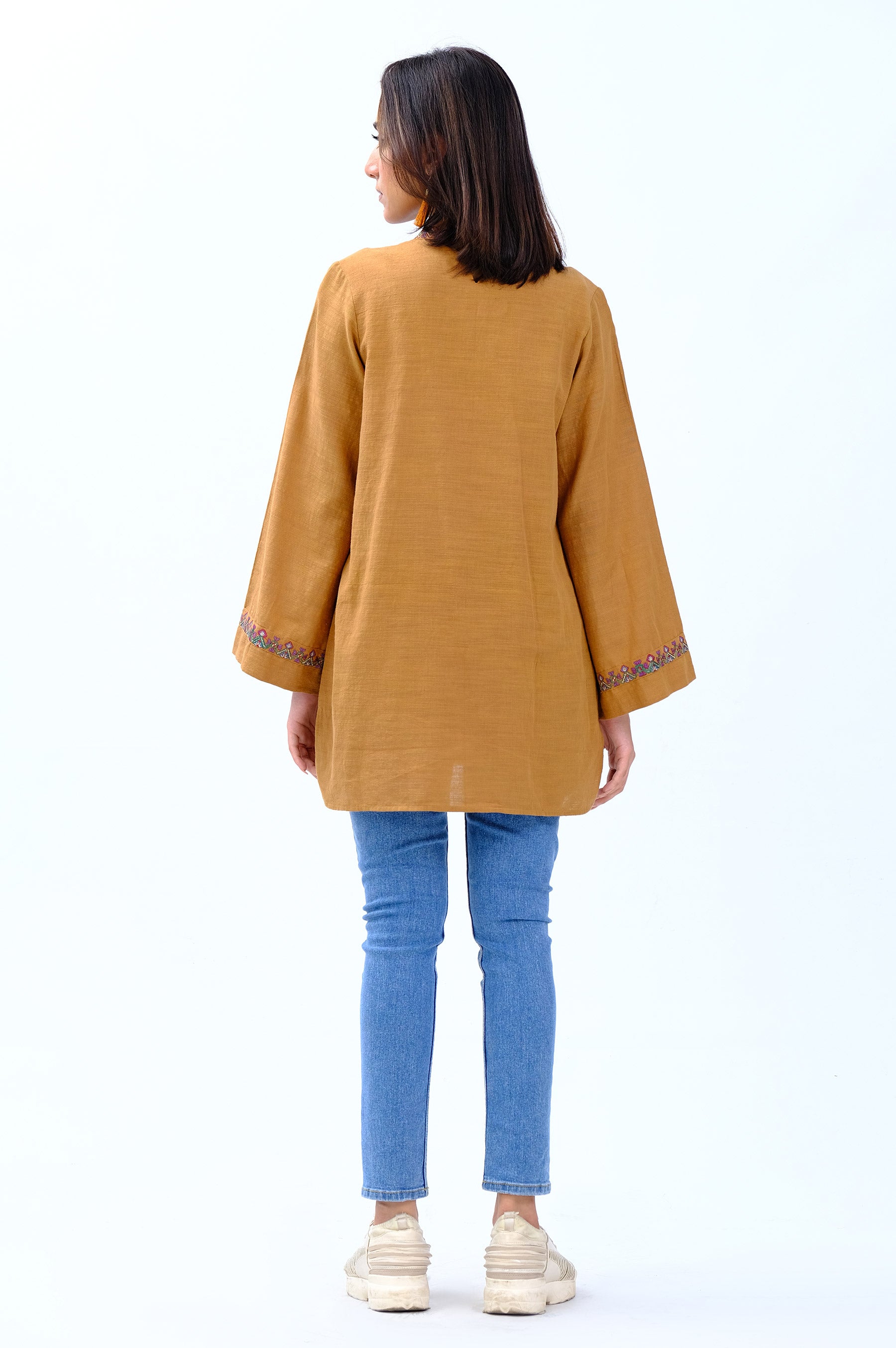 Steal the show with this Chrome fusion top featuring elegant contrasting embroidery all over. The creative round hem and the embroidered sleeves will leave a remarkable impression on your peers.