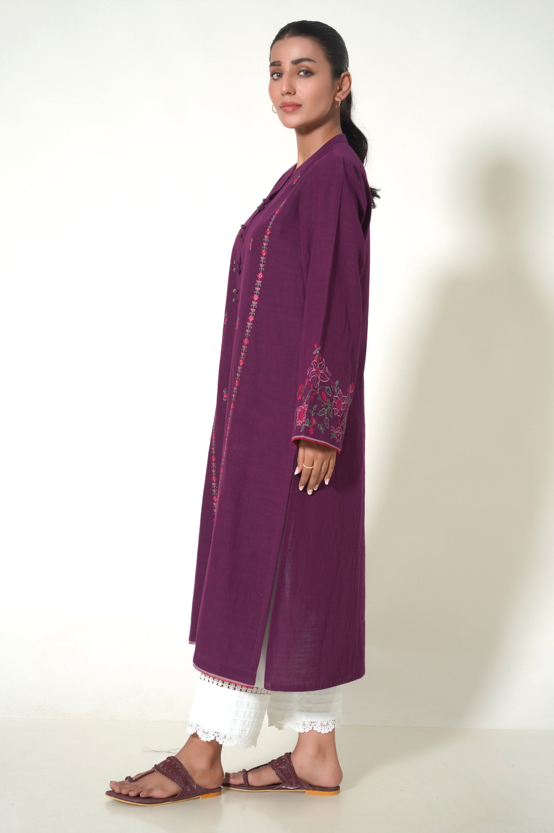 Elegantly crafted from pure Khaddar fabric, this exquisite purple tunic showcases intricate multi-embroidery, enhancing its captivating appeal. The long shirt boasts a Band collar neckline adorned with loop buttons, adding a touch of sophistication. Completing the ensemble, a loose full-length tunic with embroidered edges and delicate organza accents exudes timeless elegance