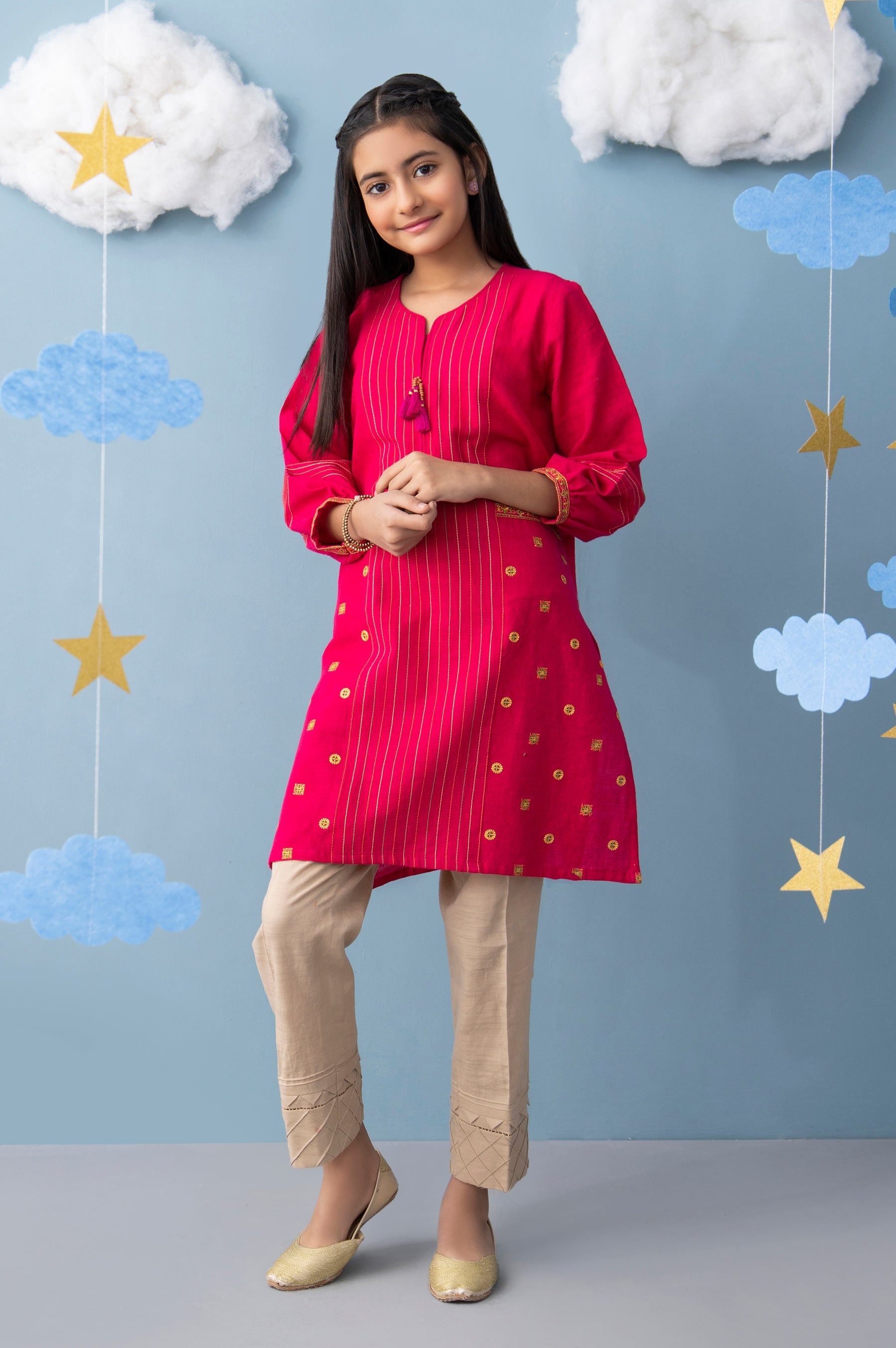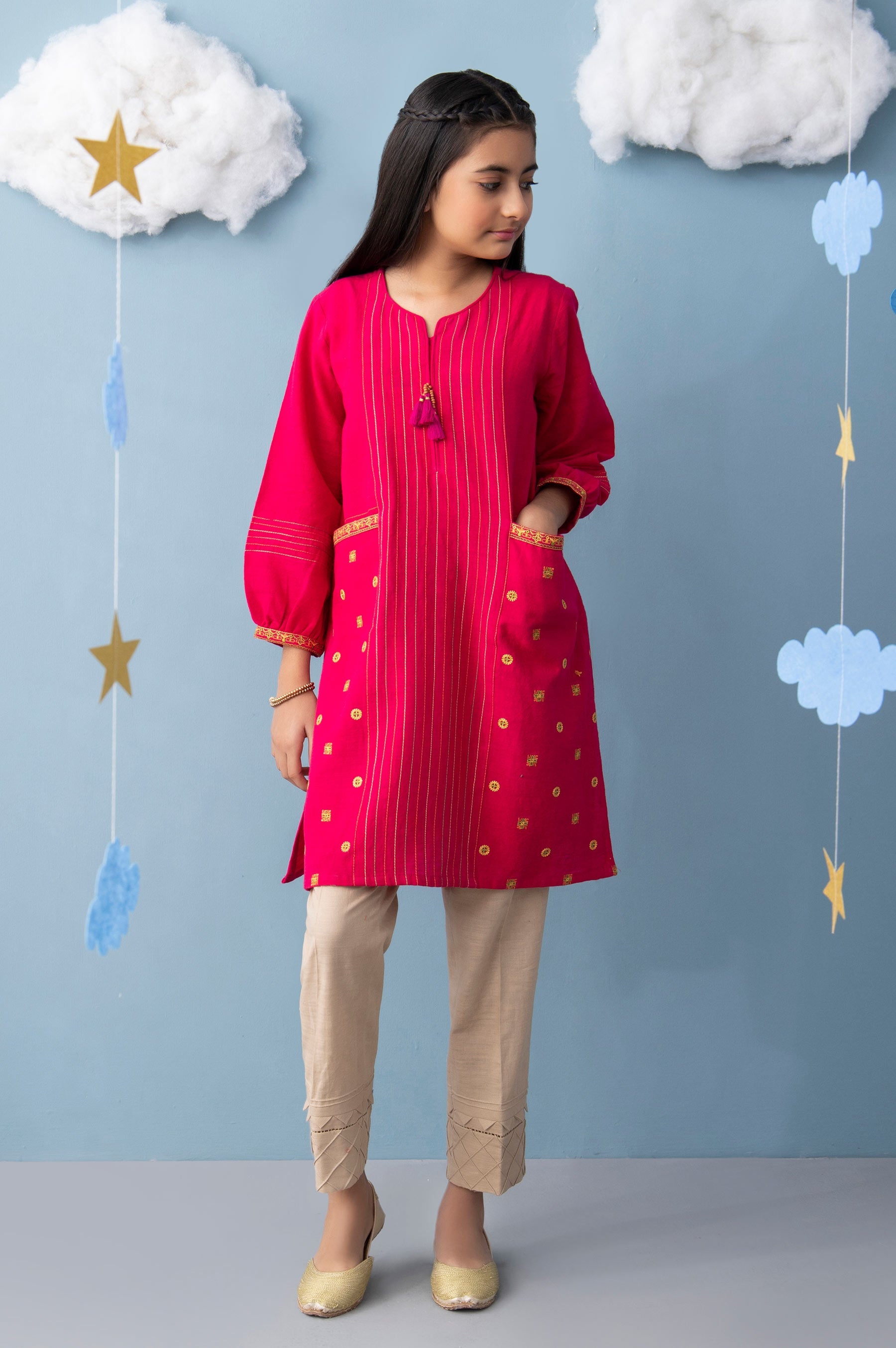 Funk your little girls wardrobe with this flamingo pink khaddar shirt featuring contemporary embroidery on front and sleeves. The colorful stiches, funky tassels on the neckline, the pocket and gathers on the sleeves are the highlight of this design. Pair it with beige cigarette pant from our Zeen bottom collection for a fun play date.