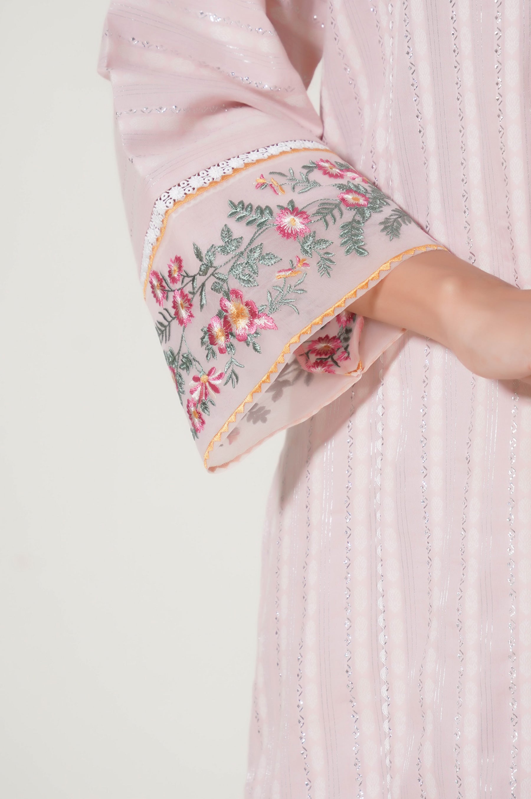 This pink shirt comprises of an embroidered neckline with delicate floral motifs. The front also consists of laces on the panel to add to the look of the outfit. The sleeve has an embroidered organza in matching hues to elevate the shirt look.