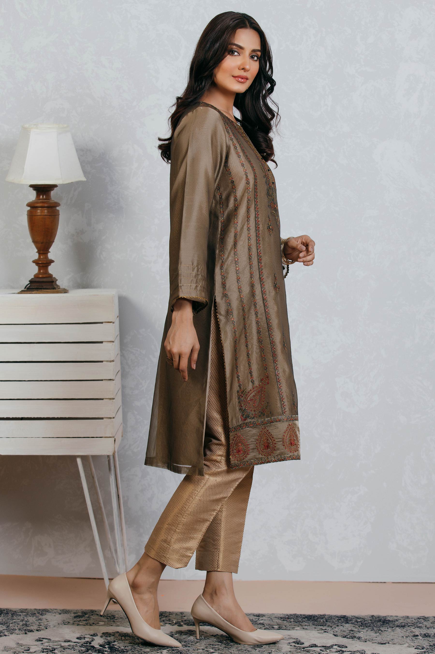 This mesmerizing deep taupe organza shirt is illustrated by traditional delicate floral embroidery at front ,portraying an enchanting composition. This dazzling shirt is a pure example of timeless elegance.