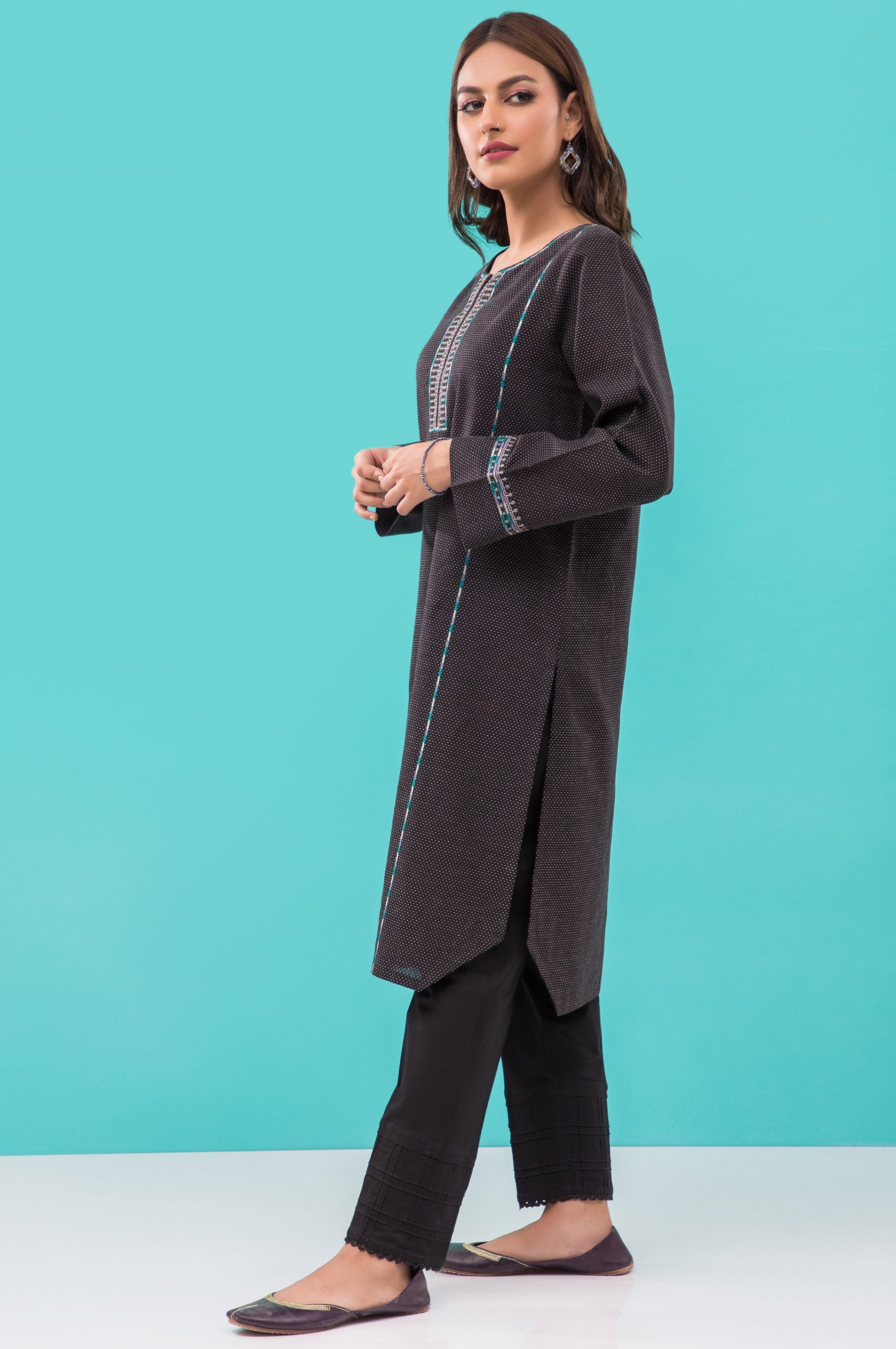 A perfect kurta with white polka dots, featuring delicate embroidery on neckline, front & sleeves. The diagonally stitched hemline gives this Kurta a trendy look.