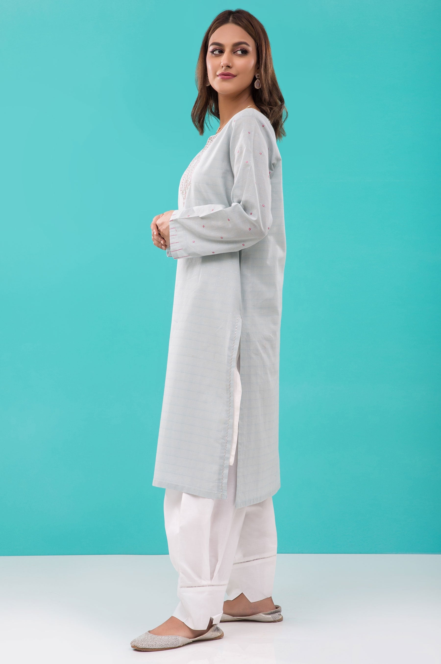 Delicately embroidered kurta on zari fabric is a perfect blend of style and comfort. A traditional neckline beautifully crafted with floral elements and enriched with a warm color palette. Sleeves are embroidered with a pretty booti and are detailed with contrasting top stitches on cuffs to further enhance the ethereal look.