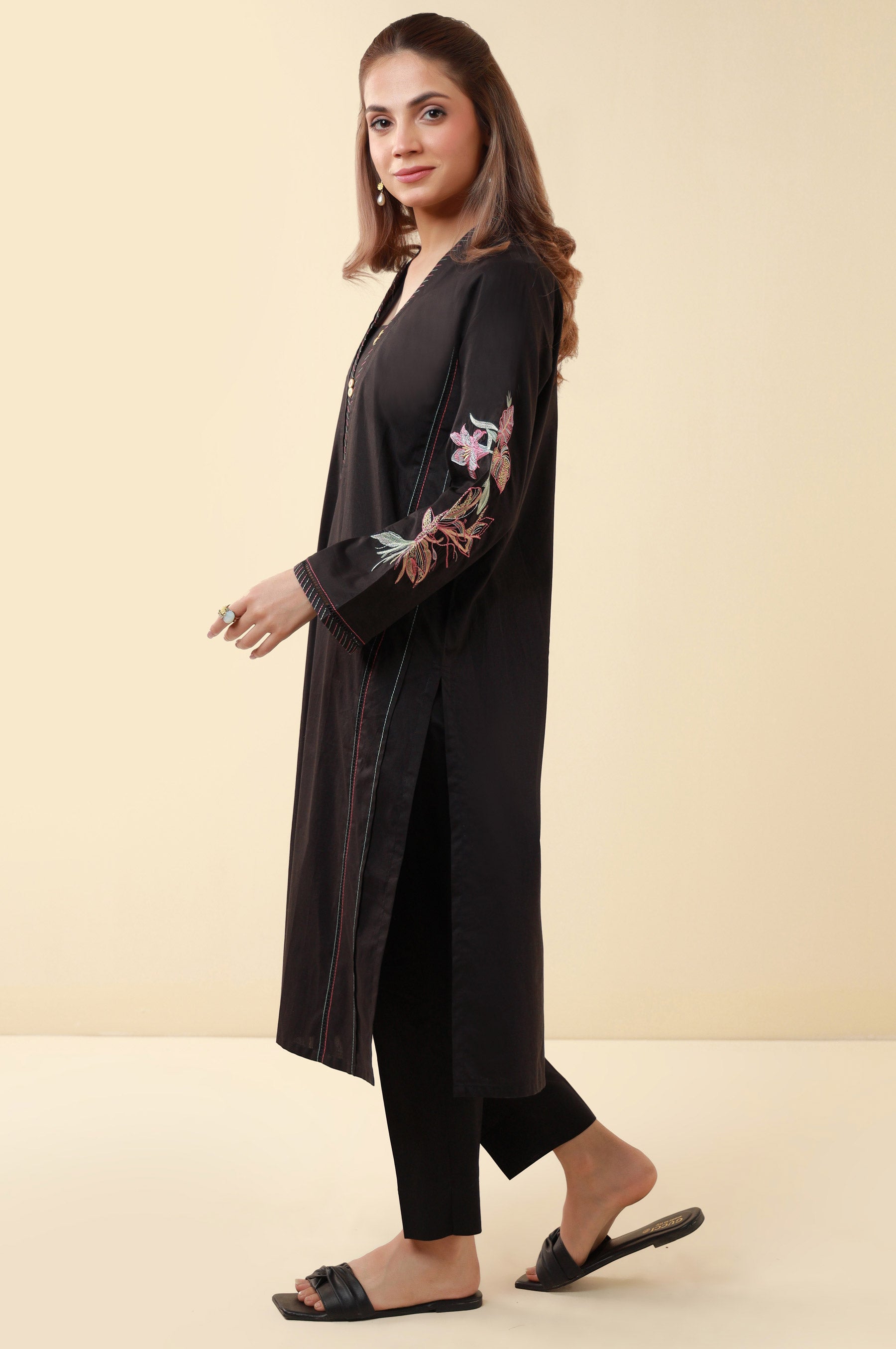 This stitched 1 piece embroidered tencel shirt is a perfect blend of elegance and comfort. This shirt is crafted from high-quality Tencel fabric, ensuring a luxurious feel. The black color adorned with the intricate Hibiscus design inspiration adds a touch of sophistication. The embroidery detailing and China Placket with Embellishment enhance its overall appeal.