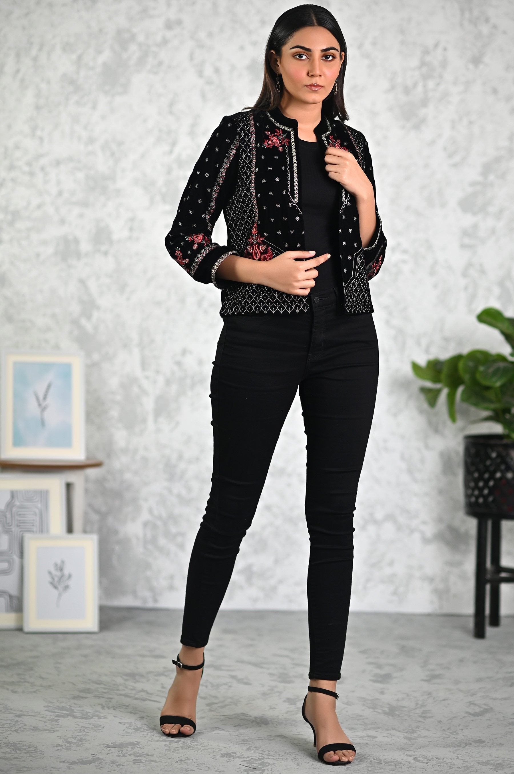 Stitched 1 Piece Embroidered Short Velvet Jacket