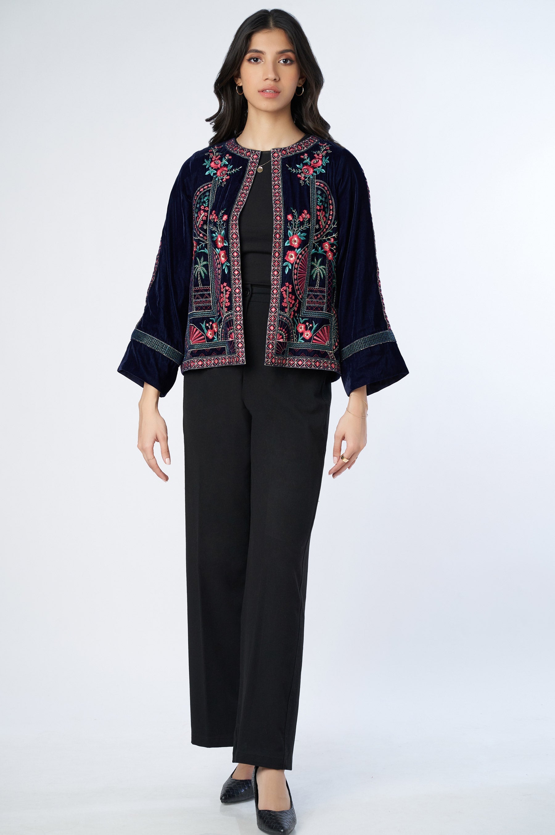 Be stylish from head to toe in this blue velvet jacket beautifully composed with Japanese inspired colorful embroidery. This can be style as western or eastern both.