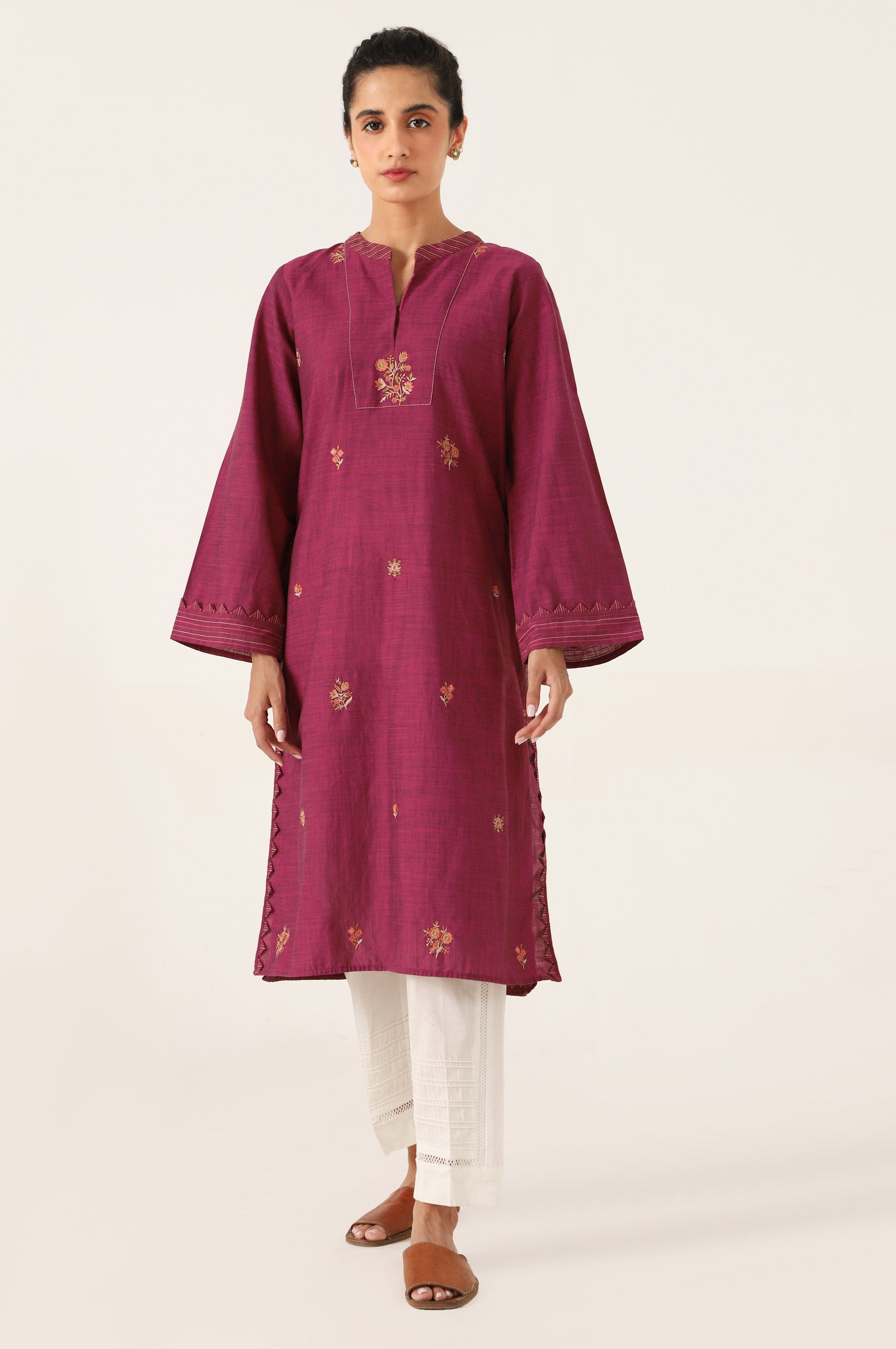 trendy composition is portrayed on this ensemble rendered in a classy magenta color. Enriched with intricate floral embroidery at front in appealing colors. Look gorgeous this season in this fascinating outfit.