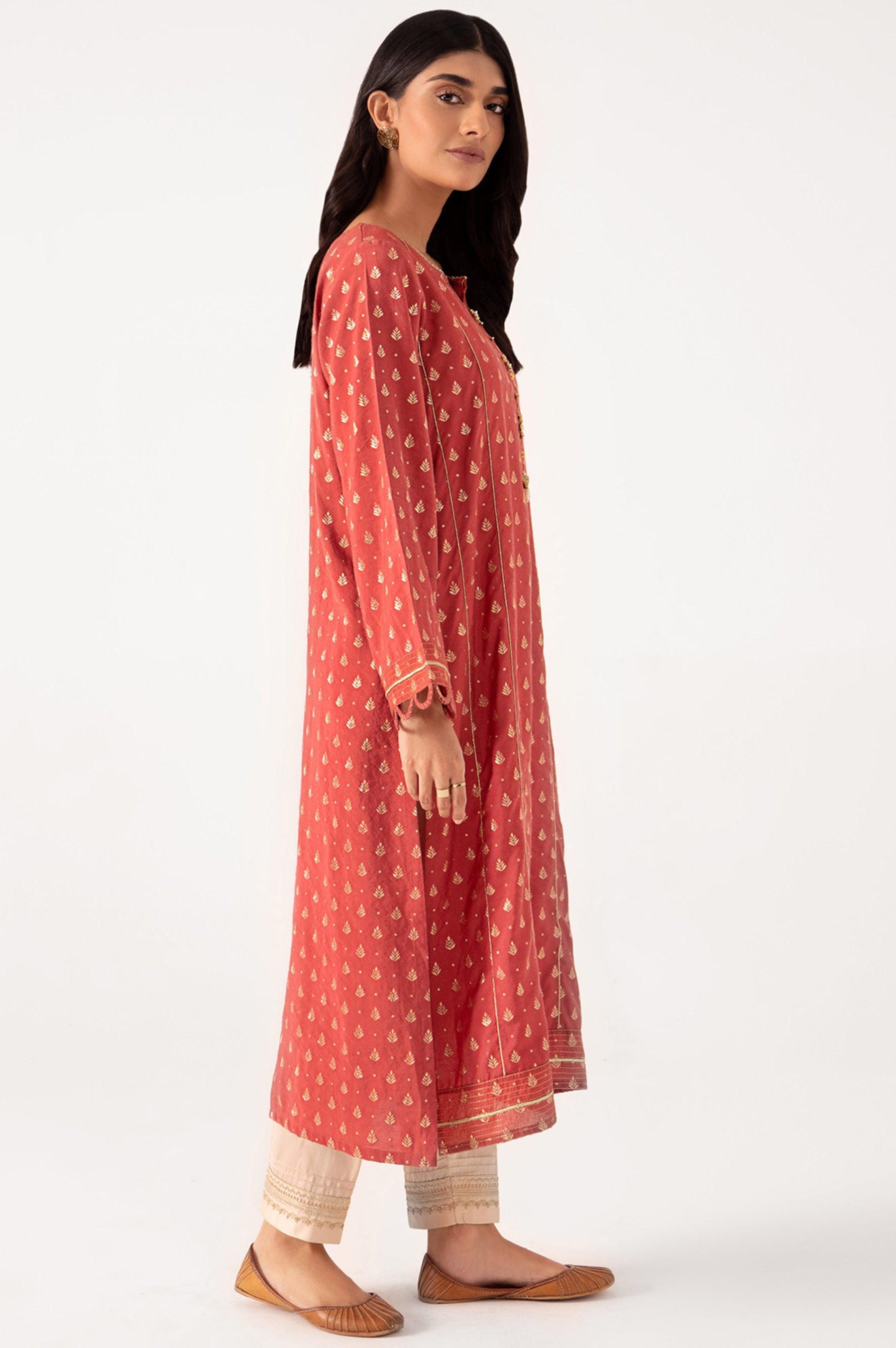 This Jacquard Kurta with lorex features zari woven floral pattern crafted with gotta detailing in a harmony to create a look that is exuberant yet timelessly elegant. This kurti can be stylized with our off-white pants and culottes.
