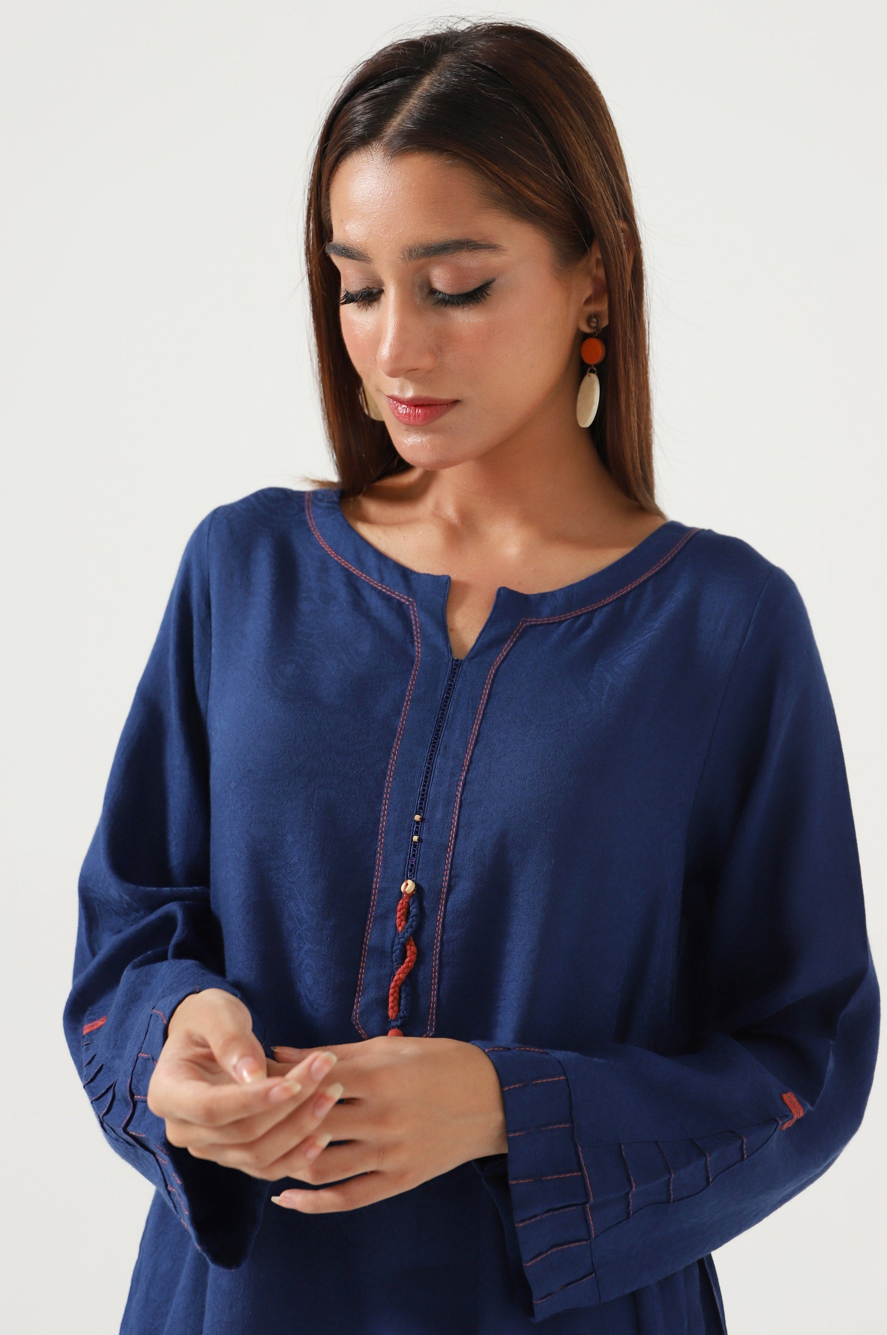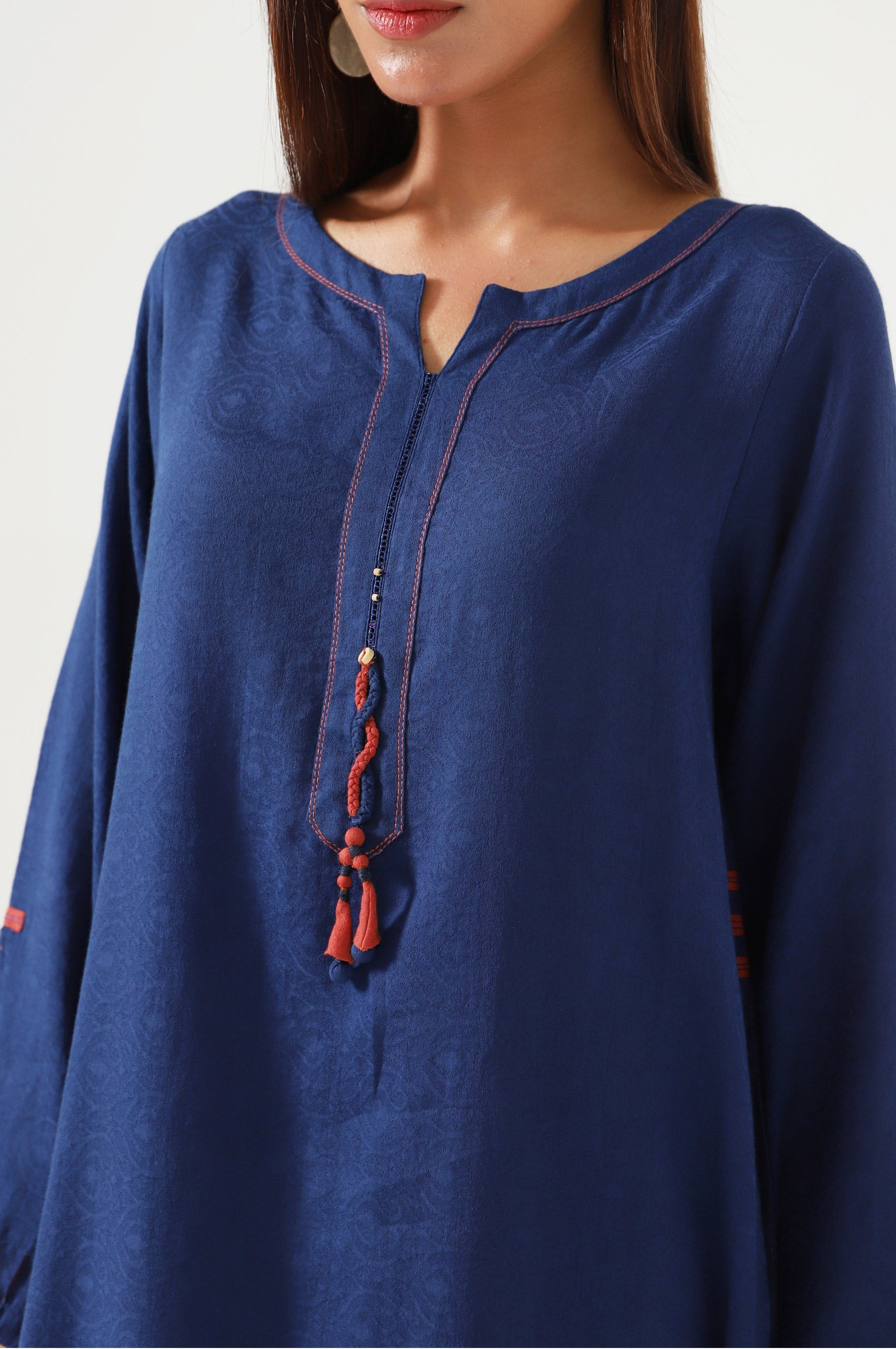 Lift up your everyday wear by simpply adding blue stylized outfit with modish tassle. The smart cut on sides and contrast pintex detailing will enchant your wardrobe in the up coming season.