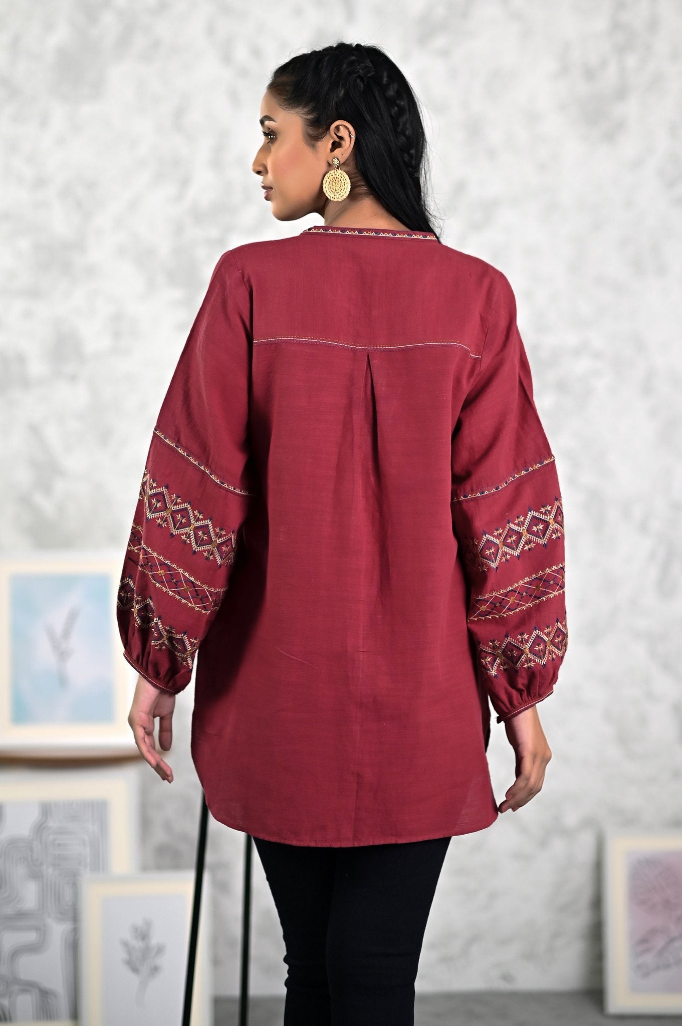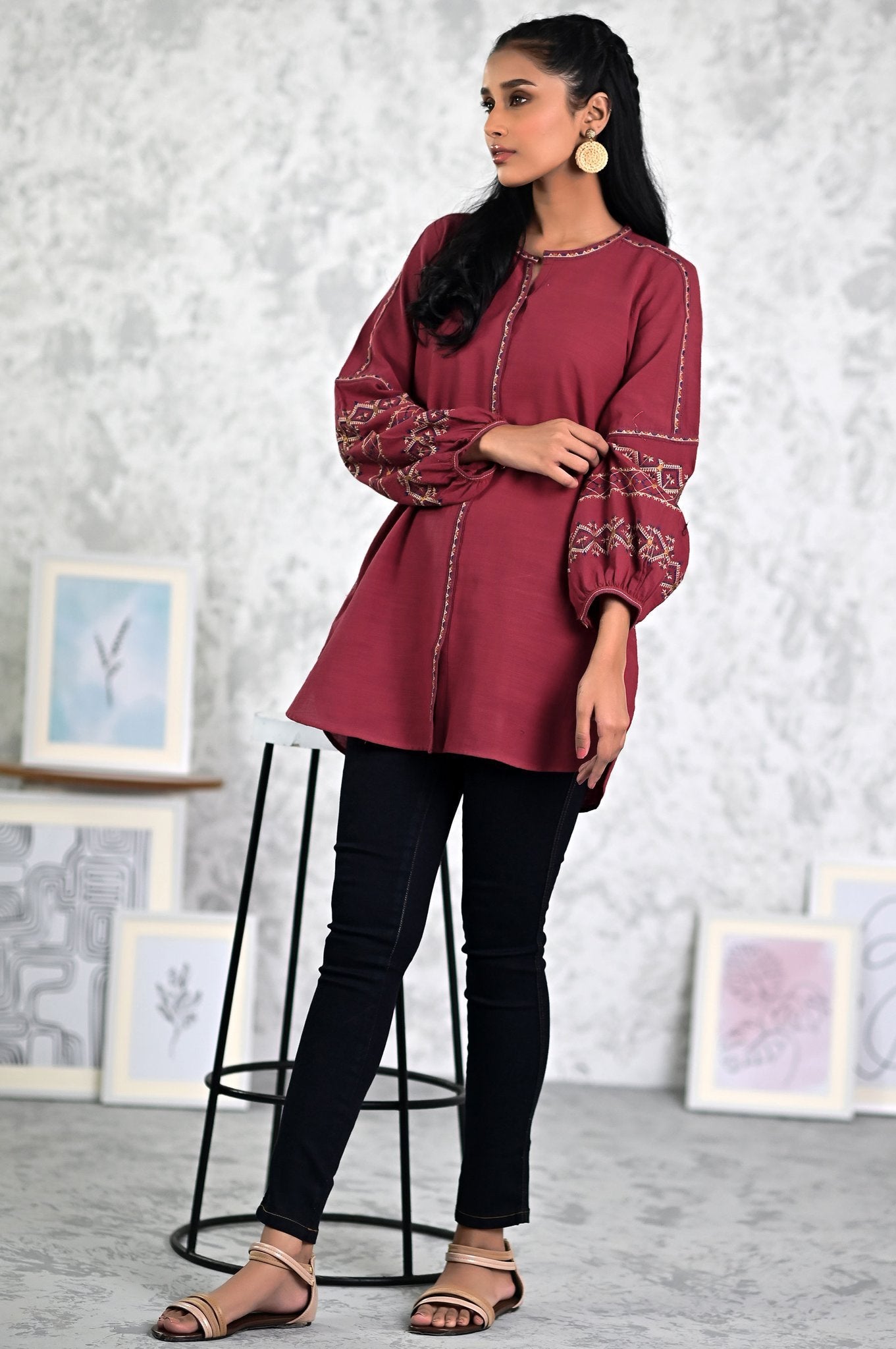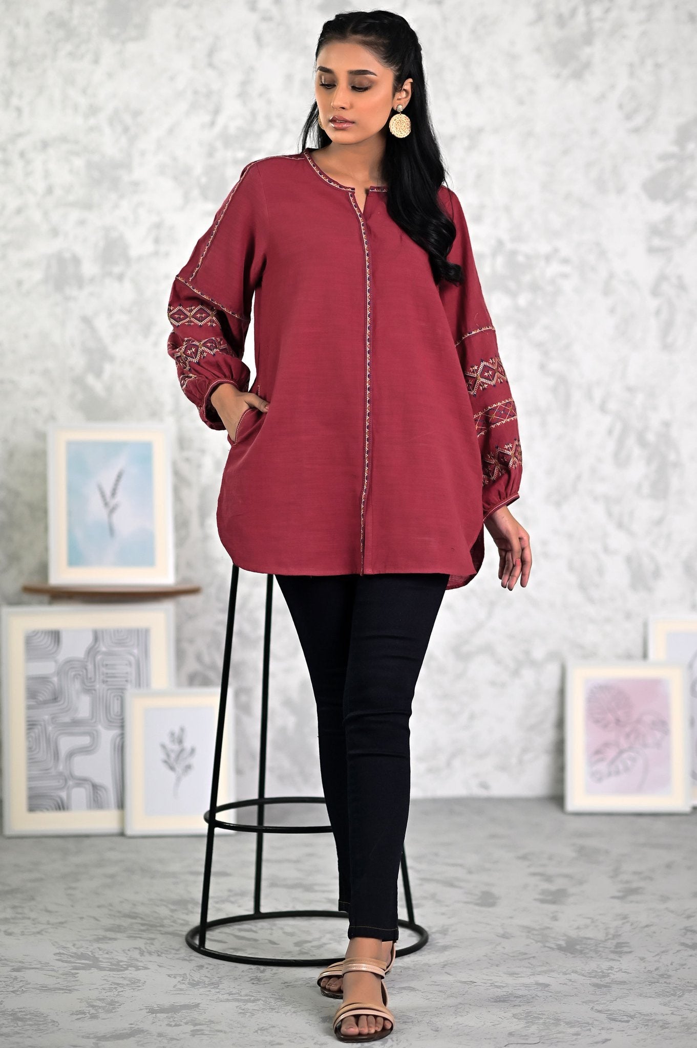 This band collar khaddar fusion top with Aztec inspired embroidery is perfect for your winter coffee meetup. The embroidery on sleeves and front placket compliments the round daman. Pair it with Denim in Zeen bottom collection.