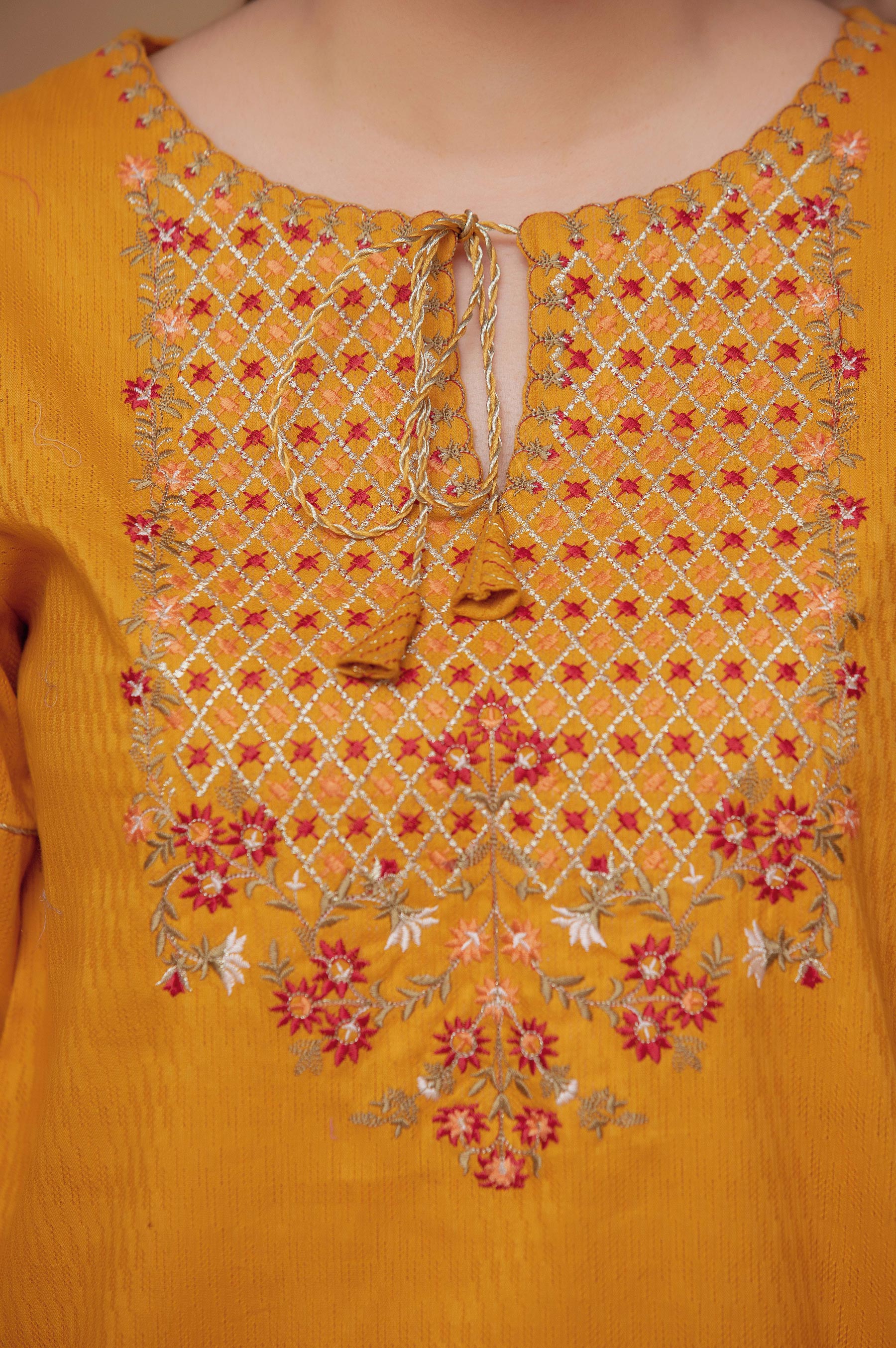 This Ochre colored tarkashi shirt has traditional embroidered neckline yet it is styled to keep you in spotlight with the play of charma, colored stitches on sleeves and a hint of embroidery on hemline.