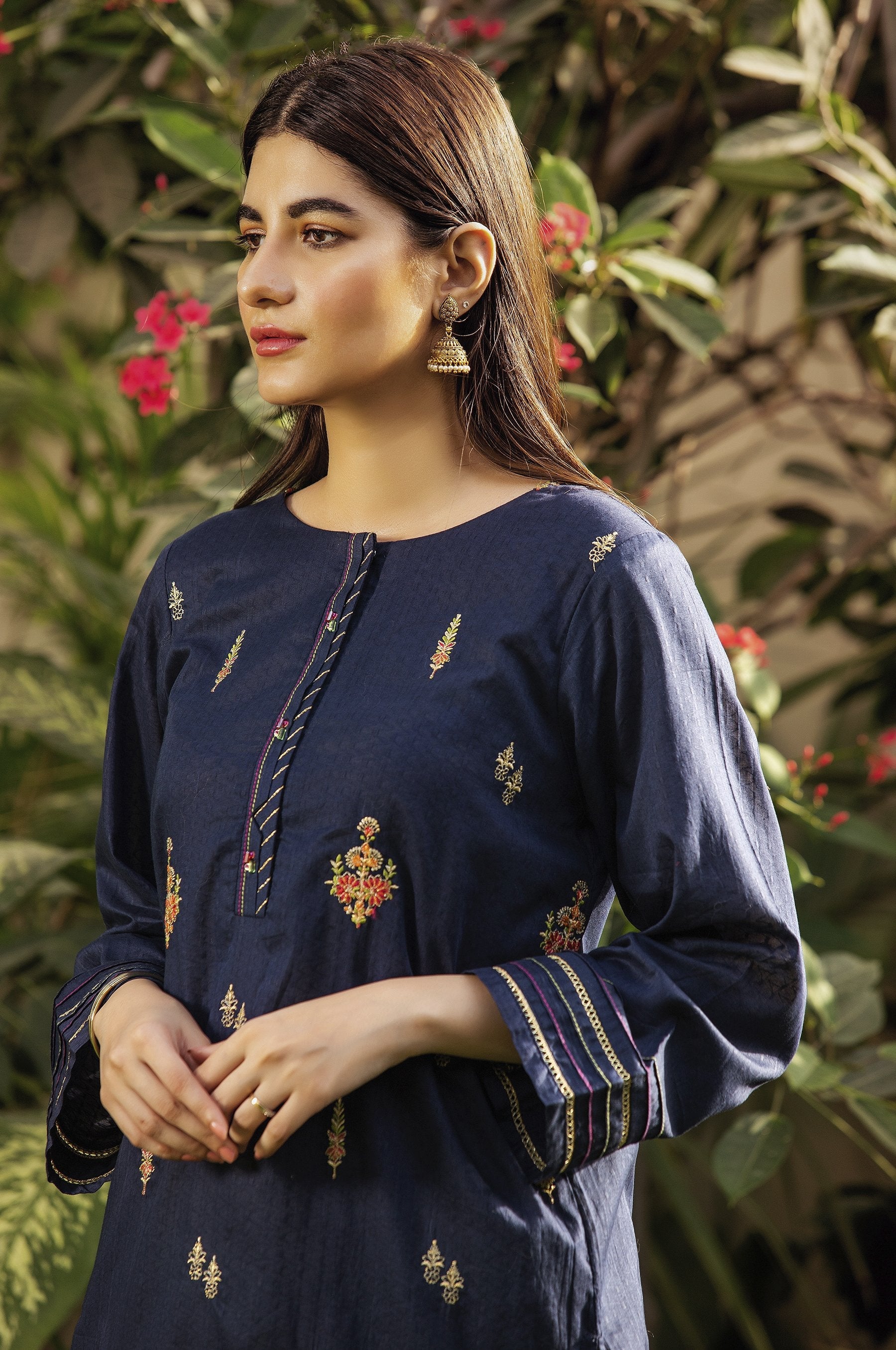This Prussian Blue shirt is adorned with Indian embroidered motifs detailed with Golden Zari laces and crystals, making it a perfect festive wear. Perfect for your day and night plans.