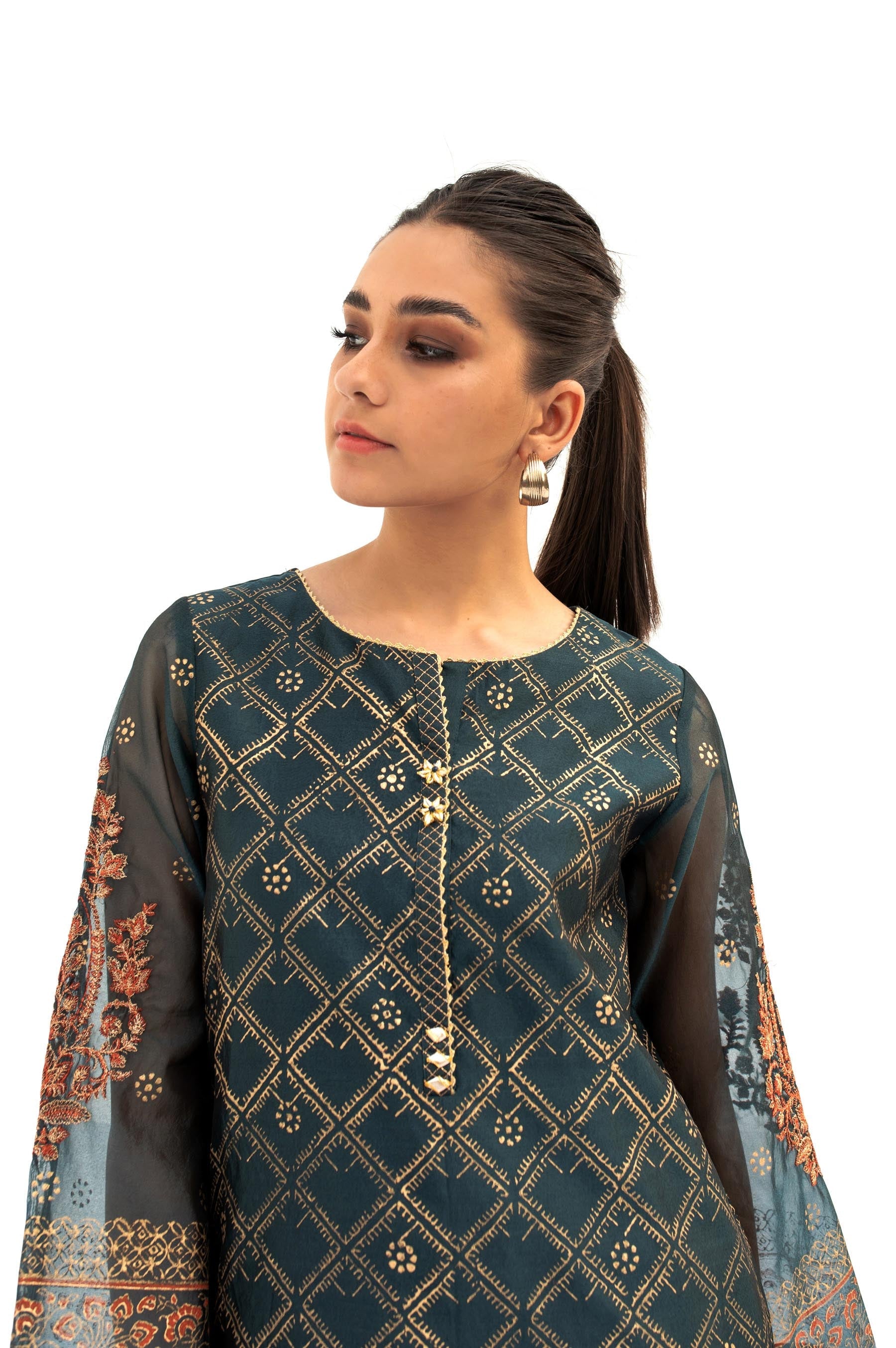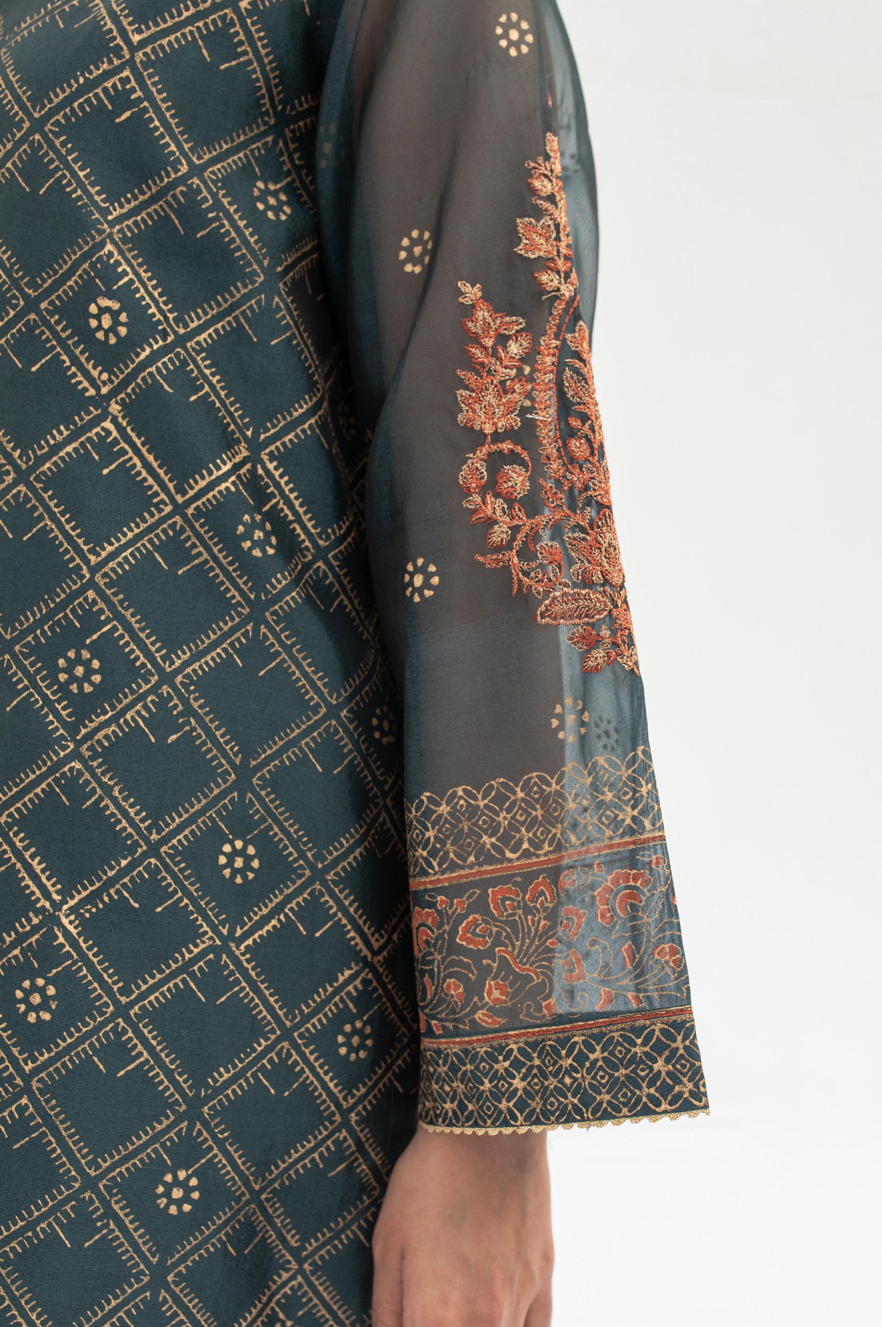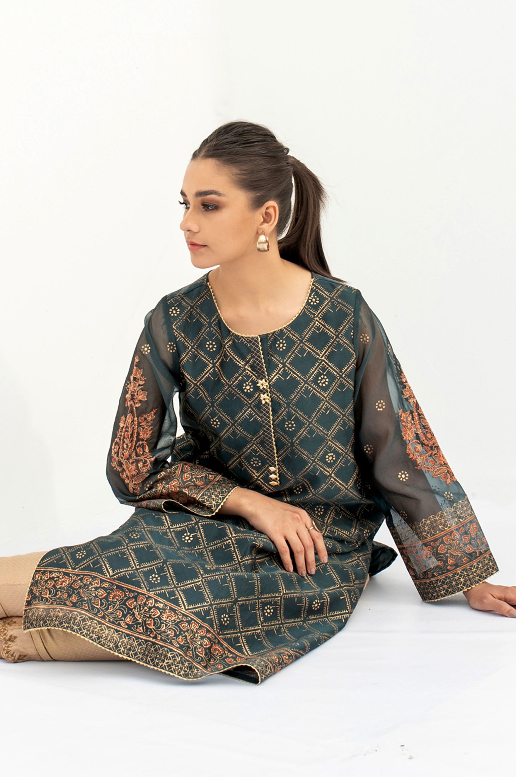 Achieve dreamy perfection with this beautiful paneled embIn a charming teal color, this gorgeous 1pc shirt features traditional block print all over,highlighted with embroidered sleeves, pair it up with jhumkas and glam it up this wedding seasonroidered long shirt, richly embellished with laces and buttons to enhance the look.