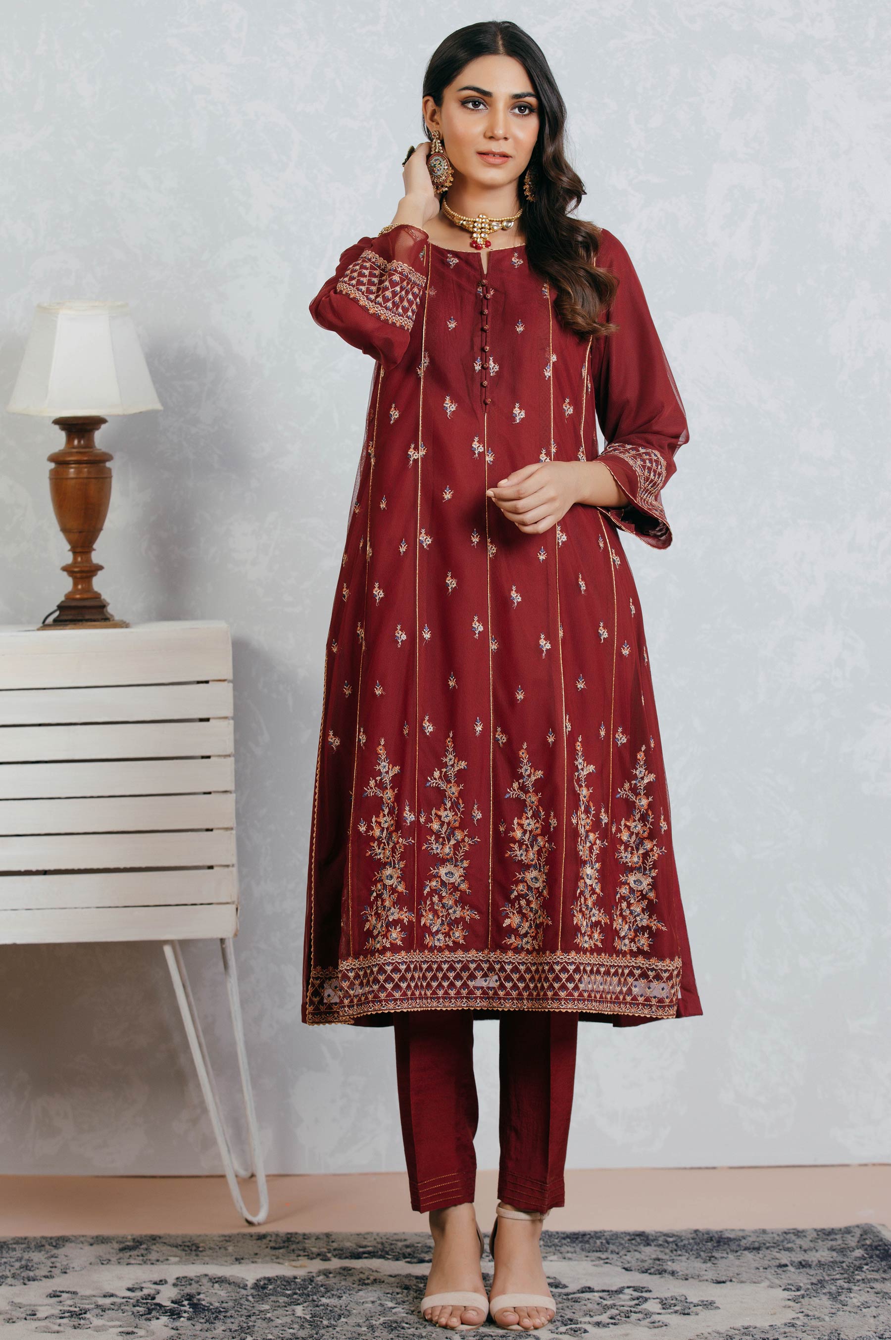 Achieve dreamy perfection with this beautiful paneled embroideredlong shirt, richly embellished with laces and buttons to enhance the look..
