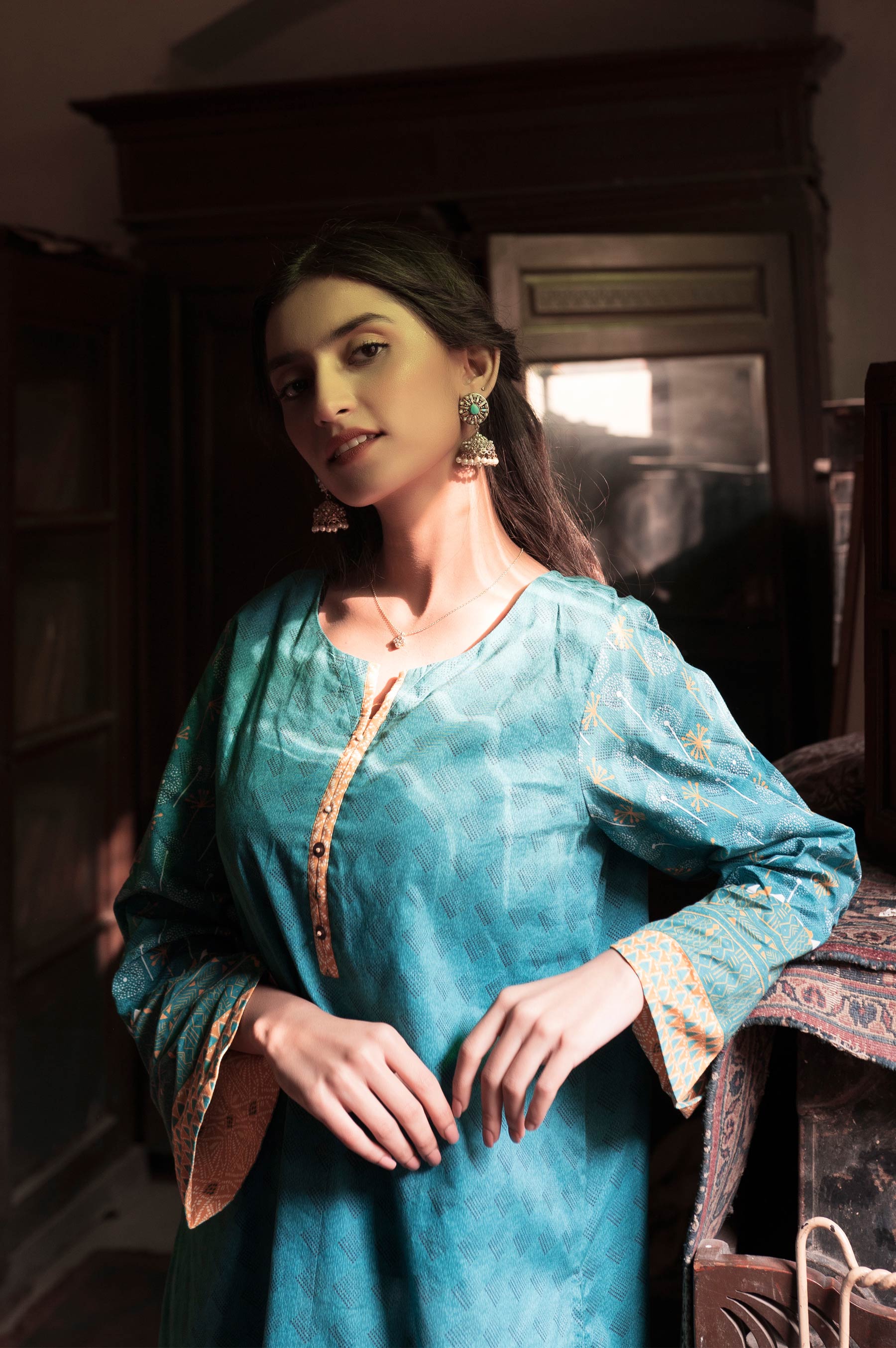Creating a minimalistic feel through self texture and Ukraine motifs with contesting trims.